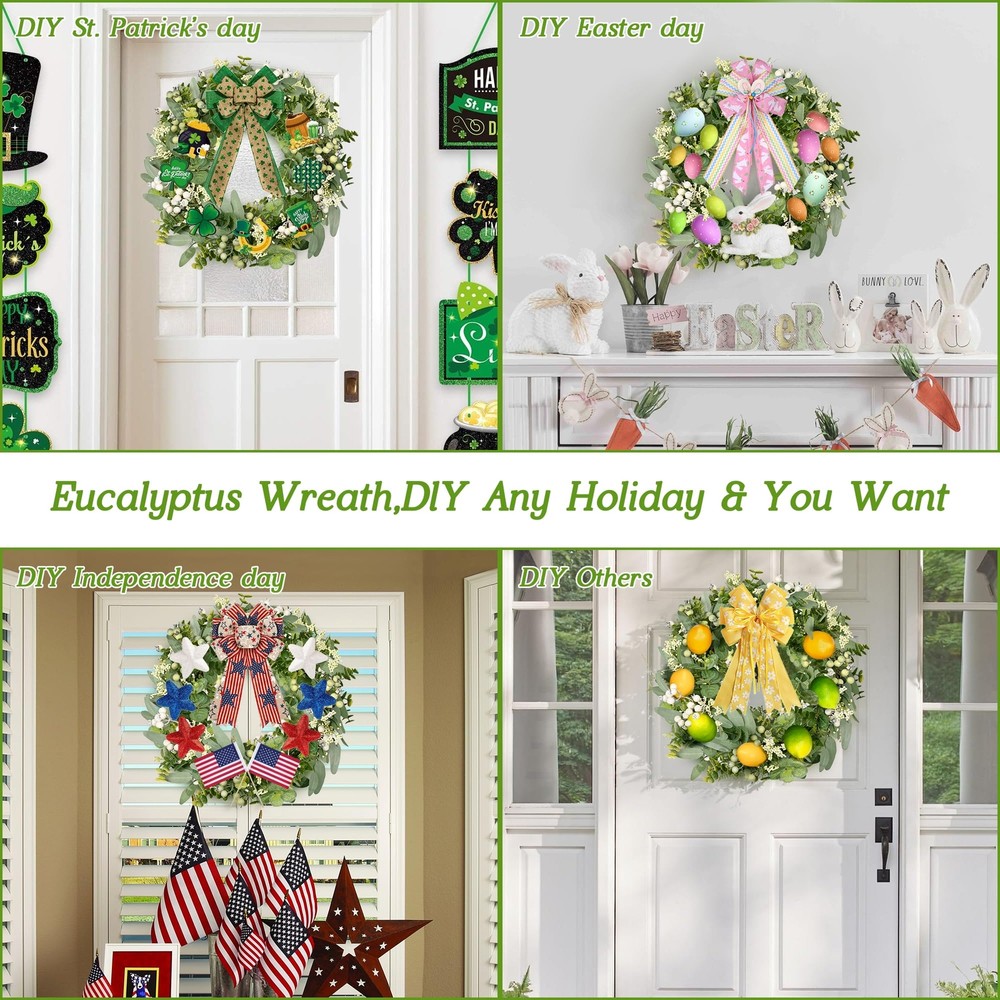 Features: 【All year round wreath】Available all year round:spring, summer, fall, and winter. Add themed decorations according to the festival, this is a flexible and versatile wreath. 【Full and realistic】Handmade green eucalyptus wreath features eucalyptus leaves, boxwood, white/green berries, andmany small berries embellishedon it, making the wreath full, natural and realistic. Its elegance add a vibrant and pleasant vibe to your home. 【Perfect Size】 This spring wreath is 19/20 inches in diameter. Each rustic farmhouse eucalyptus wreath is packed in a sturdy and exquisite box, suitable as a gift for friends. Note that because the wreath is compressed by the box to avoid being damaged during delivery, please fully stretch it to reach its maximum size. 【Versatile】This gorgeous wreath is a versatile decoration. It is suitable for all seasons of the year, spring, summer, fall and winter. You can add elements from each season, such as bells and pinecones, to turn it into a Christmas wreath. When you design it yourself, you will find that your wreath is the most unique scenery. It can be hung on the wall, front door, porch, bedroom, living room, etc. It is perfect for indoor and outdoor, weddings and parties. It's elegance is sure to impress your family and friends. 【Durable】Made of high-quality materials. Colors will never fade; leaves will never fall; berries will never rot. No watering and special cleaning required. Can be used for years to come. 【Christmas Wreaths】This eucalyptus wreath with berries can be turned into a Christmas wreath by tying a red bow, pairing it with pinecones, bells, and some red berries. It will stay with you all winter long. Specifications: Color - Green Material - Artificial Greenery Mounting Type - Door Mount Shape - Round Product Dimensions - 19"D x 19"W x 4"H//20"D x 20"W x 4"H Special Feature - Handmade, High-quality Materials, Long-lasting, Indoor/Outdoor Use Package List: 1PC