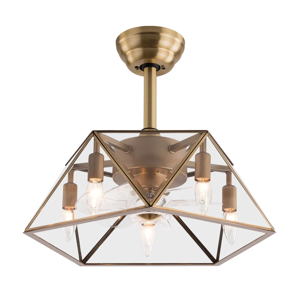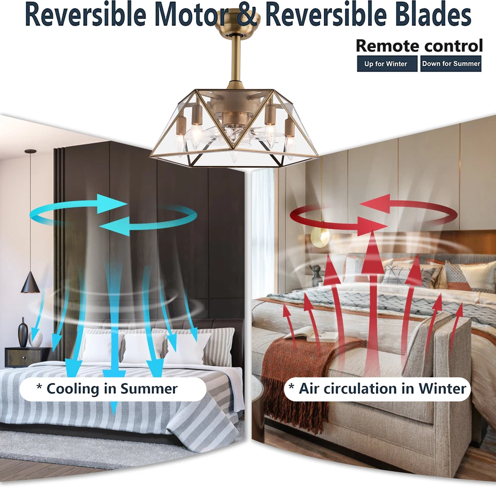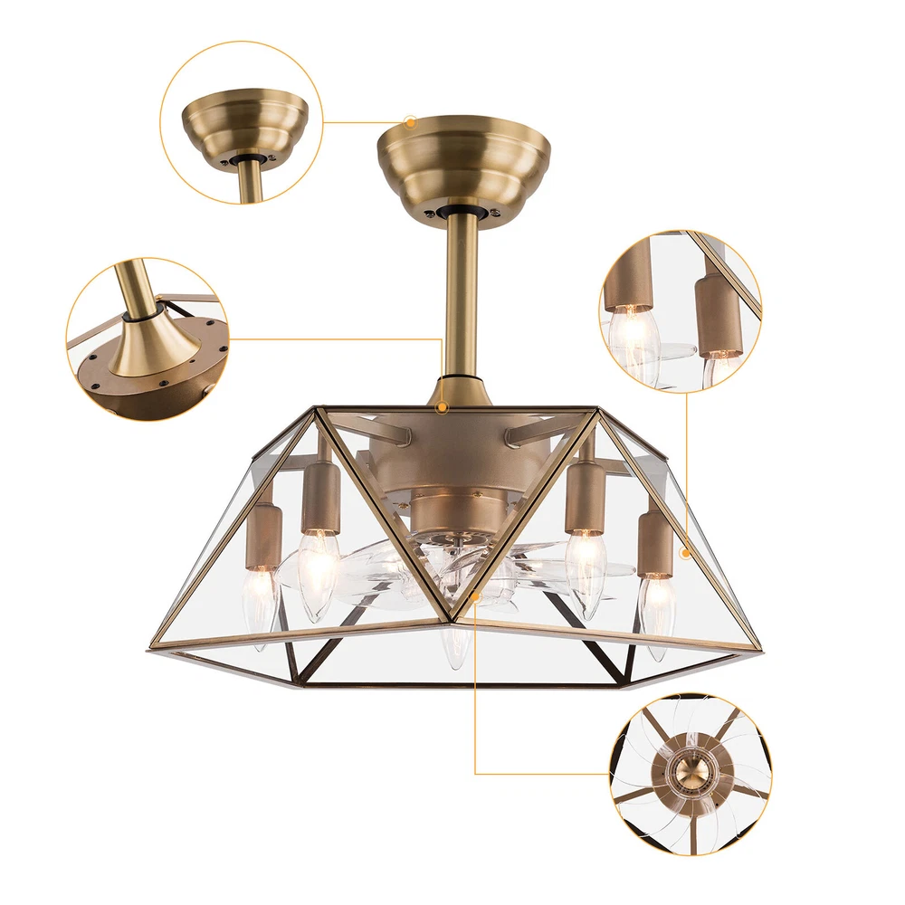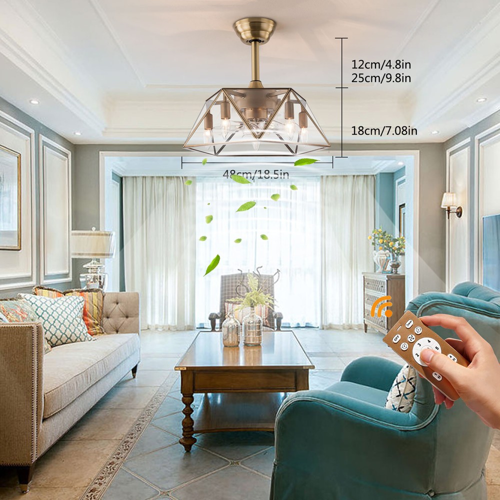 Description This 2-in-1 ceiling fan light allows you to feel the bright light and enjoy the coolness at the same time. It has six gears of wind speeds with a timing function to meet your daily usage needs. It can be integrated with different decoration styles and is ideal to create an excellent life and sleep environment to accompany you in all seasons. Key Features Stylish Exterior: The cylindrical lampshade, retro color scheme (Gold), and delicate lines make it very luxurious, and the water ripples on the tempered glass look like a flowing lake. It can be a good decorative piece to blend in with different decor styles and add color to your room. Great Durability: The lampshade is made of high-quality copper with a soldering process and tempered glass with high transparency, w Industrial Caged Ceiling Fan W/ Lights Farmhouse Ceiling Fan With Remote &Timing Description This 2-in-1 ceiling fan light allows you to feel the bright light and enjoy the coolness at the same time. It has six gears of wind speeds with a timing function to meet your daily usage needs. It can be integrated with different decoration styles and is ideal to create an excellent life and sleep environment to accompany you in all seasons. Key Features Stylish Exterior: The cylindrical lampshade, retro color scheme (Gold), and delicate lines make it very luxurious, and the water ripples on the tempered glass look like a flowing lake. It can be a good decorative piece to blend in with different decor styles and add color to your room. Great Durability : The lampshade is made of high-quality copper with a s oldering process and tempered glass with high transparency, which is heat-resistant , strong, durable, and not easy to deform. The fan blades are made of ABS, which has high strength, good toughness, and good formability, which can ensure a smooth surface and good gloss. High Safety: It is enclosed with 7 ABS blades hidden in the cage to avoid an accident caused by getting involved in the blades, so it's much safer than traditional fans to protect your family away from the fan blade's danger. 2-in-1 Function: The ceiling fan light has the function of fanning and lighting. It can not only illuminate you but also reduce heat, which can save you a lot of space. Adjustable Speed&Working Time: It has 6 gears of wind speed and you can choose low speed to enjoy the comfortable breeze or high speed to cool down quickly. Meanwhile, You can control its working hours in advance (1/2/4 hour), which can bring you great convenience. Easy to Clean : The smooth and flat shell, as well as the detachable fan blades, make this product easy to clean. You only need to clean it with a dry cloth, saving you lots of time and effort. Details Remote Control: It allows you to remotely control the timing, wind speed, etc, saving you lots of effort. Down Rods: This product is equipped with two down-rods with different lengths for different ceiling heights. Pure Copper Motor: It has stable performance, low-temperature rise, and low noise(About 40dB), providing a quiet working and sleeping environment. Meanwhile, there are a lot of heat dissipation holes on the motor shell, which can provide a good heat dissipation effect to ensure the stable operation and long service life of the motor. Application It is suitable for the living room, dining room, kitchen, study bedroom, small bedroom, conference room, and other places of 10-15㎡/107-161ft². Specifications Color: Gold Material: Copper, Tempered Glass, ABS Surface Treatment: Solder Process Style: Retro Motor Type: Pure Copper&Reversible Motor Number of Fan Blades: 7 Mounting Type: Ceiling Mount Rated Voltage: 85-265V Rated Power: 40W Power Source: DC Wind Speed Gears: 6 Timing: 1/2/4h Bulb Size: 5*E26/E27 (Not Included) Suitable Area: 10-15㎡/107-161ft² Electric Fan Design: Ceiling Fan Room Type: Bedroom, Living Room, Dining Room, Living Room, Kitchen Controller Type: Frequency Conversion Remote Control Efficiency: E Noise: About 40dB Base Diameter: 15cm/5.9inch Lampshade Size(L*H): 48*18cm/18.5*7.08inch Down-rod Length: 12cm/4.8inch, 25cm/9.8inch Package Included 1 * Ceiling Fan Light 1 *English Manual 1* Remote Control 1* 23A Battery All Accessories for Assembly Notes Please cut off the power supply when cleaning. The remote control is powered by a 23A battery (Included). Please note that the wall switch can only turn on the light or turn off the main power, and the ceiling fan can only be controlled by the remote control. This product does not include a light bulb. Please prepare five E26/E27 (Not Included) in advance. Please read the manual completely before installation and use, and pay particular attention to the safety instructions included. Please allow the slight color difference caused by the shooting light and 1-3cm error due to manual measurement, and make sure you do not mind before you order. Payment Delivery details Terms of sales About us Contact us Payment We accept ebay payment 。 Fees such as import duties, taxes are not included in the item price or shipping costs. These charges are the buyer's responsibility. Delivery details Shipping: 2-9 working days to: USA Terms of sales We maintain high standards of excellence and strive for hundred percent customer satisfaction. Feedback is very important to us. We hope that you contact us immediately before you give neutral or negative feedback, so that we can address your concerns. It is impossible to address issues if we do not know about them! About us Your satis faction is our ultimate goal. We work hard to earn your trust and future business. Our certified technicians have tested each item before shipping. The unit comes with 1 year limited warranty on all manufacturing defects. a) If you receive a defective item, you may return it or ask for a discount. Please contact us within 14 days after you receive the package. b) What you returned must be intact and in its original packaging as re? u. Customer is responsible for shipping co
