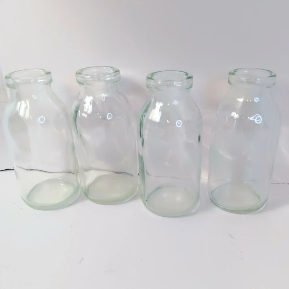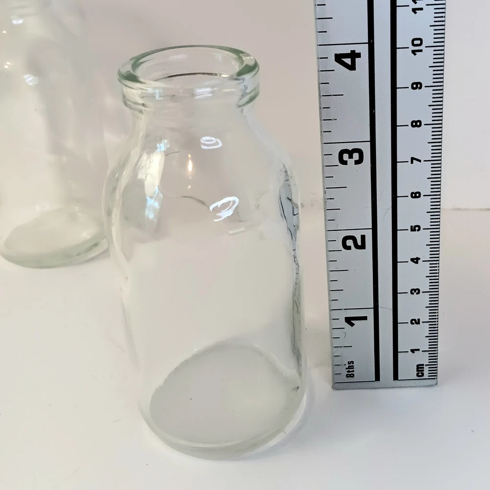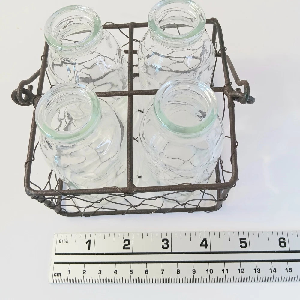 Farmhouse Metal Basket With Four Small Creamer Bottles Flower Vases Propagation Baset is approximately 5" Bottles are approximately 4" tall All Bottles and basket weigh approximately 1 lb Good condition. No chips or cracks. Bottles have a little cloudiness in the bottom and a little speck of debris in one bottle.