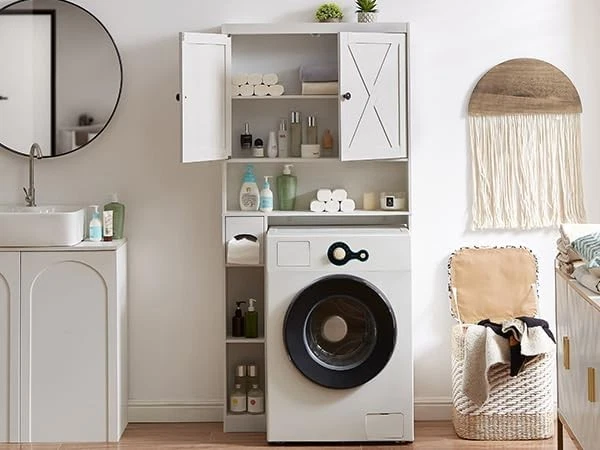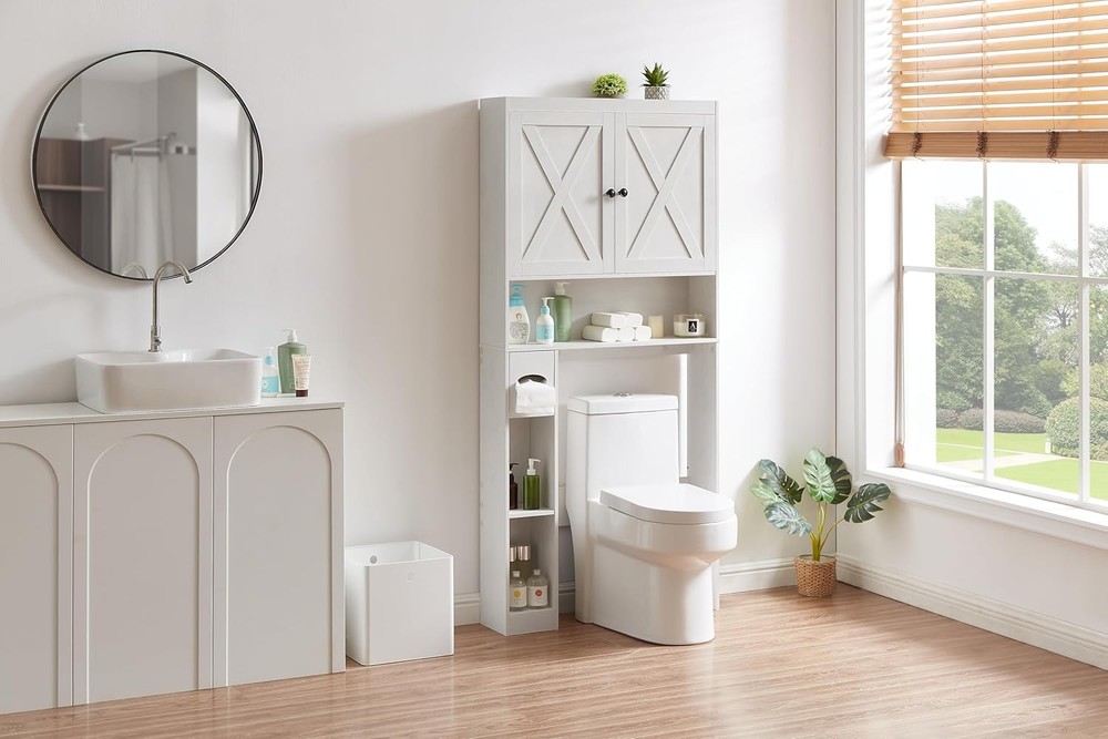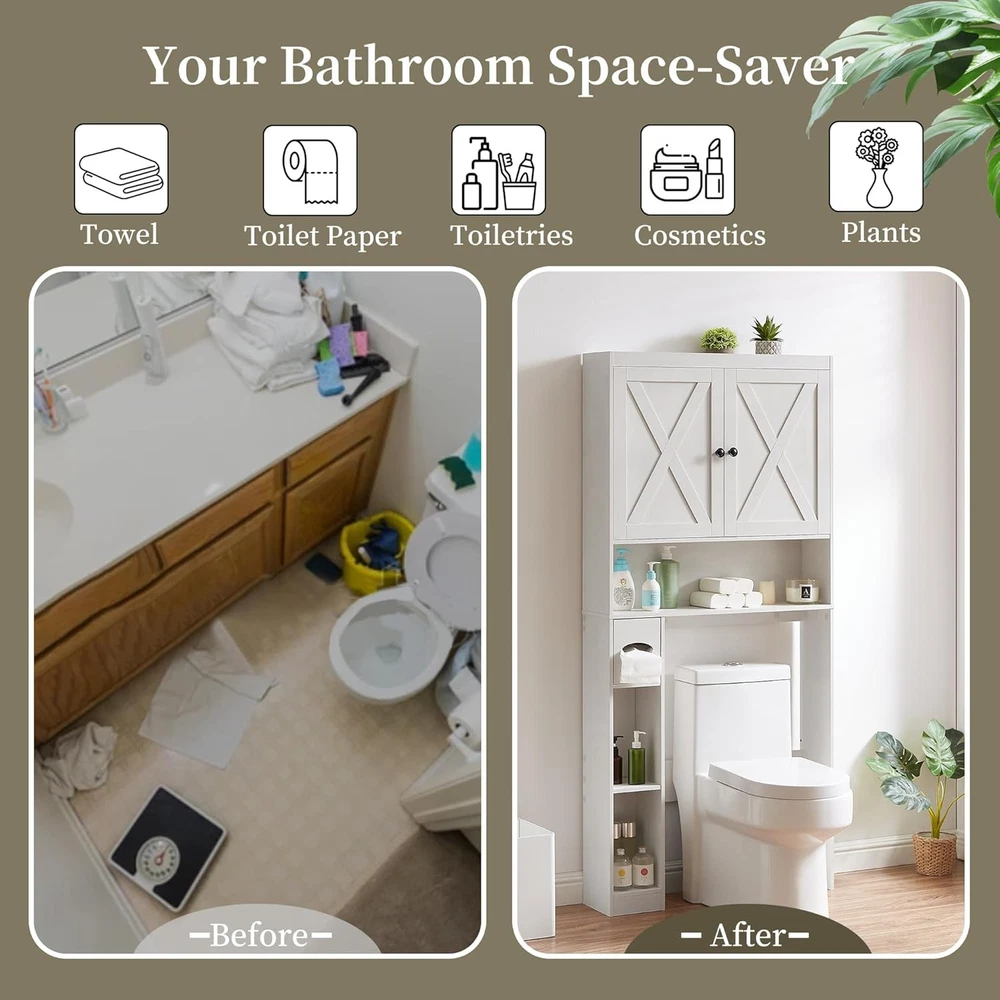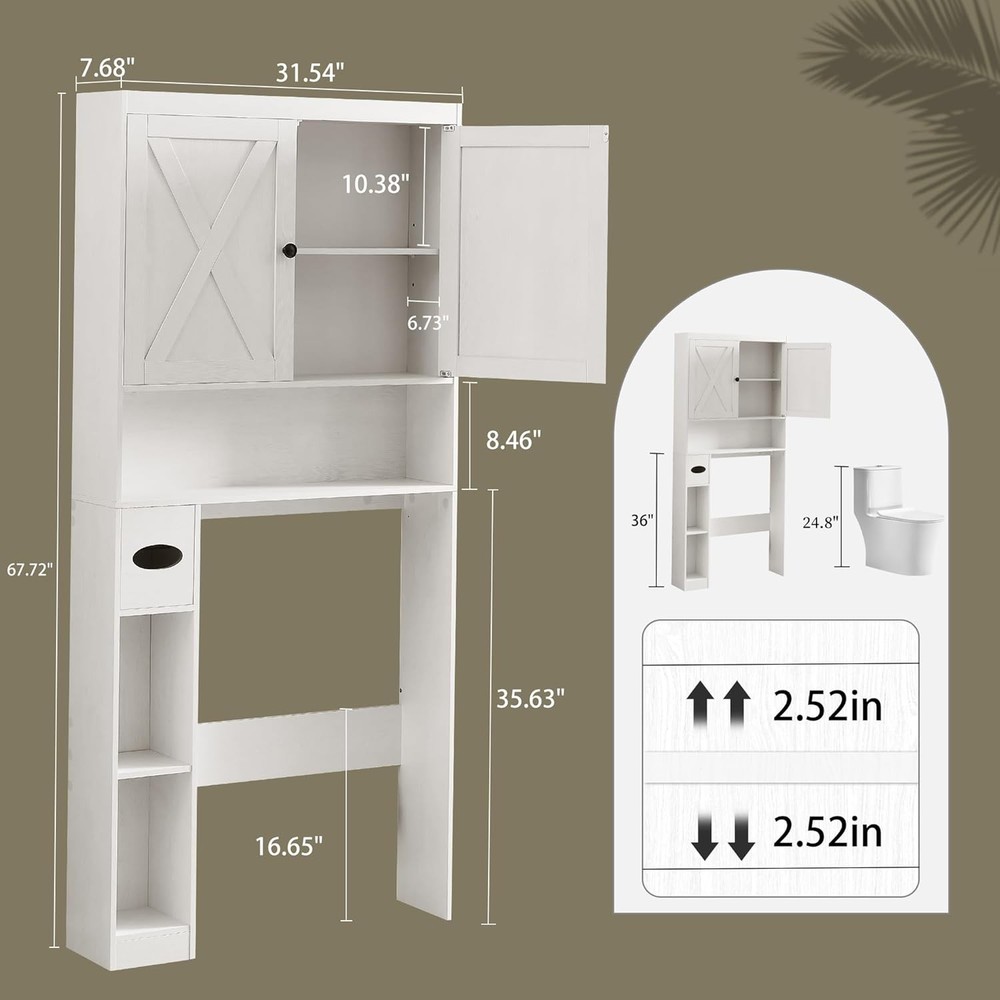 Product Description Over The Toilet Storage Cabinet, Farmhouse Storage Cabinet with 2 Barn Door Freestanding Space-Saving Bathroom Organizer with Adjustable Shelves & Toilet Paper Holder, for Bathroom, Restroom, Laundry About this item Rustic Double Barn Door Style – Classic farmhouse design with two barn doors adds warmth and character to any bathroom decor. Built-In Toilet Paper Holder – Convenient side-mounted toilet paper holder keeps essentials within easy reach and saves even more space. Space-Saving Over Toilet Cabinet – Turns unused wall space into practical storage for toiletries, extra rolls, and cleaning supplies. Strong & Stable Structure – Crafted from thick engineered wood for long-lasting durability, and designed to stay stable over your toilet. Fits Most Standard Toilets – Designed to fit above most toilets, perfect for apartments, homes, dorms, or small bathrooms.