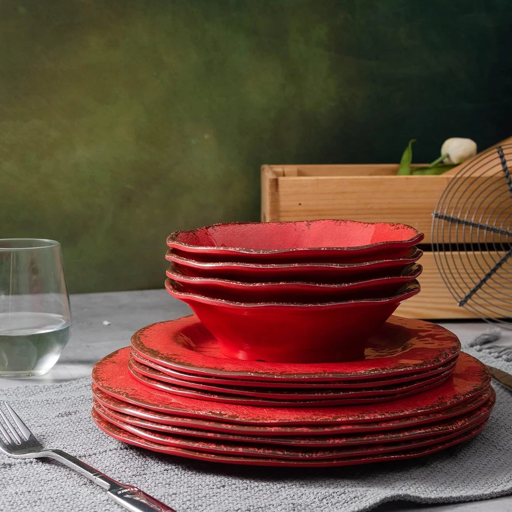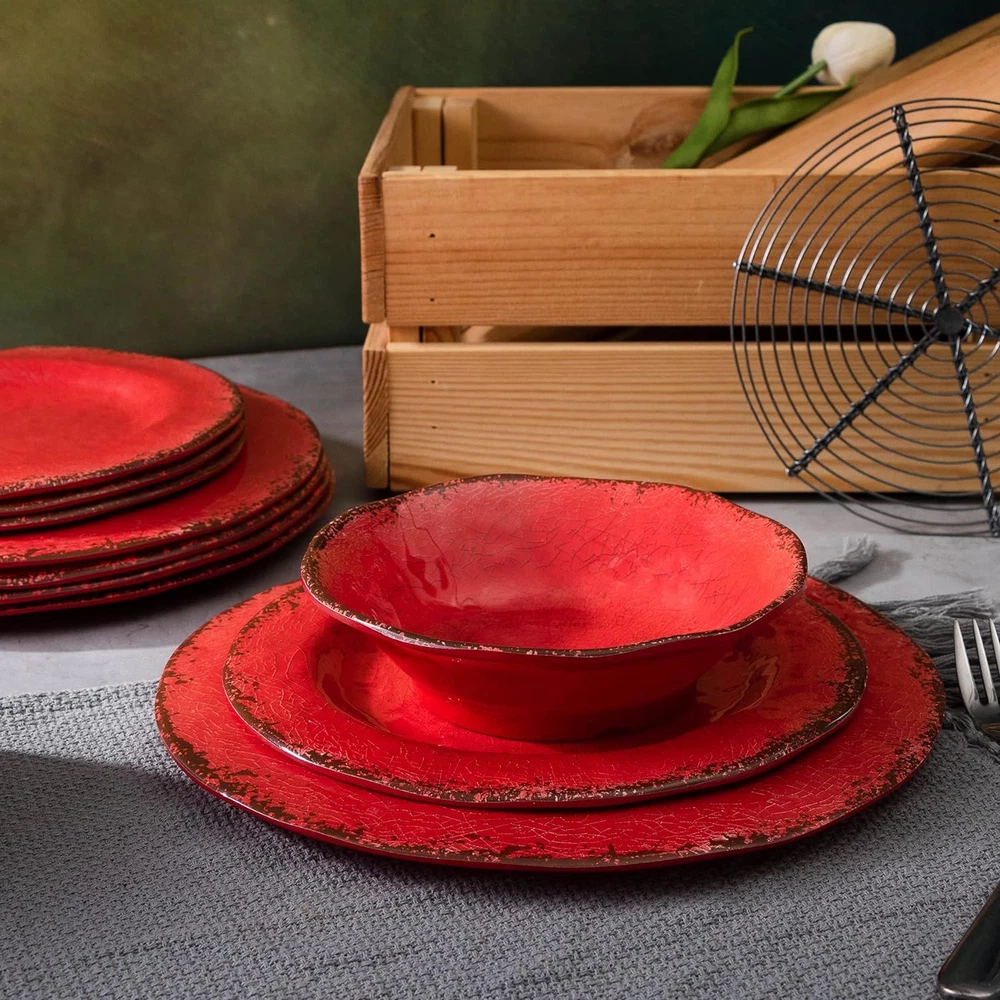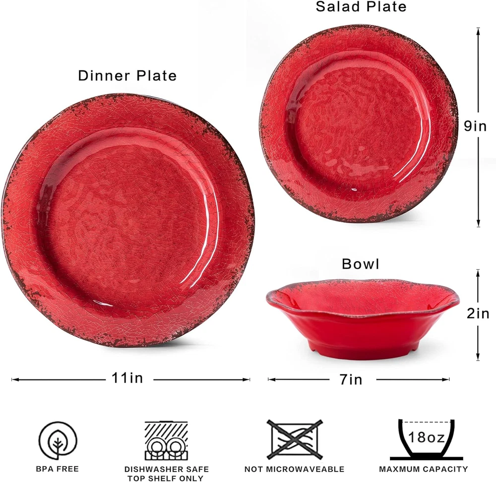 Farmhouse Plates and Bowls Set, 12 Piece Christmas Melamine Dinnerware Sets for 4,Lightweight and Unbreakable Dishes Set,Perfect for Indoor and Outdoor and Picnic Use. Red WHAT'S IN THE BOX: This 12-piece melamine dinnerware set includes 4 each of the following item: 11" dinner plate, 9" salad plate, 7" bowls, perfect for indoor and outdoor use USE and CARE INSTRUCTION: Please DO NOT use for MICROWAVE or OVEN, but this classic dinnerware set is easy to hand wash, dishwasher safe (top rack only), makes your life more convenient FOOD GRADE MATERIAL: This rustic dinnerware set made of 100% melamine, a kind of hard durable plastic, BPA free, safe for food use, chip and scratch resistant, more sturdy and weight lighter than ceramic INDOOR and OUTDOOR USE: This vintage dinnerware is perfect for indoor everyday dining and outdoors activities, take them to picnics, RVs, camping is light and don’t worry about damage when driving CONVENIENT and PRACTICAL: Technique design looks like crackle glaze, organic with rim shape style, deep enough for snack, salad, soup, pasta, fruits, cake, dessert etc. Product Description LEHAHA 12 Piece Melamine Dinnerware Set Vintage Melamine Dinnerware Set Our dinnerware set made of food grade 100% durable melamine which is BPA free and break-resistant, designed with crackle glazed decor and organic rustic rim shape, the high-quality melamine material provides a good feel, use them to accentuate your home decor and enjoy every meal with this mordern dinnerware set. Rustic Crackle Dinnerware Set This unbreakable and BPA free melamine dinnerware set is safe and reusable, a nice for paper or plastic plates for your family gatherings and outdoor dining; it has a ceramic feel but is non-breakable, chip-resistant and dishwasher safe makes your life more convenient, also great for the family with elderly and children. DINNERWARE SET INCLUDES: 4 x 11"DIA Dinner Plates 4 x 9"DIA Salad Plates 4 x 7"DIA, 2"high Bowls Specification: BPA free Lightweight Easy stack, Save space Easy to Clean, Dishwasher safe Break-resistant CONVENIENT and PRACTICAL DISHES SET Sapce Saving These lightweight and unbreakable plates and bowls are easy to stack to save kitchen space for you Easy to Clean This crackle dinnerware set can be used in the TOP SHELF of dishwashers, the shine stays after several cleaning, makes your life more convenient, please DO NOT use for MICROWAVE or OVEN Perfect for Indoor or Outdoor Dining Perfect for indoor everyday dining and outdoor activities such as parties, BBQs, Poolsides, Picnic, RVs, camping, cabins, and you don’t have to worry about breakage while driving or falling Rustic Crackle design and Amazing colors Teal Plates and Bowls Grey Plates and Bowls Red Plates and Bowls White Plates and Bowls Pink Plates and Bowls Yellow Plates and Bowls Orange Plates and Bowls Blue Plates and Bowls Add to Cart Add to Cart Add to Cart Add to Cart Add to Cart Add to Cart Customer Reviews 4.6 out of 5 stars 105 4.8 out of 5 stars 39 4.4 out of 5 stars 92 4.6 out of 5 stars 105 4.4 out of 5 stars 92 4.7 out of 5 stars 97 Price $27.99 $ 27 . 99 $29.99 $ 29 . 99 $49.99 $ 49 . 99 $24.39 $ 24 . 39 $41.99 $ 41 . 99 $45.99 $ 45 . 99 Material Melamine Melamine Melamine Melamine Bamboo Fiber Melamine BPA Free ✓ ✓ ✓ ✓ ✓ ✓ Dishwasher Safe ✓ ✓ ✓ ✓ ✓ ✓ What's In The Box 2 Piece Serving Platters Set of 2 6 x dinner plates, 6 x salad plates, 6 x bowls 2 Pieces Grill Prep Tray 4 x dinner plates, 4 x salad plates, 4 x bowls 4 x dinner plates, 4 x salad plates, 4 x bowls Item model number 12-21E000 Shape Organic Is Dishwasher Safe Yes Color Red Pattern crackle Country of Origin China Item Weight 4.99 pounds Material Melamine Occasion Everyday,Daily Use Material Type Free BPA Free Collection Name All Is Microwaveable No Finish Type 风化 Product Dimensions 11 x 11 x 0.75 inches Product Care Instructions DO NOT USE IN Microwave and Oven, Dishwasher Safe Shipping Fast shipping is very important for us. Our standard US shipping service is FREE. Your order will be shipped within 2-3 business days upon full payment received. Your order will be delivered within 2-3 business days after the handling time. We only ship to the confirmed PayPal address. We reserve the right to cancel any order for any reason at any time. We are not responsible for undeliverable addresses. Returns and payment We offer a 30 days return policy from checkout winning date. We allow only PayPal as payment method FeedBack Your feedback very important to us, after you get your package and you are satisfied with our service please leave us positive feedback If you have any problem with your order / any questions please before leave any type of feedback For any questions, using eBay contact system Please visit our eBay store to check out other items for sale! Thank you for shopping at our store.