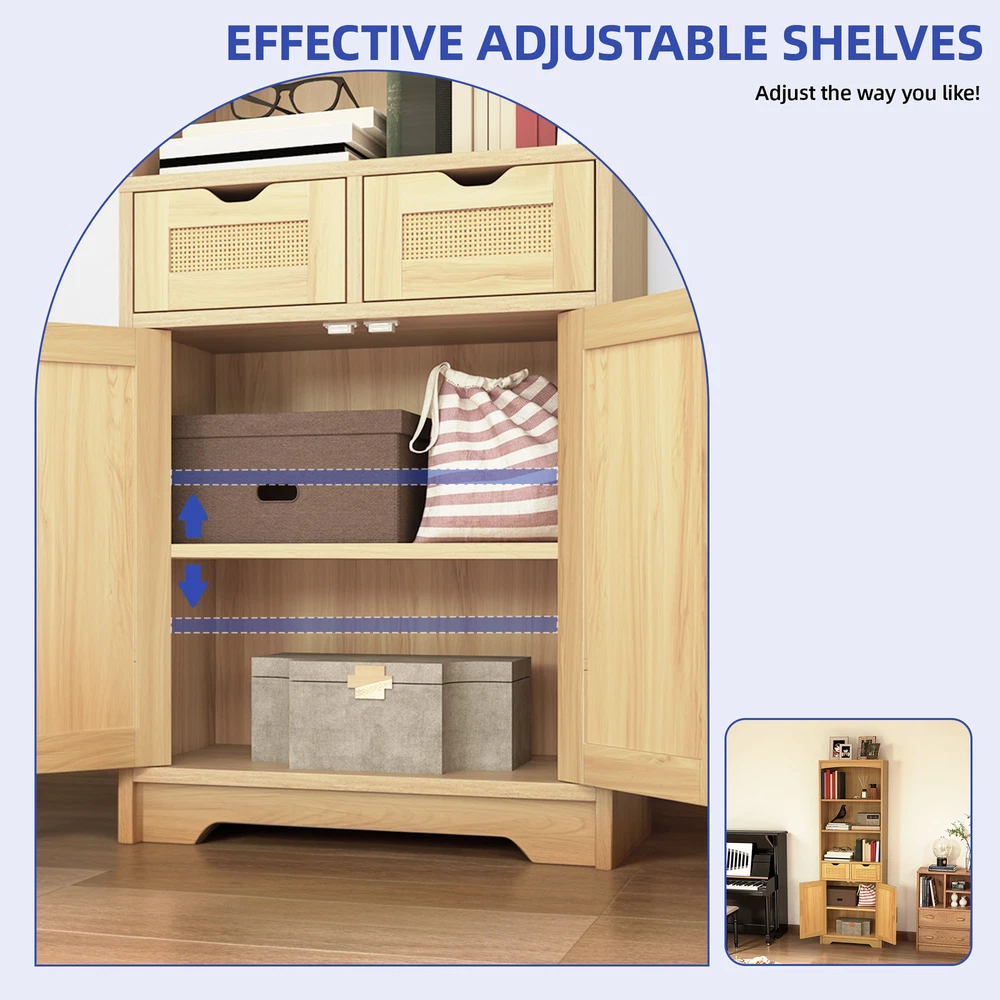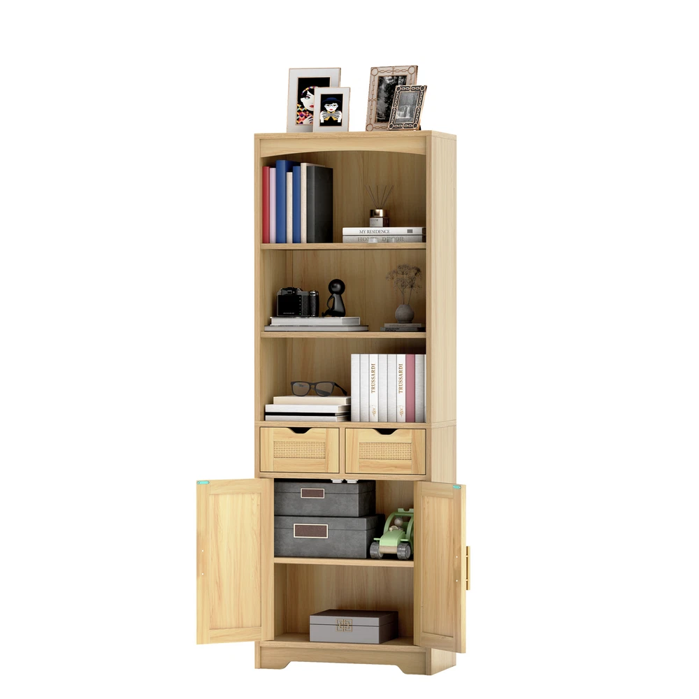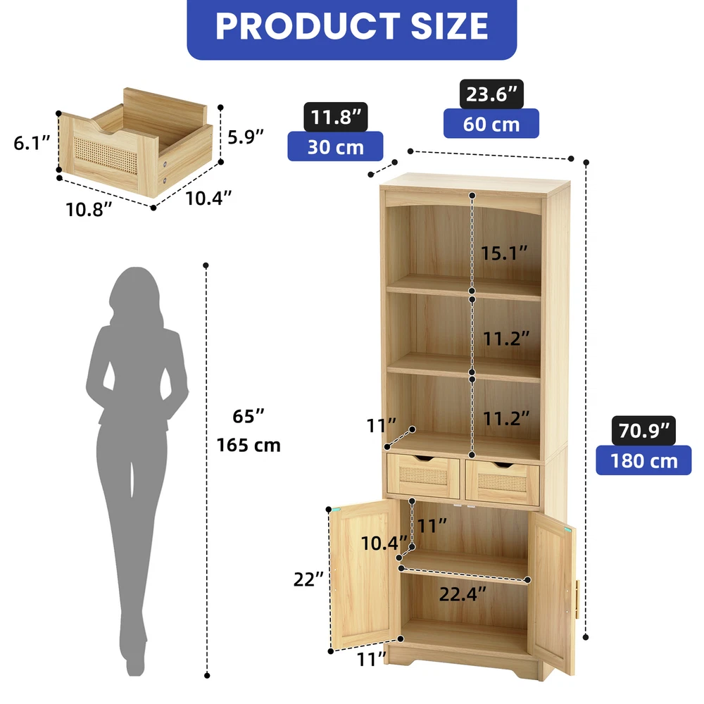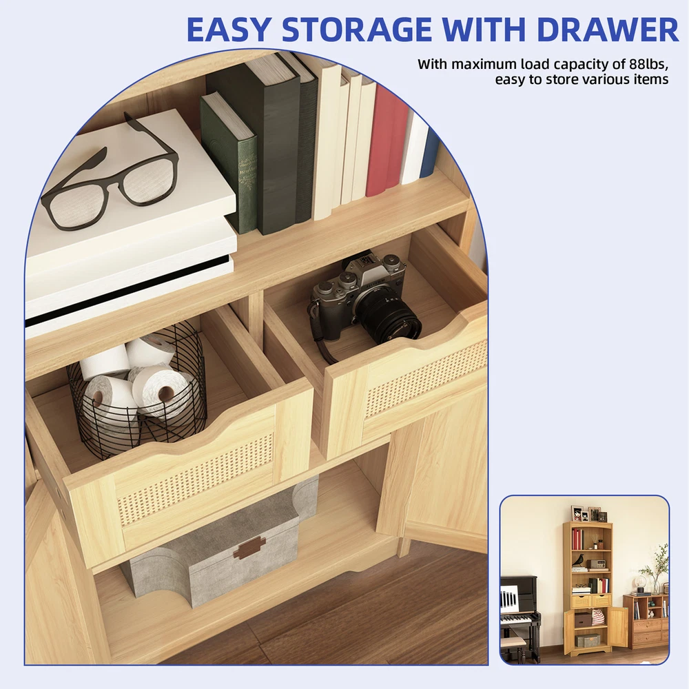 5 Tier Bookshelf Wood Bookcase Display Rack & Drawer Storage Cabinet w/ 2 Doors Product Description NOTE: Professional Installation would be Highly Recommended. Description: 1. Material: Particle Board, PVC, Rattan 2. Color: Natural Wood 3. Shape: Rectangle 4. Special Design: Cabinet with Doors, Drawers, Adjustable Shelves, Magnet Doors 5. Suitable for: Office, Home, Bedroom, Living Room Features: 1. Elegant & Durable Construction: Crafted from high-quality particle board, PVC, and handwoven natural rattan, this cabinet combines sturdiness with an organic, breathable design. The smooth, natural wood finish adds warmth and sophistication to any room. 2. Spacious & Versatile Storage: Designed with a perfect balance of closed and open storage, featuring cabinet doors, smooth-gliding drawers, and adjustable shelves. Ideal for organizing books, decor, linens, office supplies, or household essentials while keeping your space clutter-free. 3. Timeless & Multi-Purpose Design: A stylish fusion of modern, bohemian, and rustic aesthetics, this rattan cabinet complements various home décor styles. Perfect for use in offices, bedrooms, living rooms, or entryways, seamlessly blending functionality with beauty. 4. User-Friendly & Secure Features: Thoughtfully designed with magnet doors for firm yet quiet closure, ergonomic handles for effortless access, and adjustable shelves that adapt to different storage needs. The sturdy legs provide enhanced stability, ensuring long-lasting durability. 5. Easy Assembly & Low Maintenance: Comes with a complete set of fittings and a detailed instruction manual for a hassle-free setup. The smooth PVC surface resists stains and scratches, making cleaning effortless—just wipe with a damp cloth for a fresh, polished look. Dimensions: 1. Product Dimensions: 23.6"L x 11.8"W x 70.9"H 2. Product Weight: 74.9 lbs Package Included: 1. 1 x Bookshelf 2. 1 x Set of Fittings 3. 1 x Instruction Manual Shipping 1. Normally the item will be dipatched within 1 business day if payment is cleared before 12pm PST. 2. Please verify the correct shipping address in your PayPal account before making the payment. We only dispatch the item to the address that is sent to us at the time of checkout. 3. We don't ship to Hawaii, Alaska, Puerto Rico, APO/FPO/PO Boxes. 4. We don't provide local pick-up service. 5. Normally we will use USPS, UPS, FedEx & LTL to dispatch items. Payment 1. We accept PayPal and credit card. 2. We will ship to the confirmed Paypal shipping address that is provided with the payment only. Return 1. 30 days Money Back Guarantee. 2. Please contact our customer service to receive a RMA form first if want to return the item. 3. All returned items MUST in new condition with the original package. Contact If has any problem, please contact us by sending an ebay message. Our customer service will resolve the problem as soon as possible. On Feb 10, 2025 at 03:39:42 PST, seller added the following information: