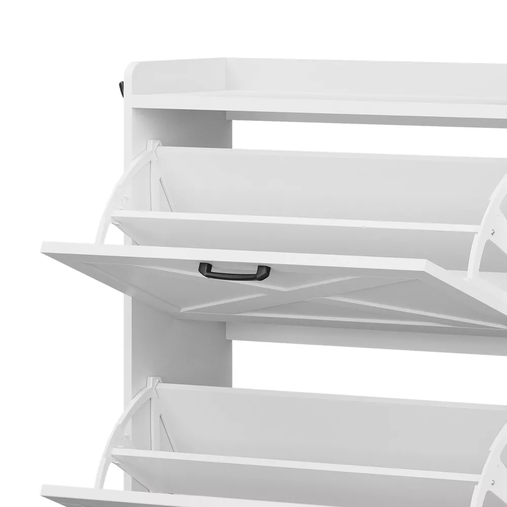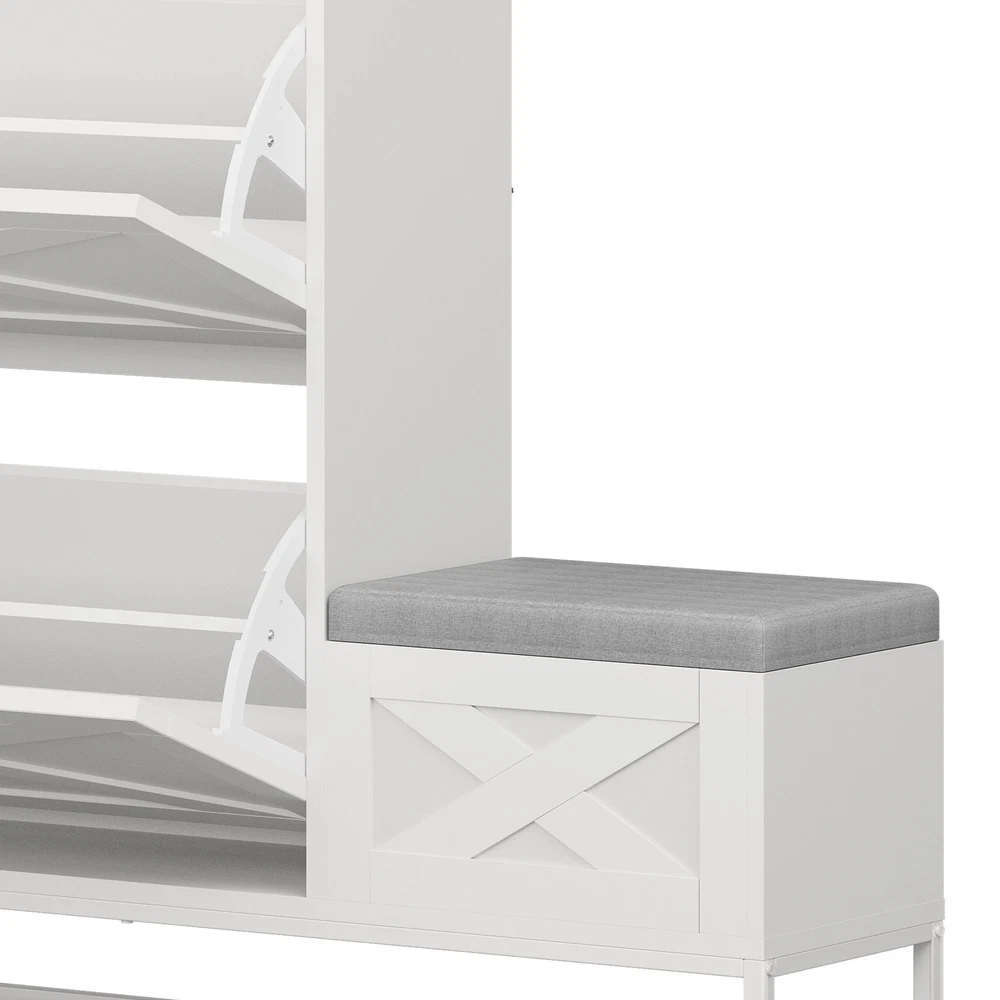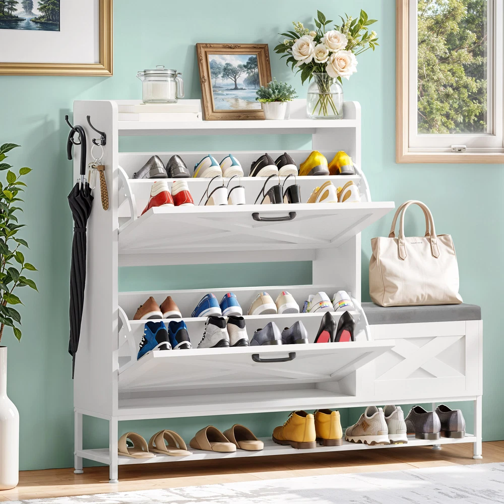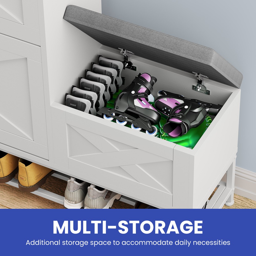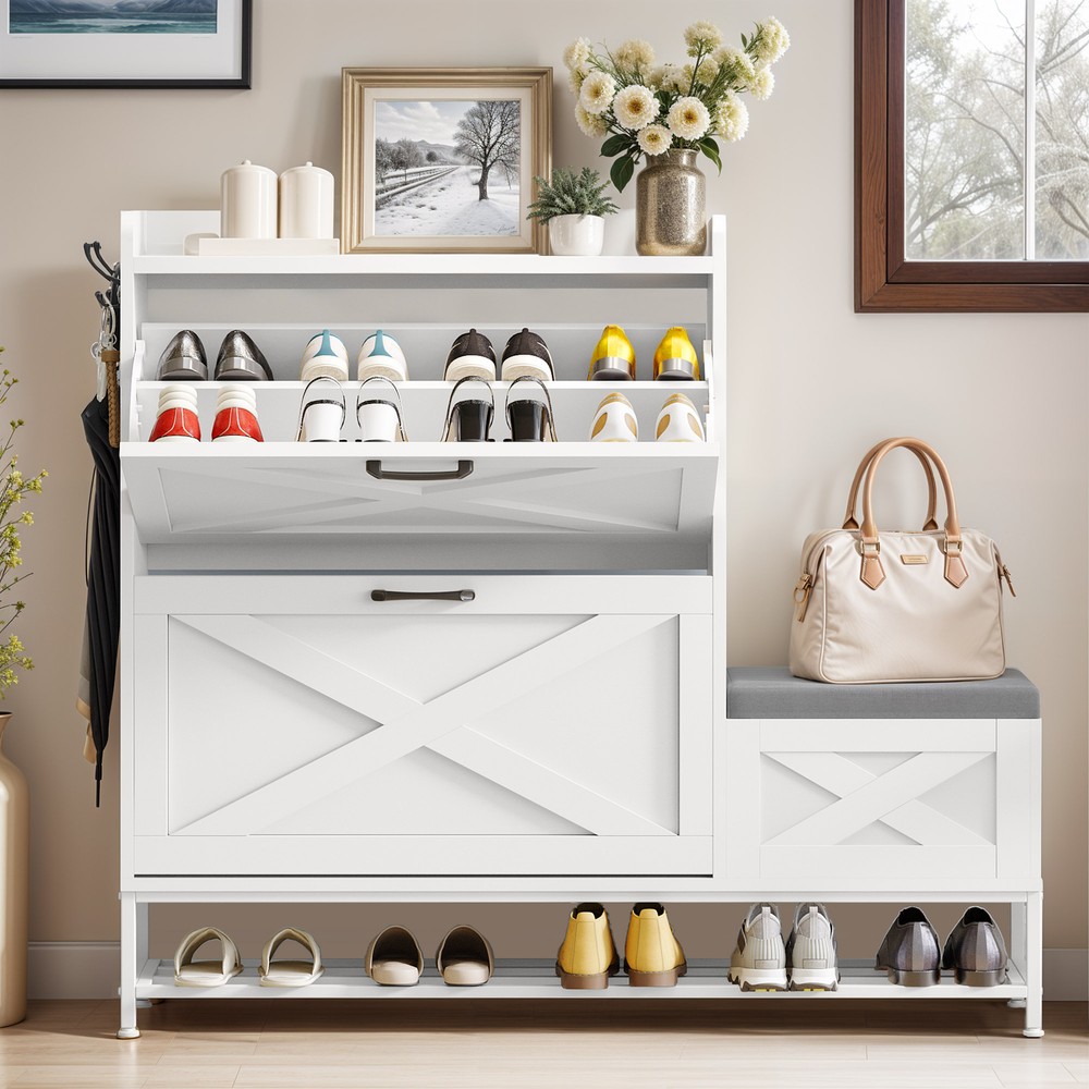 Farmhouse Shoe Cabinet 2 Flip Drawers 16 Pairs Entryway Storage Bench Side Hooks Product Description NOTE: Professional Installation would be Highly Recommended. Description: 1. Color: White 2. Material: Engineered Wood 3. Product Type: Shoe Storage Cabinet 4. Shape: Rectangle 5. Door: Flip 6. Mount: Free Standing 7. Room: Hallway, Entryway, Living Room, Bedroom 8. Special Features: Shoe Bench with Storage, Side Hook, 2 Flip Drawer, Bottom Storage, Top Open Shelves Features: Smart Drop-Down Shoe Cabinet for Effortless Organization: Say goodbye to messy entryways! This flip-open shoe storage cabinet features two hidden compartments with ergonomic handles, accommodating up to 16 pairs of various-sized shoes. Its space-saving design keeps your footwear neatly tucked away while ensuring quick and easy access. Multi-Functional Storage Bench for Ultimate Convenience: More than just a shoe cabinet, this versatile entryway bench offers a comfortable seat for changing shoes. The lift-up cushioned top reveals extra hidden storage, providing a perfect spot for accessories, bags, or household essentials. Keep your space tidy, clutter-free, and stylish all in one! Rustic Farmhouse Charm with Timeless Appeal: Enhance your home with a farmhouse-inspired shoe cabinet that blends elegance with functionality. Its rustic wood finish and classic design complement any decor, making it a chic statement piece for your entryway, hallway, living room, or porch. Slim & Space-Saving with Extra Storage: Perfect for narrow spaces, this slim-profile shoe cabinet seamlessly fits into tight areas. The open-bottom shelf provides extra room for slippers or frequently worn shoes, ensuring easy access and neat organization without taking up extra floor space. Stable, Secure & Built for Everyday Use: Designed with safety in mind, this sturdy shoe organizer includes an anti-tip device for added stability, preventing accidental tipping. Its durable construction ensures long-lasting reliability, making it a must-have for busy households. Dimensions: 1. Product Dimensions: 47.1"L x 9.4"W x 41.3"H 2. Shelves Dimensions: 8.6"L x 4.5"H 3. Bench Storage Dimensions: 15.7"W x 10.6"H 4. Top Shelf Dimensions: 31.4"L x 9.4"W 5. Shoe Capacity: 16 Pairs 6. Item Weight: 62 lb Package Included: 1 x Shoe Storage Cabinet 1 x Instructions Manual Shipping 1. Normally the item will be dipatched within 1 business day if payment is cleared before 12pm PST. 2. Please verify the correct shipping address in your PayPal account before making the payment. We only dispatch the item to the address that is sent to us at the time of checkout. 3. We don't ship to Hawaii, Alaska, Puerto Rico, APO/FPO/PO Boxes. 4. We don't provide local pick-up service. 5. Normally we will use USPS, UPS, FedEx & LTL to dispatch items. Payment 1. We accept PayPal and credit card. 2. We will ship to the confirmed Paypal shipping address that is provided with the payment only. Return 1. 30 days Money Back Guarantee. 2. Please contact our customer service to receive a RMA form first if want to return the item. 3. All returned items MUST in new condition with the original package. Contact If has any problem, please contact us by sending an ebay message. Our customer service will resolve the problem as soon as possible. On Feb 26, 2025 at 21:23:51 PST, seller added the following information: