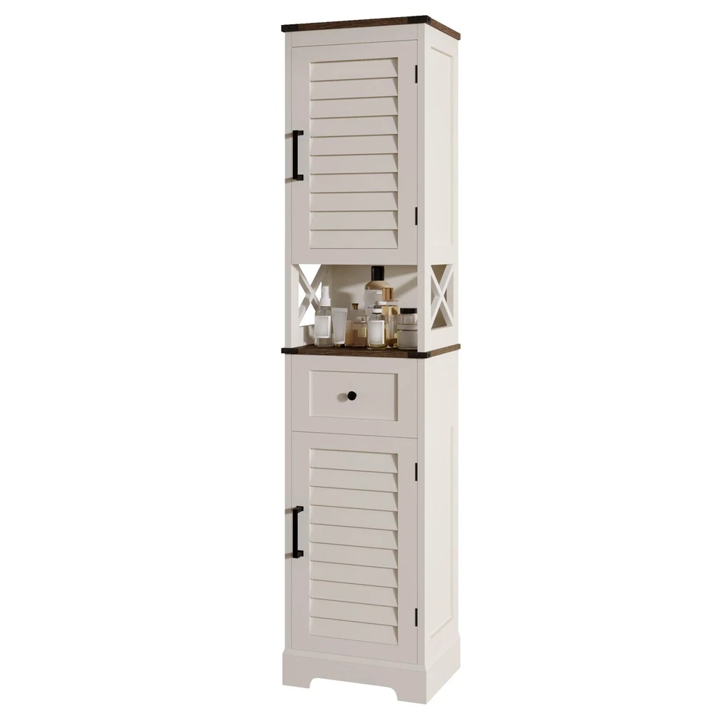 Farmhouse Storage Cabinet, Tall Bathroom Storage Cabinet with Door&Adjustable Shelves, Kitchen Cabinet with Storage, Tall Linen Cabinet Bathroom, Living Room ,Soft White 【Farmhouse Design】:The cabinet use warm whites and browns to create a farmhouse feel, and the farmhouse storage cabinet adds a touch of color to your space. cPaired with louvered doors, it enhances a sense of space 【Utilize Vertical Space】:The tall bathroom storage cabinet 16"D × 12"W × 67"H is ideal for narrow spaces, with multiple shelves and cabinets that make it easy to store various items, clearing clutter and keeping everything organized to maximize your space 【Multi-Function】: In addition to storing items in the bathroom orliving room, the cabinet is also a great choice for organizing in the kitchen where it will help declutter while adding a decorative touch to your space 【High-Quality】: The tall linen cabinet is made of high-quality MDF boards, it is long-lasting and could accompany you through the years. The thickened pillars enhance its load-bearing capacity and stabilit 【Simple Assembly & Quality Service】: The storage cabinet is easy to install, we come with detailed instructions and if you have any questions, we will provide you with customer service!