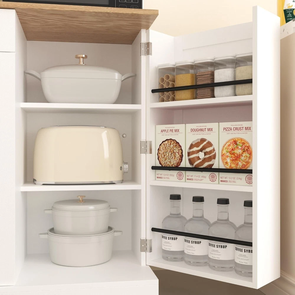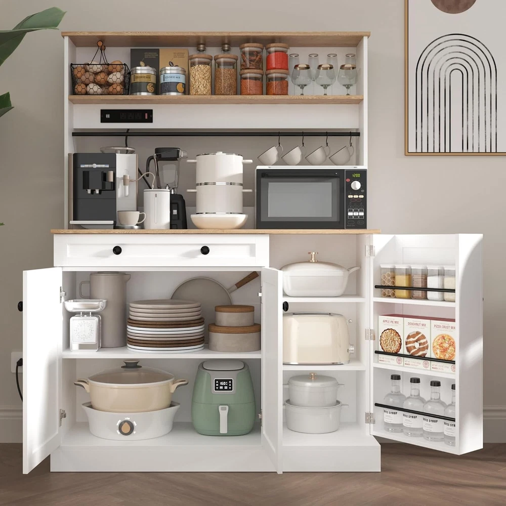 Product Description About this item 【Large Kitchen Pantry Cabinet】With generous size of 15.76" * 46.47" x 65.04", this kitchen hutch bar features large storage capacity designed into multiple open as a storage solution to help organize your space, perfectly solves the messy storage dilemma in your kitchen. 【Power Outlets】The kitchen pantry cabinet is equipped with 3 AC power outlets and 2 USB charging ports, which can power 5 devices at the same time. Your everyday household appliances can be powered on quickly, and the switch can easily and safely turn off the power without unplugging the appliance at any time. 【Ample Storage Space】This large kitchen cabinet has multiple shelves for displaying fine cutlery or storing food jars to keep everything organized, an open wine rod seamlessly integrates into the design, provides 5 hooks to easily hang your favorite wine glasses, coffee cups, etc., while showing their elegance, A spacious countertop allows for easy storage of a coffee maker and microwave for increased daily convenience, this pantry features 1 drawer and three enclosed storage compartments below, and the compartmented storage design of the storage cabinets provides ample storage space for easy access to commonly used items, maximizing convenience. 【Sturdy Structure】 Made of high-quality engineered wood and waterproof paint, the kitchen storage cabinets are designed for durability,The design of hollow arch at the bottom increases the function of moisture resistance,The low center of gravity and anti-tip design make this 65 "tall pantry cabinet very practical for the dining room, living room or bathroom, laundry room, etc.,this cabinet furniture can keep everything organized while enhancing the overall beauty of the room. 【Modern Farmhouse Style】The kitchen pantry cabinet captures the essence of modern farmhouse aesthetics, combining functionality and style. Its crisp white cabinet contrasts sharply with the rich dark yellow wooden countertops. Exuding modern aesthetics and classic retro charm,The classic barn door design adds unique aesthetic appeal, making it an eye-catching focal point in any kitchen or living area. 【Multi-purpose Cabinet】It can be a kitchen pantry cabinet because it has spacious countertops and plenty of storage space, it can also be a buffet cabinet in a dining room because it has a stylish look, large capacity storage drawers and cabinets, or a coffee bar cabinet and bar cabinet in a living room. 【Easy to Assemble】 This pantry storage cabinet is a package that includes all the necessary accessories and tools, with clear instructions, simple assembly, no additional tools required, if you have any questions about the kitchen cabinet, please feel free to contact us. Freestanding Kitchen Hutch Cabinet with Drawers and Adjustable Shelves 65" Kitchen Pantry Storage Cabinet with Power Outlets Previous page Next page Product Function Display Farmhouse Food Pantry Cabinets with Microwave Stand Specifications Pantry Cabinet Dimension: 15.76"D x 46.47"W x 65.04"H Product Weight: 55.5 lb Material: Engineered Wood Color: White+yellow Gift: Four hooks Assemble Require: Yes Package Include: 1*cabinet,1*power outlet, 3 *doors,1 *drawers,1 * User Manual, 1 * Installation Tool When can I ship this pantry cabinet after I purchase it? Our warehouse will arrange for the package to be shipped within 24 hours and transported through FedEx. We have multiple shipping warehouses in the United States, so you can receive your package quickly no matter which region you are in. What material is this pantry cabinet made of? Is it durable?Is it waterproof? Yes, Made of high-quality engineered wood and waterproof paint, the kitchen storage cabinets are designed for durability. Is It difficult and time-consuming to assemble? No, we will provide a product manual. And an assembly video will be provided on the product details page for reference. You can follow the steps in the manual to assemble it. Assembly by multiple people takes less time, making it faster. What if I encounter problems during the assembly process? If you have any questions about our products, you can directly write to us and we will answer and provide assistance to you as soon as possible.What material is this table and chair set made of? Is it durable?