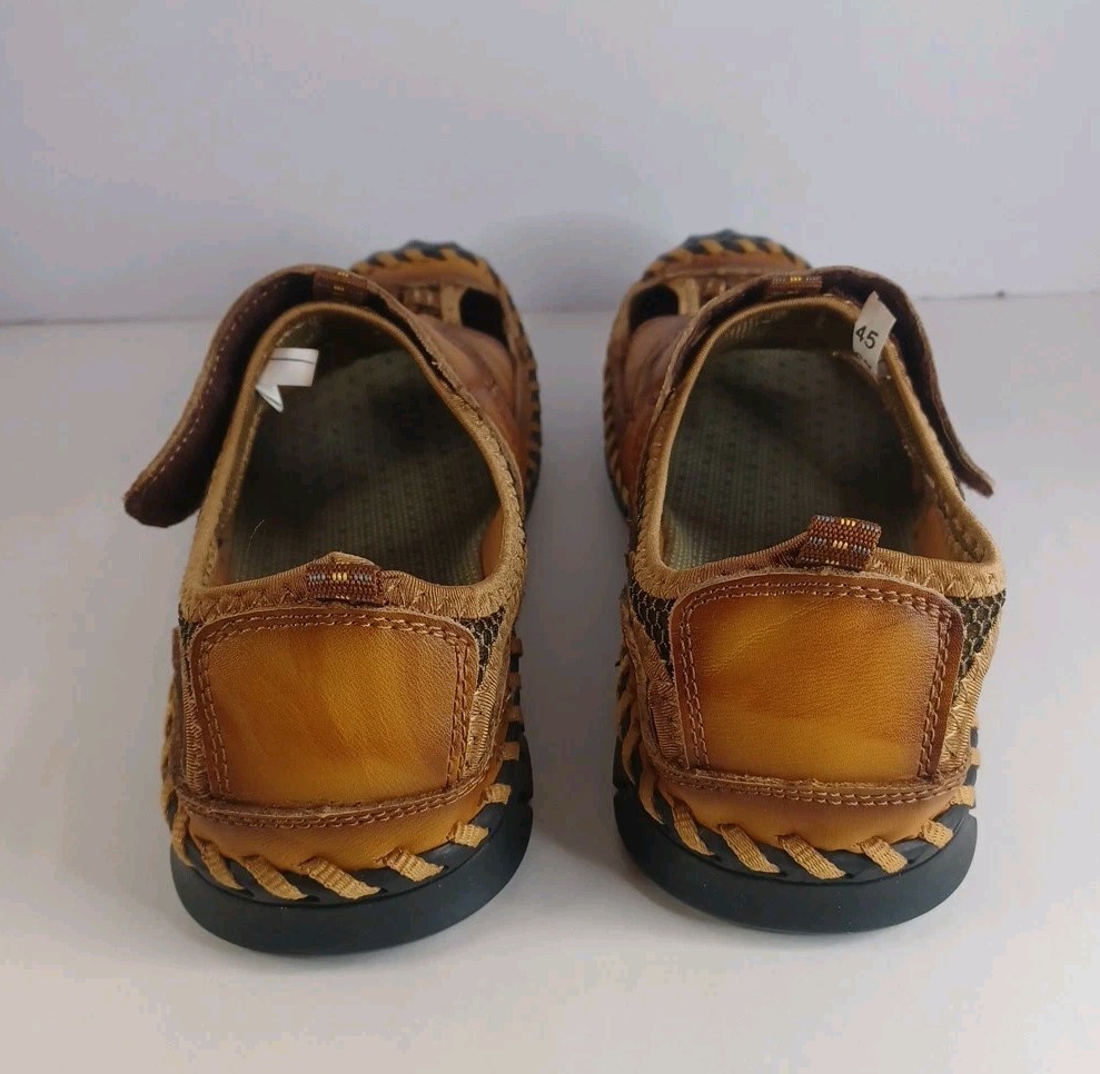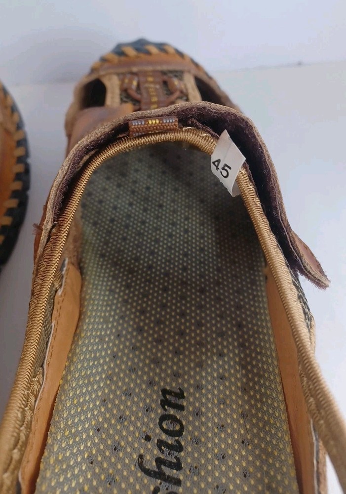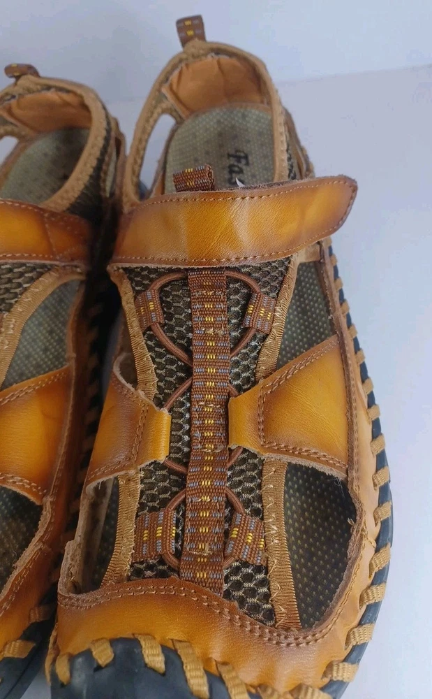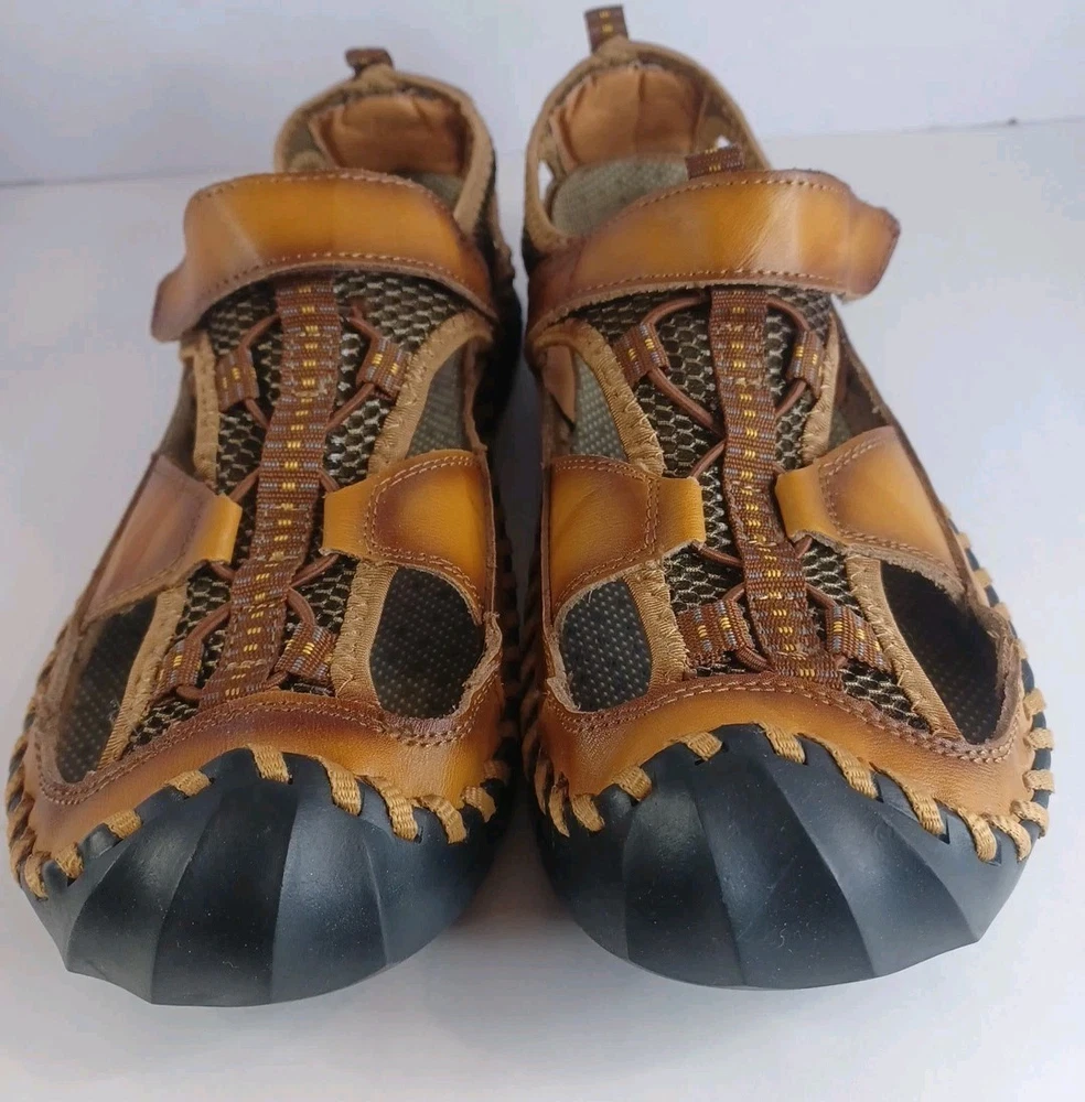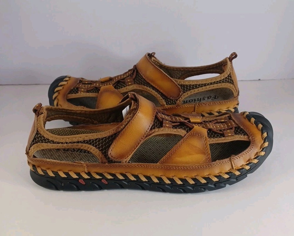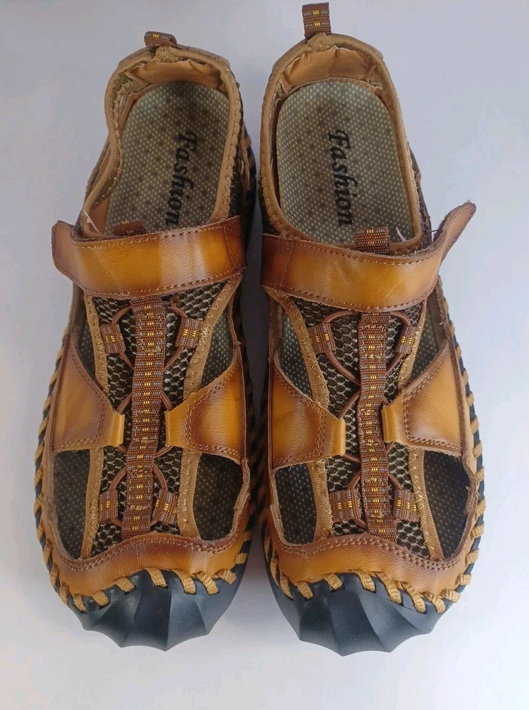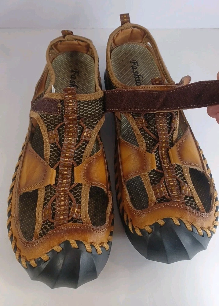 These Fashion Closed Toe Leather Hiking Sandals in Men's size 45 feature a slip-on style, making them easy and convenient for casual occasions. The brown leather upper and synthetic lining provide durability and comfort, while the breathable design keeps your feet fresh. The leather outsole ensures traction and stability, ideal for hiking or everyday wear. The Fashion brand adds a touch of style to these practical and versatile sandals.