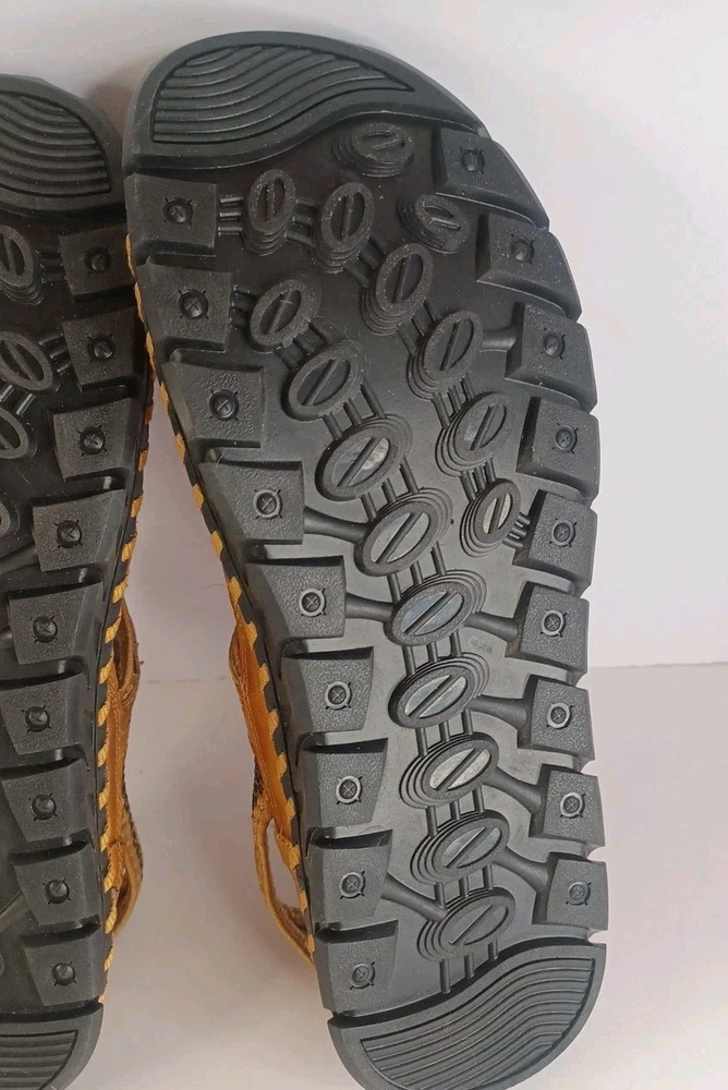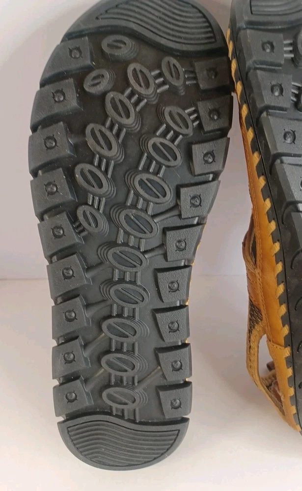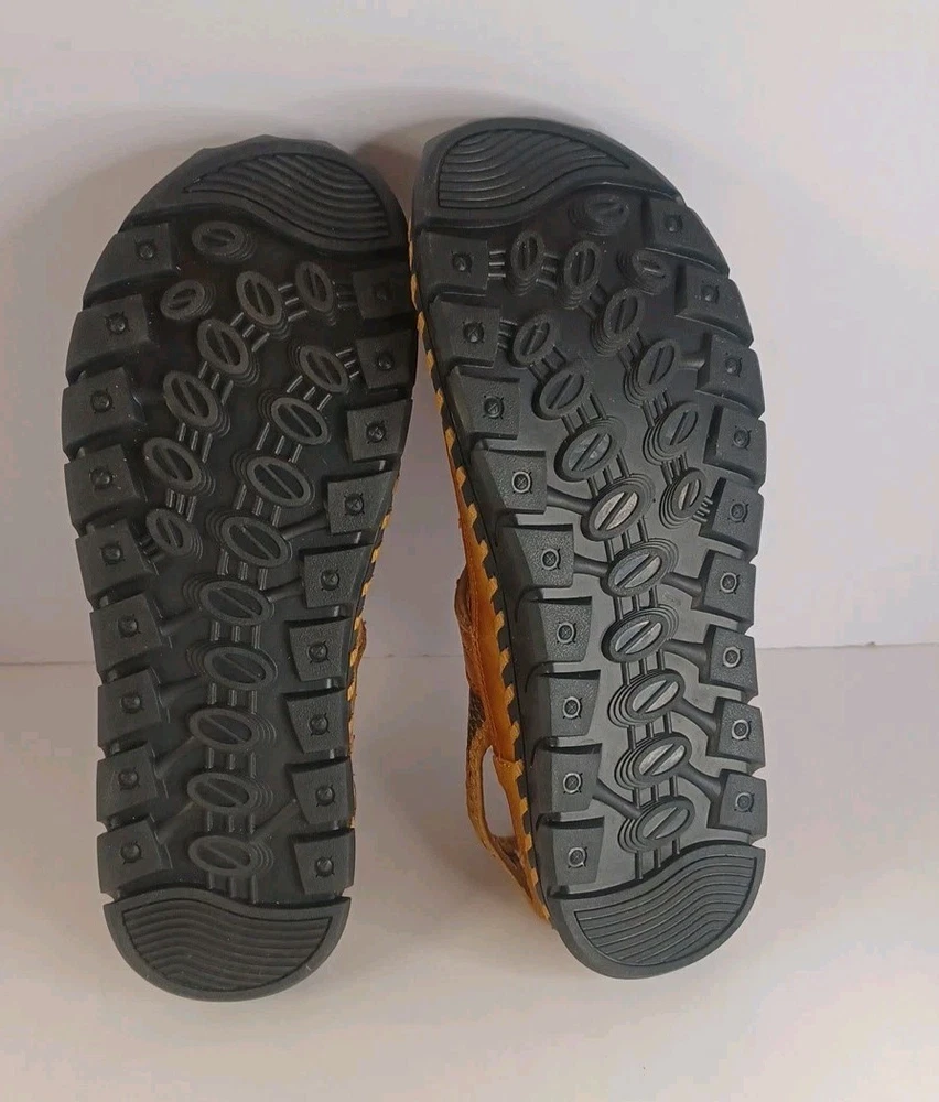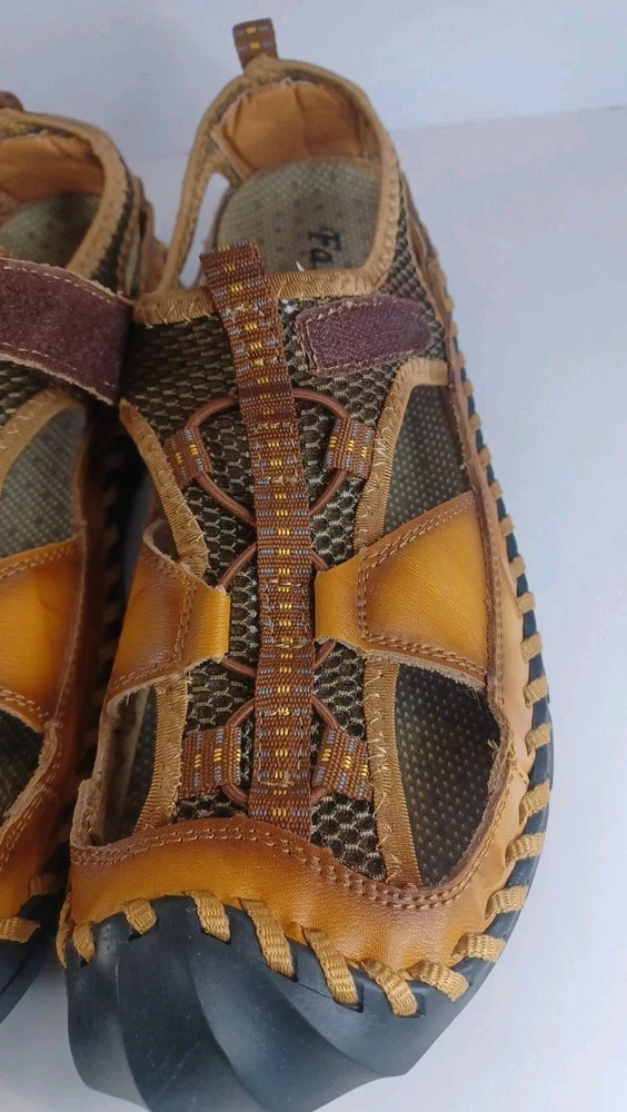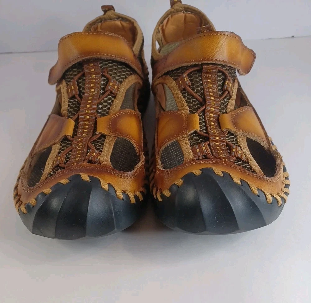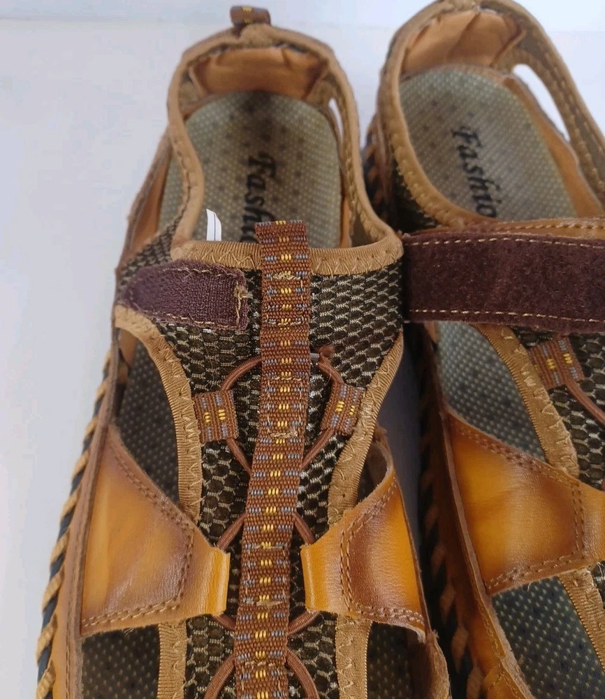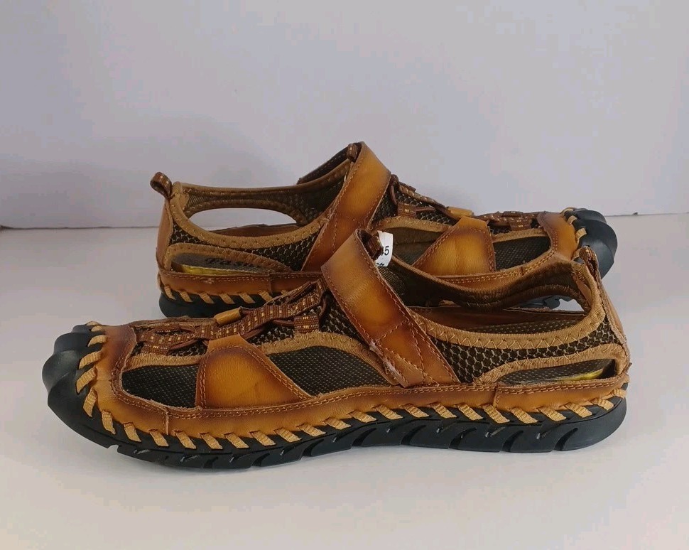 These Fashion Closed Toe Leather Hiking Sandals in Men's size 45 feature a slip-on style, making them easy and convenient for casual occasions. The brown leather upper and synthetic lining provide durability and comfort, while the breathable design keeps your feet fresh. The leather outsole ensures traction and stability, ideal for hiking or everyday wear. The Fashion brand adds a touch of style to these practical and versatile sandals.