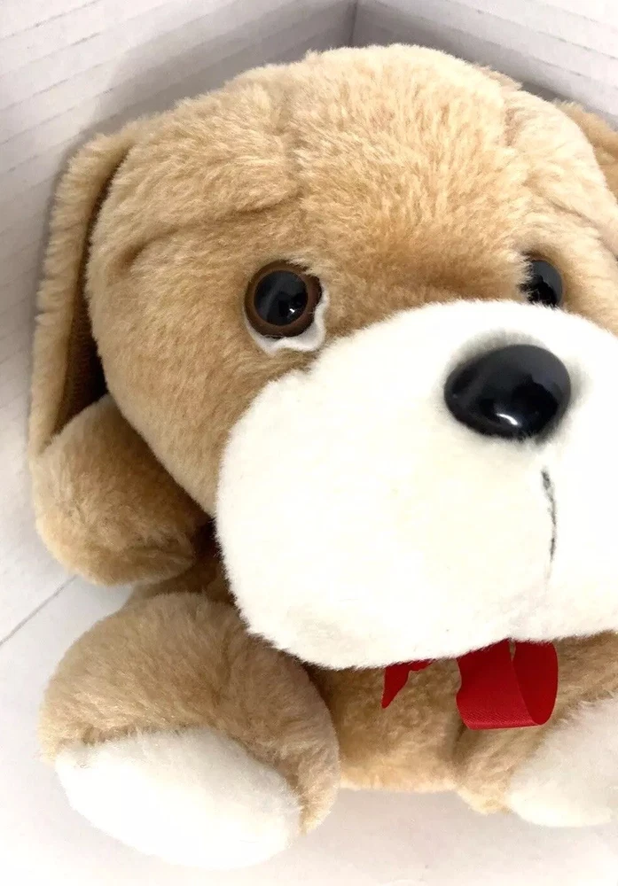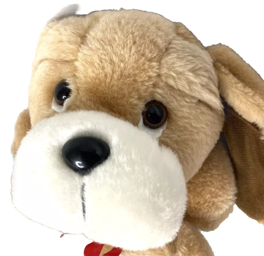 This adorable plush puppy from Fashion Crossroads is sure to become a beloved companion for anyone who loves dogs! With floppy ears, brown eyes, and a red bow, this medium-sized stuffed animal is perfect for all occasions and ages 3 and up. It has been gently used and is in great condition, ready to be loved by its new owner. This plush toy has been surface washed and comes from Taiwan. It is a great addition to any stuffed animal collection, and its timeless design makes it suitable for display or play. Don't miss the chance to bring home this charming Fashion Crossroads 1991 puppy with a red bow!