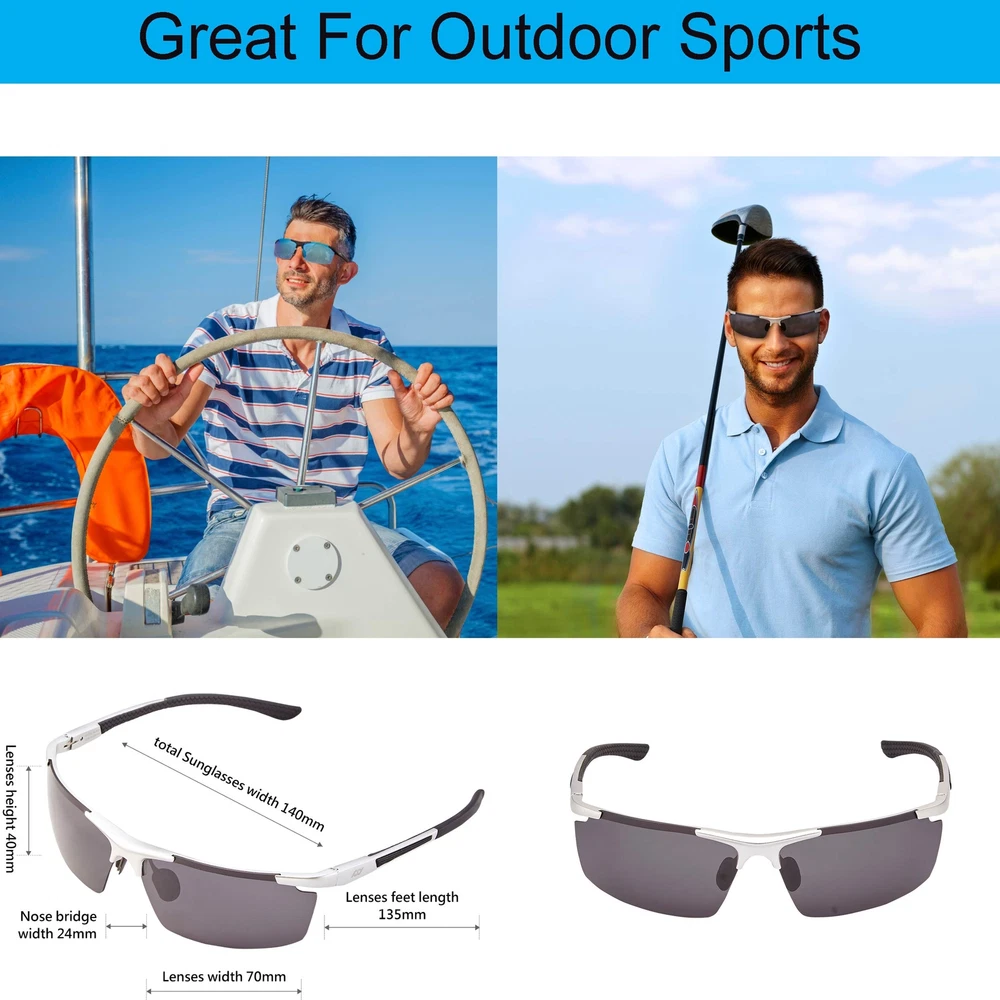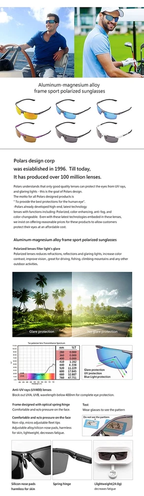 Description corp.was esiablished in 1996. Till today, It has produced over 100 million lenses. Polars understands that only good quality lenses can protect the eyes from UV rays, and glaring lights - this is the goal of . The motto for all POLARS DESIGNed products is " To provide the best protections for the human eye". -Polars already developed high-end, latest technology lenses with functions including: Polarized, color-enhancing and color-changeable. Even with these latest technologies embeded in these lenses, we insist on offering reasonable prices for these products to allow customers protect their eyes at an affordable cost. Product specifications: Total Sunglasses width 140mm Nose bridge width24mm Lenses width 70mm Height 40mm Arm length 135mm Weight 24g Features: Guarantee for Anti-UV + Anti-Glaring π TAC POLARIZED LENS - Shatterproof & Filter Lights Glare - Reduces Refractions, Reflections, Glaring Lights, Increases Color Contrast, Improve Vision, Decrease Eye Fatigue. Great for running, driving, and any other day to day activities. π DURABLE FRAME - Aluminum Magnesium Alloy Frame which is rustproof. Lightweight for comfortable fit. π PROTECT YOUR EYES - Superior filtering Anti-UV RAYS radiation (UV400 UVA/UVB ) Protected - Protects against strong annoying harmful rays from accelerated aging and Retinopathy. These Polarized Lens can Block out UVA & UVB effectively which can filter out and eliminates UV rays within the wavelength 400nm for Complete Eye Protection! Protecting your eyes for high performance. Enhances visual clarity for activity and be more fully focused. π FRAME DESIGN - with Optical Spring Hinge, Comfortable fit, Non-Slip, adjustable Alloy/Rubber nose pads, and harmless on skin. This sunglasses offer shield against wind, dust, sand etc. π PREMIUM PACKAGE INCLUDES - Glasses Bag, Flannel Fabric (Cleaning Cloth), Hard Case, Screwdriver, Polarized Test Card. Great for Youth Sports, Sports, Fishing, Golf, Tennis, Hiking, Adventure, Riding etc. These cool shades will make you look sleek and fashionable!