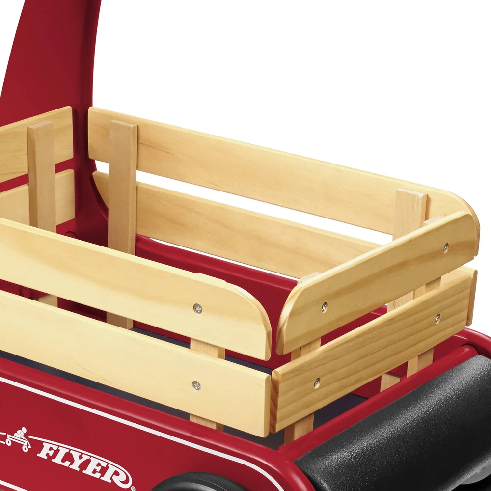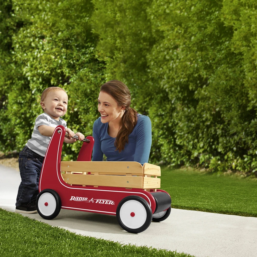 Classic, safe and versatile, this award-winning push wagon is a favorite for children and parents alike. Radio Flyer's Classic Walker Wagon helps children develop gross motor skills. The "resist push" feature allows beginner walkers to safely build confidence and balance. The removable wooden stake sides protect the wagon bed and add to the classic look. The Classic Walker Wagon provides extra storage for your child?s favorite toys to join every adventure! With safety in mind, the furniture friendly bumper protects your home as your little one learns to walk. Maximum weight capacity 35 lbs. Recommended for ages 1 - 4 years. Resist push feature allows beginners to build confidence and balance Natural solid wood body for a classic look Removable wooden stake sides Furniture friendly bumper protects your home Assembly required Dimensions: 22.44 in. x 14.57 in. x 17.13 in. Maximum weight capacity: 35 lbs. For ages 1-4 years