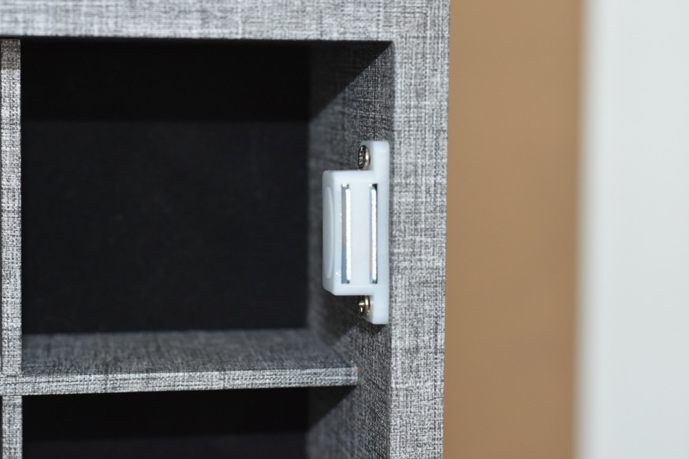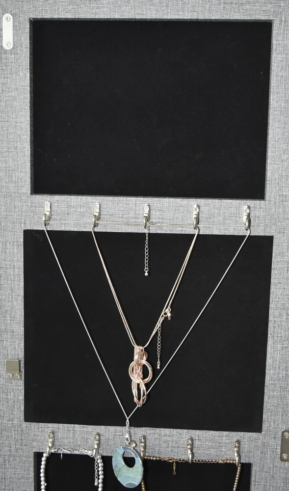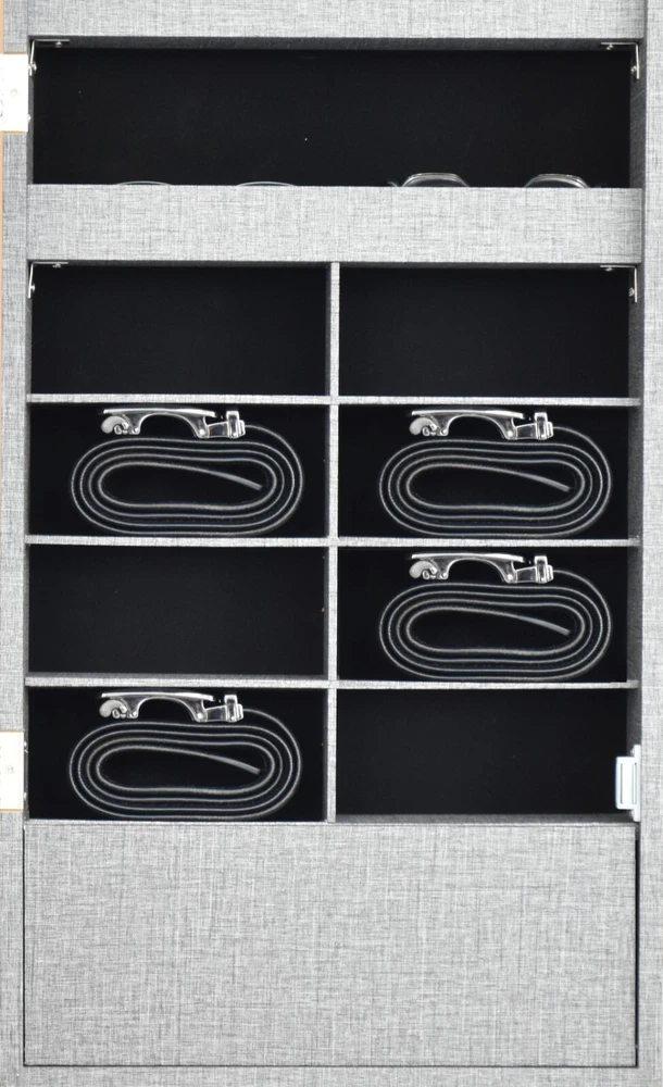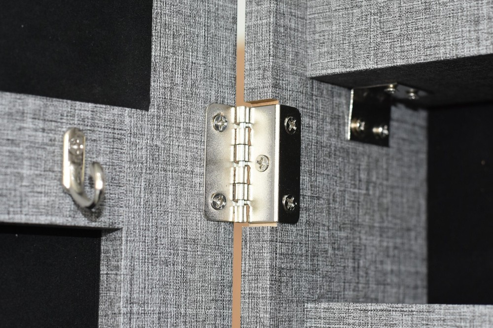 Specification Product Information Item Code: W2512P201001 Product Type: General Item Product Name: Fashion Simple Jewelry Storage Mirror Cabinet With LED Lights Can Be Hung On The Door Or Wall Main Color: Grey Main Material: MDF Product Dimensions Assembled Length (in.): 14.17 Assembled Width (in.): 4.13 Assembled Height (in.): 42.52 Weight (lbs.): 25.30 Package Size Length (in.): 46.65 Width (in.): 7.08 Height (in.): 16.73 Weight (lbs.): 30.80 Product Features MIRROR JEWELRY CABINET: You deserve a better jewelry cabinet to storage your valuables and keep all your earrings, bracelets, chains, rings, watches in order and prevent them from getting tangled. This jewelry cabinet has 4 rows for earrings,2 rows for necklace hooks, 1 cubes, 3 lined shelves and a bracelet rod. WALL & DOOR MOUNT ARMOIRE: You can mount the jewelry cabinet on the wall with included screws to save floor space; also 3 adjustable heights available when hanging the jewelry organizer over the door with hooks. It fits almost anywhere, including closets or decorative displays, to complement any decorative style. SECURE KEY LOCK:This jewelry cabinet has a key lock at the side, it can protect your privacy, also it protects security. black velvet interior is very smooth and nice, it protects jewelry from scratches, locks and keys ensure safety. HIGH-QUALITY MATERIALS: The jewelry cabinet is made of high-quality medium-density fiberboard, which is not easy to deform and durable. The surface of the jewelry cabinet is covered with PVC, which is beautiful and elegant. More importantly, it is moisture-proof, anti-corrosive, durable, and has no odor. Real Glass Mirror: This jewelry cabinet is a combination of a mirror and a jewelry cabinet. It can be used as a mirror for you to dress. It can also be used as a practical jewelry cabinet to store your daily jewelry, giving you a clean and nice space. The white color cabinet can fix your home decoration very well.