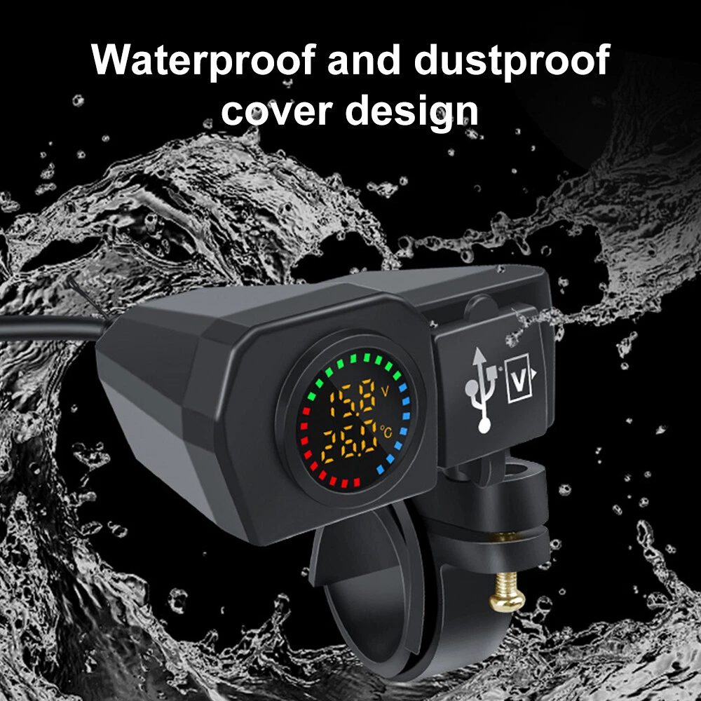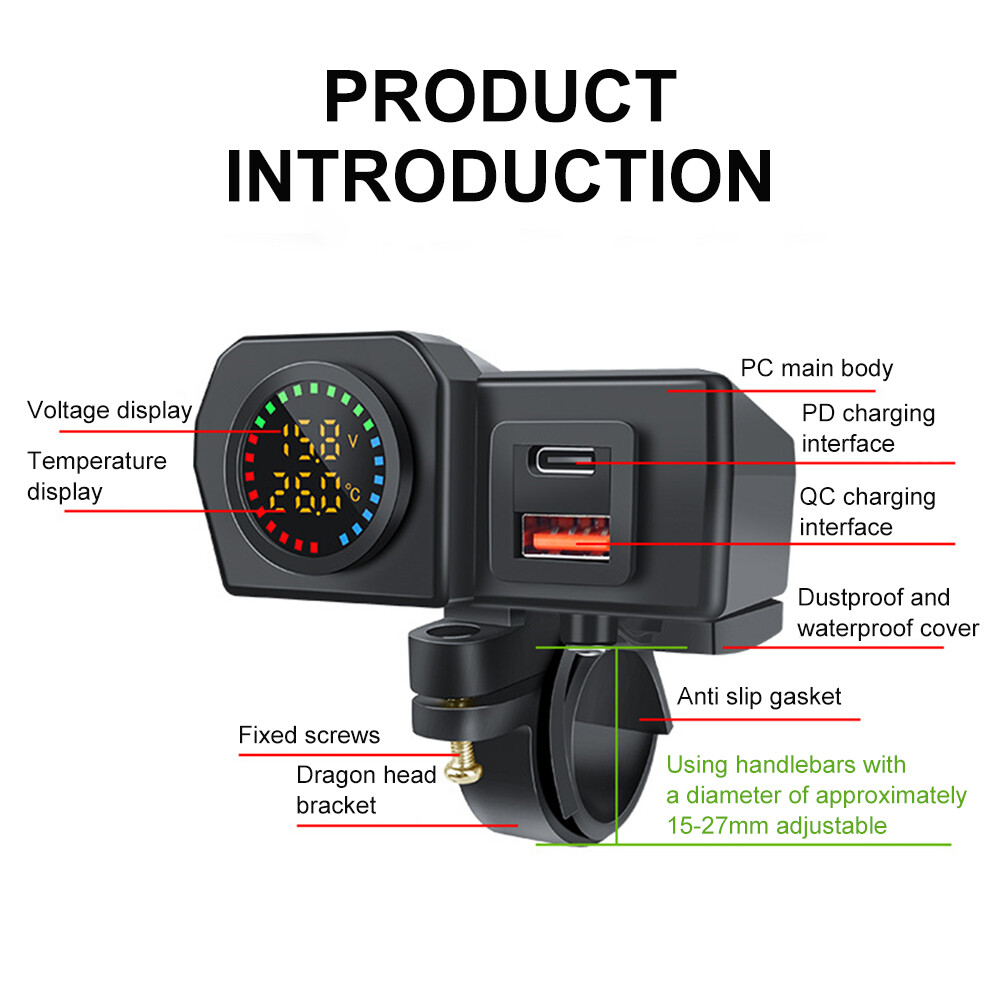 Features: 1.Accurate digital display escort: real-time presentation of voltage and temperature data, just like having a car safety steward, control the charging status at any time, escort for every trip, effectively prevent potential risks, so that the journey is worry-free. 2. Dual charging efficient and convenient: equipped with dual USB ports, perfectly adapted to various types of digital devices, easy to realize the rapid charging of two devices at the same time, say goodbye to power anxiety, whether it is a cell phone navigation or car recorder, can always maintain a full state of power, enhance travel efficiency. 3. Switch control: independent switch design, simple and convenient operation, with the use of open, closed when not in use, not only energy saving, but also effectively avoid the potential safety hazards that may be caused by prolonged energization, so that your use of more worry, peace of mind. 4. Waterproof, dustproof and durable: professional waterproof design with dustproof and waterproof cover, fearless of rain, dust and other harsh environments, to ensure stable operation of the internal circuitry, which greatly extends the service life of the product, whether it is muddy cross-country road or wet rainy season, can be a stable power output. 5. Intelligent protection and worry-free: advanced intelligent protection system, all-round monitoring of current, voltage and other key parameters, in case of abnormalities, automatic power-off protection, to reduce the safety risk of the power of science and technology, to provide a solid and reliable security for your cycling charging process, to enjoy a worry-free journey. Specification: Item: Motorcycle Dual PD USB Charger Material: PC Input voltage: 12-24V Output voltage: 5/9/12V Voltage measurement range: 6V-30V USB output: 60W(QC3.0 30W + PD30W) Size: 77x59x36mm Cable length: 90cm Mounting method: handlebar/mirror stand (with mounting bracket) Connection method: red wire to power positive, black wire to power negative Package List: 1 x Motorcycle USB Charger 2 x Mirror mounting bracket 1 x Handlebar mounting bracket 1 x Anti-skid gasket 6 x Screws and nuts accessories Note: Due to different light and screen settings, the item color may be slightly different from the picture. Please allow 1-2cm size difference due to different manual measurement. On Dec 23, 2024 at 19:38:17 PST, seller added the following information: