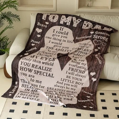 Return Policy Fast Delivery Trusted seller Fathers Day Blankets Gifts for Dad, Blanket to My Dad Gifts from Son, Dad Blanket Presents for Fathers Day, I Love You Dad Letter Warm Soft Throw Blankets, 70"x 50" Product Description Soft and plush: The flannel fleece material is incredibly soft to the touch, providing warmth and comfort for your dad to relax and unwind. Durable and long-lasting: The high-quality flannel material is durable and designed to withstand frequent use, ensuring that your dad can enjoy the blanket for years to come. Stylish design: The blanket comes in a stylish design that complements any decor, adding a touch of elegance to your dad's living space. Easy to care for: The blanket is easy to clean and maintain, making it a practical and convenient gift for your dad. Versatile use: Whether your dad wants to snuggle up on the couch, stay warm while watching TV, or add an extra layer of comfort to his bed, this flannel fleece blanket is perfect for all occasions. Shipping Returns Payment Shipping Shipping is FREE to all addresses other than APO/PO boxes in the lower 48 states. All our stock ships from US-based warehouses. Shipped via USPS or UPS (depending on location and package weight) Unless stated otherwise, all orders will ship within 24-72 hours of your payment being processed. Check our feedback to see the great reviews of FAST shipping we offer. Returns Seller does not accept returns Payment We currently accept payment via eBay managed payments only. Once payment is cleared, we will dispatch your shipment within 1-3 business days. Please refer to the "Shipping" tab for more information regarding shipping speed to your destination.