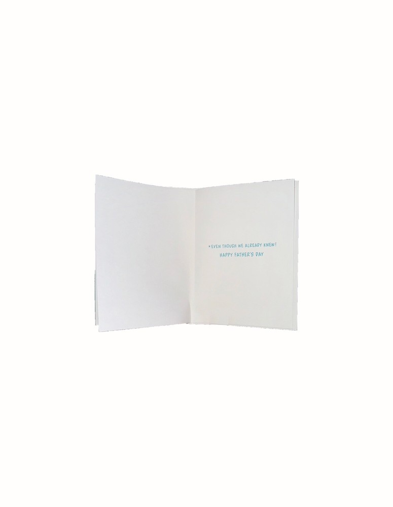 It’s a yellow card with blue and red text. Paige one and two are hard to read because of the picture but it says Page 1:” * EVEN THOUGH WE ALREADY KNEW! HAPPY FATHER’S DAY “ Page 2: Is blank for a personal message to be written