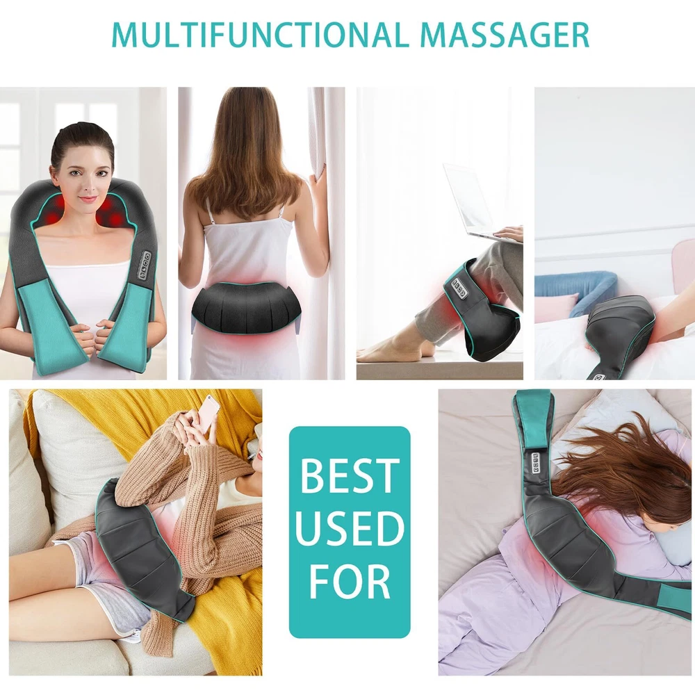 EASY&SAFE TO OPERATE&THREE CUSTOM SPEED MODES Neck massager with a unique and flexible strap, you can easily adjust . Three custom speed modes giveyou need to massage your neck. Overheat protection and 10minute auto-shutdown feature ensure safe use (Can be turned off manually) DEEPER KNEADING MASSAGE Neck massager uses eight Bi-directional rotation kneading massage heads. Back massager also capable of massaging in two directions if needed, with a simple one-button switch to choose which one. As you would expect from any back massager, the back and neck massager can also massage your back, waist, limbs, and shoulders. HEATING FUNCTION Neck massager is lightweight and comfortable to wear for a long time. Thanks to its built-in heating function, neck massager pillow for home, office, car and travel use, it has a AC adapter and a Car adapter that will be more convenient for you. DURABLE AND COMFORTABLE MATERIAL High-quality leather and breathable mesh fabric, back massager is easy to use and clean.and allow you to enjoy a relaxing massage. Back massager is a good helper for home and travel.