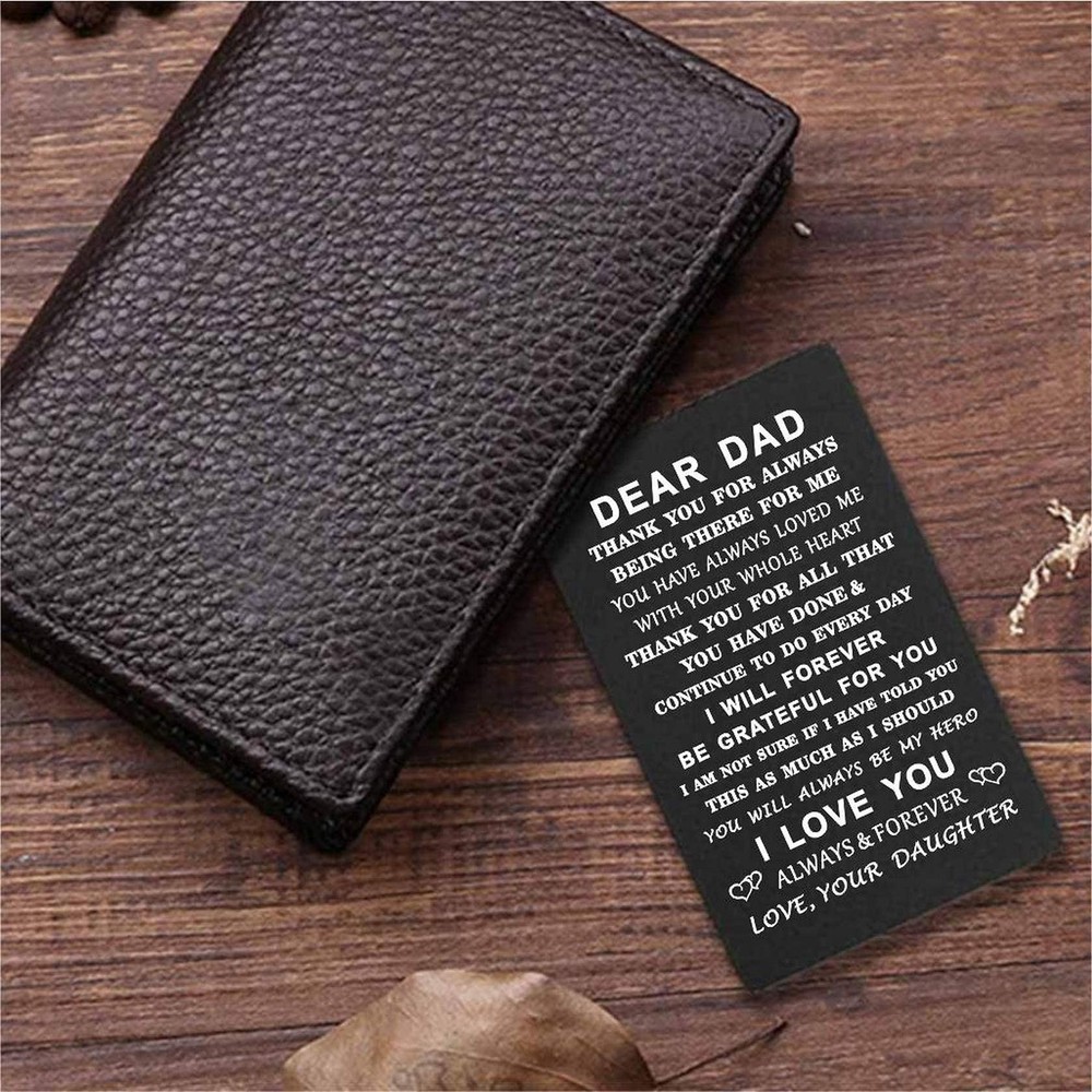Fathers Day Dad Gifts from Daughter - Dad Wallet Card Insert - Fathers Day Card for Dad - Gifts for Dad Birthday Fahter's Day Xmas from Daughter ✓ Free 60 Day Returns ✓ Free Express Shipping Description: Features: Dad Gifts from Daughter - Dear dad, thank you for always being there for me, you have always loved me with your whole heart, thank you for all that you have done & continue to do every day.I will forever be grateful for you I am not sure if I have told you this as much as I should, you will always be my hero, I love you always &forever love, your daughter. Father's Day Gifts for Dad - Perfect gift for your father to celebrate the birthday, Father's Day, Thanksgiving, Christmas, new year, etc. Dad Christmas Gifts - Comes with a cute envelope, ready for giving. It will be perfect gift for Father's Day, birthday, Mother's Day, Christmas gift and any other occasion, or just without any special reason, to show some love to your dad , or attach this Engraved wallet matel cards to with your gifts. Dad Birthday Card - It fits Perfectly in Any Wallet, You will receive one engraved metal card, measure approximately credit card sized (Just 3.35" x 2.17" x 0.03"). One Side Engraved Only, Wallet Not Included. OUR PROMISE - You will be 100% satisfied with our product! TGCNQ is so confident you will love their products, if you are not completely satisfied, you will get a prompt refund or replacement, no questions asked. Product Details: Manufacturer: TIMTOPWORKSHOP Brand: TGCNQ Item Weight: 0.528 ounces Product Dimensions: 3.35 x 2.17 x 0.01 inches Item model number: T2025 Color: Black Pre-printed: thank you Number of Items: 1 Manufacturer Part Number: T2025 Date First Available: September 14, 2020