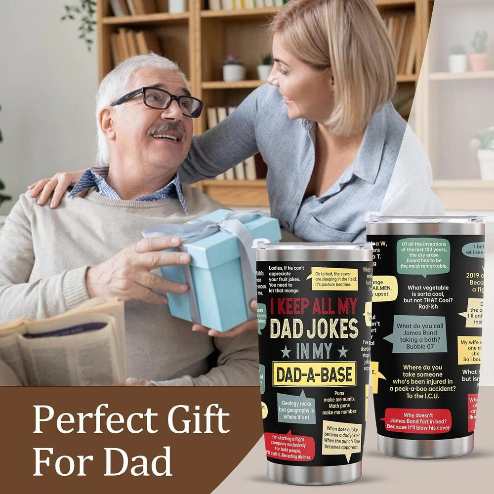 Fathers Day Dad Gifts from Daughter Son Wife, Funny for Jokes Product Details Brand: Ulrhpc Color: Dad Jokes Special Feature: Manual Style: Casual Theme: Holiday MaterialCapacity: Stainless Steel1.3 Pounds FATHERS DAY GIFTS:A great gift for father's day and Perfect for dad or grandpa, men, 40th, 50th, 60th, 70th, 80th, 90th birthdays. durable and practical, perfect gift for father's Day or birthdays.Unique Birthday Present Ideas For Father, gifts for men,gifts for dad ,gifts for husband, gifts for new dad, step-father from daughter, son, Uncle Stepdad Dad Gifts. GIFTS FOR DAD : This funny tumbler is a great gift for any occasion, fathers day gifts for dad from daughter son wife, great for birthday gifts for dad, grandpa gifts, gifts for grandpa, dad mug dad gifts for birthday, dads birthday gifts ideas, mens gift ideas, christmas gifts for dad, dad christmas gifts, dad gifts for christmas. It also makes a terrific choice for Birthday, Christmas, Thanksgiving, retirement, Valentine's Day, and Father's Day events. GIFTS FOR DAD FROM DAUGHTER, SON, KIDS – The dad tumbler is suitable for any indoor or outdoor place. Let your dad enjoy his favorite drinks no matter where he is with this stainless steel tumbler. Sturdy and leak-proof, it’s great for both outdoor and indoor use. Bring this tumbler with you next time you go to a picnic, hiking adventure, RV tour, beach outing, or fishing trip. DAD GIFTS: Suitable for Father day, Friendship, Thank you, Christmas Birthday Retirement or Any Anniversary gifts for men who have everything. The 20 oz capacity can let you keep enough water. Wine, beer, coffee, drinks, champagne, cocktails, and other alcoholic beverages are all suitable. It's suitable for both indoor and outdoor use. Lake, beach, swimming pool, office, parties, picnics, patio, BBQ, and camping should all be ideal companions. PREMIUM MATERIAL: This tumbler is made of premium 304 food-grade stainless steel.this tumbler is Durability, unbreakable, rust-resistant, and doesn't transfer the flavor of your drinks. Double vacuum insulated,The BPA-free clear lid that seals the cup tightly keeps spills under control,at just the right temperature for up to 9 hours, depending on the outside temperature.