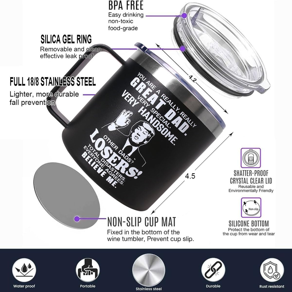 Store New Arrivals Add to Favorite View Feedback Contact Fathers Day Dad Gifts from Daughter Son,Christmas Birthday Gifts for Step Dads Father in Law Him Bonus Daddy,Gift for Men Papa Grandpa Uncle Stepdad,14 Oz Black Tumbler Mug Description Item model number PC260 Style Modern Number of Items 1 Pattern Letter Print Theme Birthday Cartoon Character Gifts, Daily Necessities Unit Count 1.0 Count Product Dimensions 4.2"W x 4.5"H Material Stainless Steel Capacity 14 ounces Age Range (Description) Adult Specific Uses For Product Cold Drinks, Hot Drinks Material Type Free BPA Free, Lead Free Reusability Reusable Customer Package Type Standard Packaging Item Weight 9.6 ounces Material Feature Recyclable Special Feature Leak Proof, Sliding Lid Color Dad Gifts Black Shape Cylinder Recommended Uses For Product Home Included Components Lid Product Care Instructions Hand Wash Only Size 14 Ounces Funny GIFTS:The cup is very suitable for birthday,anniversary,Valentine's Day,Thanksgiving Day,Father's Day,Christmas and other important holiday or occasion to give to father. GIFT FOR ANY OCCASION:Perfect for office,party,vehicle and home.Imagine your father drinks coffee,water,beer from his new tumbler,He will tell you that you found he favorite gift! HIGH QUALITY:Featuring a leakproof cap.The cup body is made from food-grade stainless steel,double-wall vacuum,durable,unbreakable,rust-resistant,keep your drinks ice cold longer and warm beverages piping hot. CUP HOLDER FRIENDLY:The Christmas tumbler design will fit most car,vehicle,bike,and boat cup holders and with a 14 oz capacity TRAVEL READY:Carry around your beverages whether out at the mall,soccer game,or park.Stay refreshed and hydrated no matter what adventure life takes you on. Product description ABOUT US We offer the best prices around on high quality products. Our E-store includes media such as books, movies, music and games while offering electronics, toys, sporting apparel, clothing, tools, general home, garden items and more. SHIPPING We are always working hard to ensure your package arrives as soon as possible. Please understand that some factors like weather, high postal traffic, and the performance of shipping companies are outside of our control. We offer free shipping to the lower 48 states and ship within 2 business days of payment, usually sooner. We do not accept P.O. Boxes. Please provide a physical address. For shipping outside of the continental USA, we only use eBay's Global Shipping Program.The item is shipped to KY and then sent to the rest of the world. International customers are responsible for all duties and taxes. Continue to check out in order to calculate costs for shipping the item to your country. Messages regarding eBay's Global Shipping Program MUST be directed at eBay EXCLUSIVELY. RETURNS We offer a 30-Day Return Policy on items which you are not completely satisfied with. You have the option for a full-refund or an exchange of the item. No returns are available on items shipped outside of the USA. PAYMENT We accept PayPal. CONTACT US This page content is yet to come Please ad us to your favorite seller and visit again later Thank You CUSTOMER SATISFACTION We try our very best to make sure every customer is completely satisfied. If there's a problem, message us! We're happy to help. WE ACCEPT