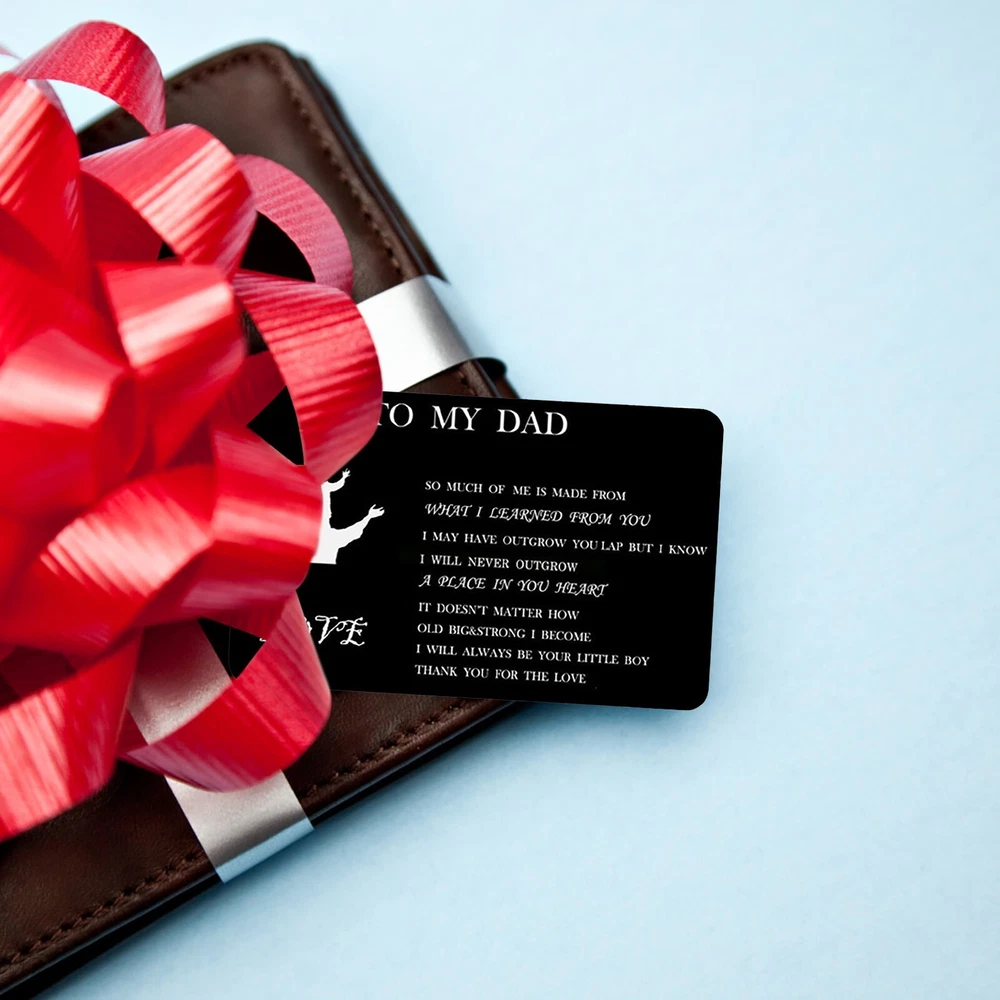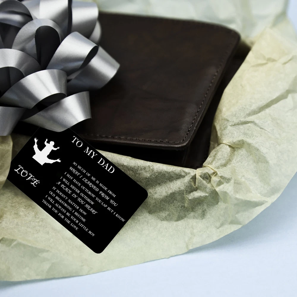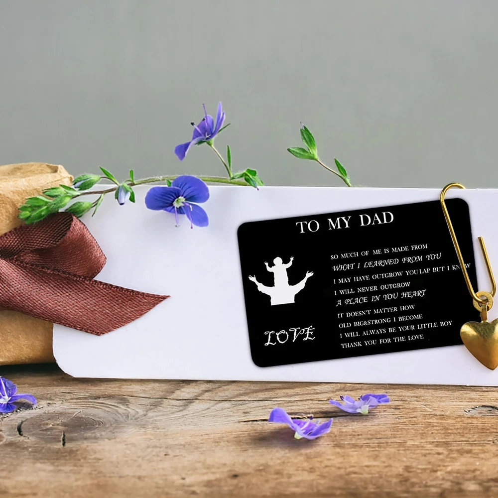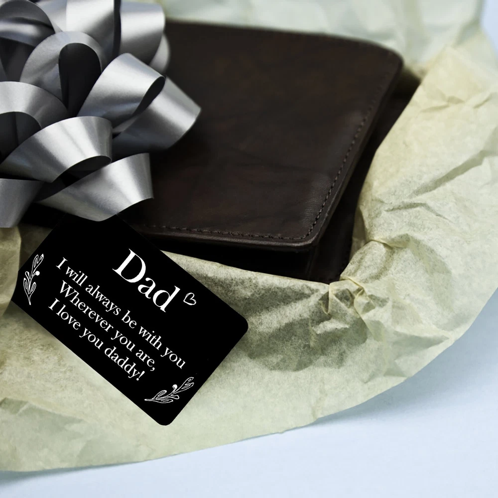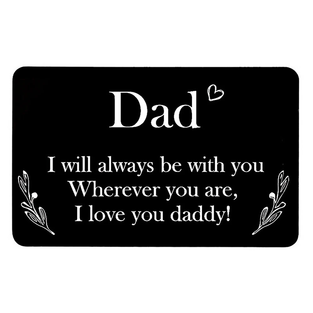 Personalized Engraved Wallet Metal Card Insert From Son Daughter Birthday Thanksgiving Christmas Father Day Customized Best Dad Ever Best Custom Message Card For Dad Daddy Features: Best Gifts For Him Whenever your loved one opens his wallet, a happy smile will appear on his face. Engraved wallet card with love message, it helps you convey your love. The information you convey will last a . Love him, give this to him! Credit Card Size 3.35 x 2.13 x 0.03 inches 85mm x 55mm x 0.7mm . It will perfectly fit in any . Premium Quality Made of high quality stainless steel which looks thin yet sturdy. Will not bend easily! Permanent engraved, will not fade or wear off. You can feel it with your finger. Affectionate Gifts Wallet insert card with your love note is a remarkable way to tell him how much you love him.Perfect customized gifts for dad. These wallet cards also make amazing gifts for birthday, Father Day, Halloween, Thanksgiving Day, Christmas and more. NOTE Come with a cute envelope for giving, ONLY THE METAL CARD. If anything goes wrong with your order, please let us know and we will try our best to solve it for you. 100% satisfaction guarantee. Product Description: Size: As shown Color: Black Material: Metal Shape: Rectangle Include: 1xcard