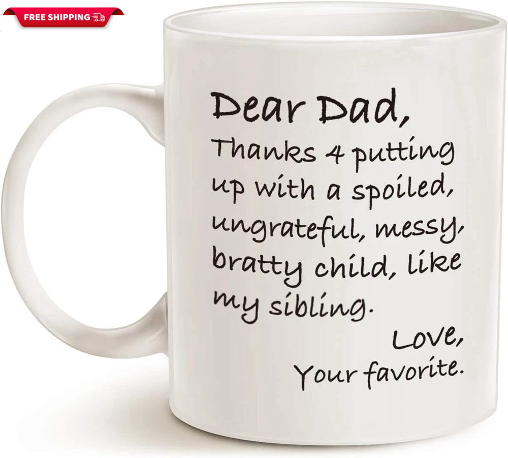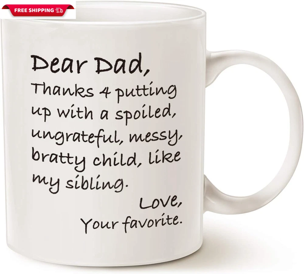 Fathers Day Funny Dad Coffee Mug, Dear Dad, Thanks 4 Putting up with a Spoiled... Love, Your Favorite Best Birthday Gifts for Dad Father Cup, White 11 Oz MAUAG Christmas Gifts Funny Coffee Mug for Dad, Dishwasher and Microwave Safe. Printed On Both Sides. Dear Dad, Thanks 4 putting up with a spoiled, ungrateful, messy, bratty child, like my sibling. Love, Your Favorite High Quality Ceramic, Treat Yourself or Give as a Gift to Someone Special, Can Be Used for Home and Office. Exquisite Fashion, Easy-grip with Handle, Suitable for Hot and Cold Drinks. Great Holiday or Birthday Gift for Your Best Dad, Father, Daddy, Pop, Poppa, Papa. This Represents an Affordable Novelty They Will Appreciate for Years. MAUAG Mug Inc Designs, Funny Christmas Gifts Fathers Day Dad Coffee Mug in Natural, 11Oz Capacity. Each mug is microwave & dishwasher safe. The phrase "Dear Dad, Thanks 4 putting up with a spoiled, ungrateful, messy, bratty child, like my sibling. Love, Your Favorite" is clearly scripted and centered on the front of the mug. The perfect size to enjoy your morning beverage and the perfect gift for your loved ones on that special day. Ideal to surprise friends or co-workers at the office on any occasion. This product adds to home. Why? Because we like you! Yours today for a very cheap price. Item model number LT dear dad mug white-1 Style 经典的 Number of Items 1 Pattern Letter Print Theme Funny,Love Unit Count 1 Count Material Ceramic Capacity 14 Fluid Ounces Product Dimensions 3.5"W x 4"H Package Type FFP Age Range (Description) Adult Is Discontinued By Manufacturer No Specific Uses For Product Hot Drinks Included Components Handle Reusability Reusable League ncaa Material Feature Ceramic Material Type Free Plastic Free Special Feature Microwave Safe Color 11 Finish Type likely glossy Occasion Father’s Day Item Weight 9.6 ounces Shape Round Recommended Uses For Product Home Manufacturer Father's Day Christmas Gifts Funny Coffee Mugs Product Care Instructions Machine Wash, Microwave Safe, Hand Wash Only Size 1 Count (Pack of 1) Shipping Fast shipping is very important for us. Our standard US shipping service is FREE. Your order will be shipped within 1-3 business days upon full payment received. Your order will be delivered within 1-3 business days after the handling time. We reserve the right to cancel any order for any reason at any time. We are not responsible for undeliverable addresses. We are not responsible for undeliverable addresses. Returns and payment We offer a 30-day return policy from the date of payment received. This return policy covers Incorrectly Shipped items, Broken or Damaged items, Items that do not match the Product description and Picture. Medicines, Pills, Creams, Gels, Food Supplements and products that cannot be reused after opening cannot be returned. For example; cat litter, powder detergent, salt, liquid products, etc. FeedBack Your feedback is very important to us, please leave us positive feedback once you receive your package and satisfied with our service. If you have any problems with your order, please contact us using the eBay communication system before leaving feedback. Please visit our eBay store to check out other items for sale! Thank you for shopping at our store.