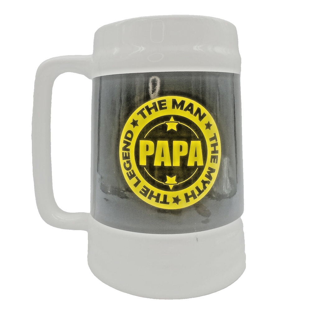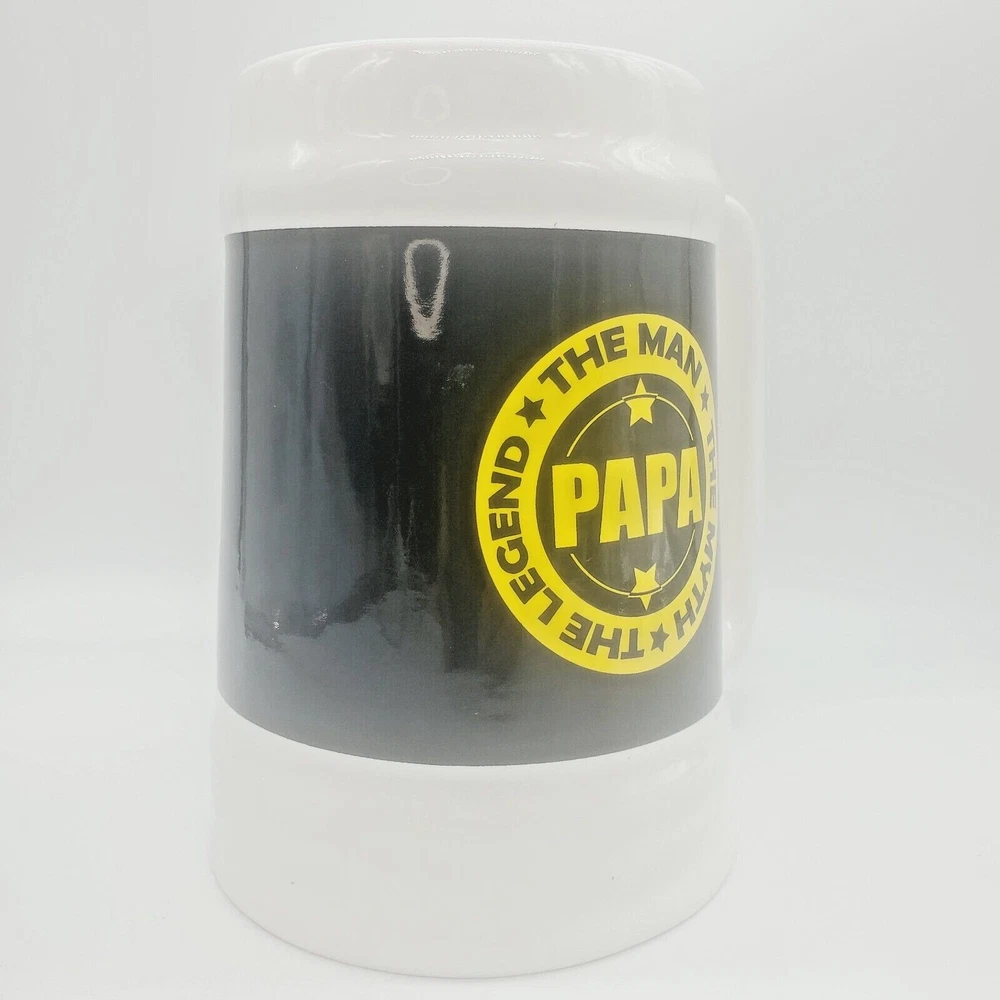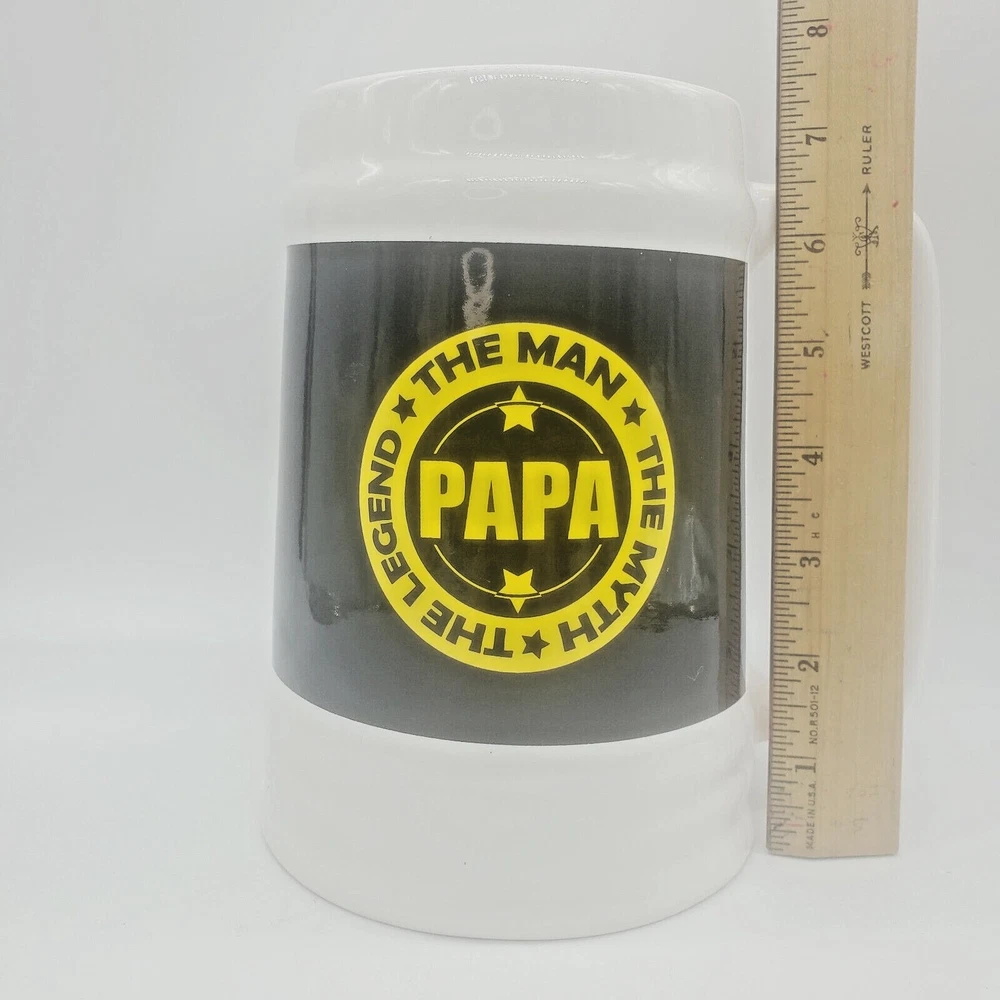 Fathers Day Giant Huge Coffee Beer Mug Cup Gift Papa Father Grandpa Grandfather Ceramic 🌟 Kitchencore See the video Surprise your dad with this giant mug this Father's Day and show him how much you appreciate him. The white ceramic mug features a special Fathers Day design with words that will make any dad feel special. Perfect for enjoying his favorite hot or cold beverage, this jumbo mug is a great addition to any collection. PAPA, The Man The Myth The Legend, Giant Coffee ( or Beer ) Mug! Approximately 7" tall by 6-3/4" wide including handle One slight mark towards bottom front of mug It's a very large mug! Perfect gift for Dad / Papa / Father / Grandfather / Grandpa for any occasion! When shipping with boxes, I ship with repurposed, recycled boxes that have been previously used. The box may be irregular. I may customize a re-cut, resized "Frankenbox" to achieve a certain size or shape. It may have erroneous markings and it may not be the prettiest one out there :) Using right-sized, recyclable packaging minimizes waste, SAVES COSTS TO THE BUYER, and helps ensure damage-free delivery. I strive to optimize the type of material and weight needed to deliver products safely