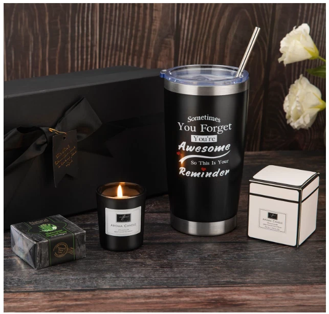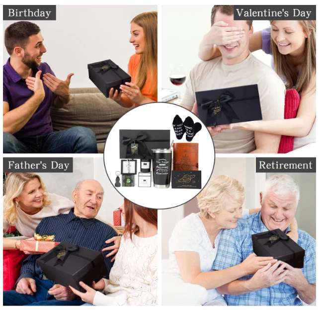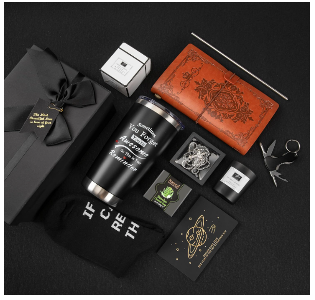 About this item 【Gift Box Package】:The gifts set comes with Insulated Tumbler, Socks, Vintage Notebook,Pure Manual Soap ,Scented Candle,Cross Necklace,Multifunctional tool keychain,Greeting Card, Exquisite gift box and some accessories such as lid, straws. 【High Quality Tumbler】:Our tumblers are made of stainless steel material, the double walled vacuum insulated design maintains the suitable temperature for his favorite drinks for hours.Our stainless steel travel tumbler is not only suitable for many outdoor or indoor occasions such as home, office, picnic, hiking, fishing. 【Vintage Look Notebook】:This professional notebook features an aged multi-tone dark brown faux-leather notebook cover for timeless appeal.The vintage feel adds to the overall look. Pretty books for journaling often inspire one to write. Perfect for expressing those very special moments. 【Scented Candle for Relaxation】: Our scented candle is designed to create a calm and serene environment; The pleasant fragrance will help him unwind after a long day, making it an ideal part of his relaxation routine. 【Man Gifts for Dad Who Has Everything】:If you are looking for a Curated Man Christmas Gift, our Gift Box is an elegant package that comes with practical gifts for men. Our box filled with love and thanks can brighten up a memorable Christmas, may it be your dad, papa, grandpa, husband, stepfather, or father-in-law. 【Best Gifts for Men On Any Occasion】:This funny gift basket for men is a thoughtful gift for any celebration. Hand it out during birthdays, Christmas, Thanksgiving, or any other day of the year! When he receive the mens gifts he will deeply feel your love!That Would Remind Him of you every time when he uses the mens gift.
