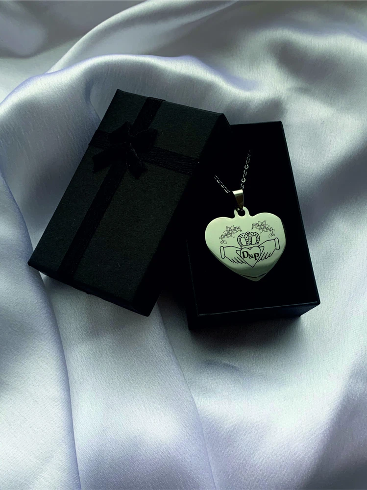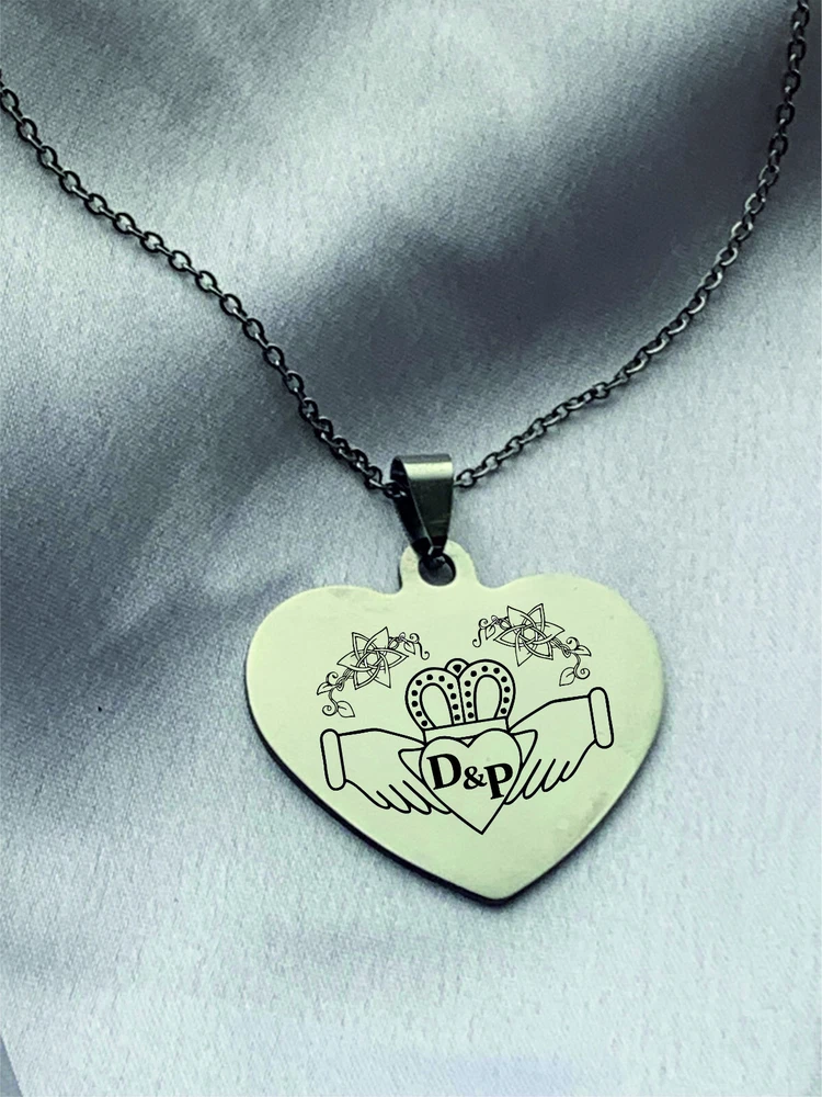 Claddah Design Heart Gift Personalised with your choice of name/s - Reverse side can have any greeting or message you like upto 6 lines - Front side can have any initials Type (Heart Pendant) with chain (claddah theme) 35mm x 35mm 18" silver plated chain Material (high quality polished stainless steel) Comes with chain Engraved in stunning 4k quality photo Will last a lifetime Any text engraved FREE TEXT ON REVERSE SIDE (UPTO 6 LINES) WORTH £5 What makes our engravings different? We use state of the art 4k lasers (fibre) What you see is what you get, look at our sample photos, we dont use computer generated overlays, these are real engravings. We have over 30 years experience in design, engraving and print production with professionally qualified staff, if you have a problem we can fix it. 24 hr production from receipt of order Tracked and traced orders (as standard) We produce artwork for any occasion. How do I order? Buy your item Leave any text required in the personalised box Message any photos required (please use high resolution images) We will keep you informed about your order every step of the way 4 PLEASE CHECK YOUR SPELLING!, WE CANNOT BE HELD LIABLE FOR ANY INFORMATION SUPPLIED THAT IS INCORRECT. TEL 07762 311242 for details We also produce:- Quality Pet Tags Shop signs vehicle signs & stickers Banners and display boards Roll up/ Pop up banner stands Magnetic signs and much more...........