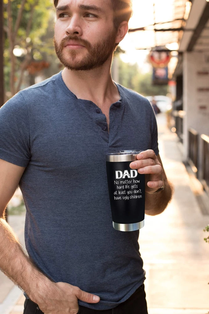 AWESOME GIFT FOR DAD – This leak-proof tumbler is a sure hit for fun-loving and cool fathers. It makes a fantastic choice for Father’s Day, birthday gifts for dad, best dad gifts, husband birthday gift ideas, or just those special parents or siblings in your life. FOR POPS' EVERY MILESTONE – Show your father how much you appreciate him with this humorous tumbler. It's a must-have for every beer, wine, tea or coffee-loving dad. Get this for your pops on his 30th, 40th, 50th, 60th, 70th, 80th, or even on his 100th birthday! It also makes a terrific choice for Christmas, Thanksgiving, retirement, Valentine's Day, and Father's Day events. DOUBLE-WALL VACUUM INSULATION – Made with double-wall vacuum insulation, this 20 oz flask can retain any drink’s ideal temperature for longer. Make it your go-to container for piping hot coffee, iced cold fruit teas, juice, champagne, smoothies, sodas, ice cream, energy drinks, and milkshakes. BPA-FREE AND DURABLE – These tumblers come with a BPA-free, convenient drink lid. Crafted with 18/8 food grade stainless steel these tumblers are durable, unbreakable, sweat proof, rust resistant, and perfect for backyard barbecues, hanging out at the pool, or enjoying a hot day at the beach with friends. GIFTS FOR DAD FROM DAUGHTER, SON, KIDS – Let your dad enjoy his favorite drinks no matter where he is with this stainless steel tumbler. Sturdy and leak-proof, it’s great for both outdoor and indoor use. Bring this tumbler with you next time you go to a picnic, hiking adventure, RV tour, beach outing, or fishing trip.