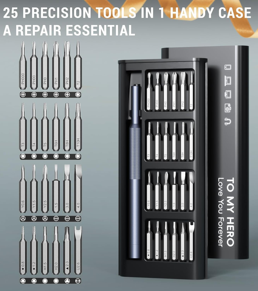 Fathers Day Gift for Men Precision Magnetic Screwdriver Set Mini Repair Tool Kit π Perfect Gift for Men & DIY Enthusiasts This premium 25-in-1 screwdriver set is an ideal Father's Day gift, birthday present, or stocking stuffer for husbands, boyfriends, and tech-savvy men who love fixing things. Comes in gift-ready packaging that impresses. π οΈ Complete Professional Repair Kit Includes 24 high-quality bits (Phillips, Torx, Hex, etc.) to handle phones, laptops, watches, eyeglasses, gaming consoles, and electronics β everything a handyman needs in one compact set. π© S2 Steel Excellent Quality All precision bits with sturdy hardened construction resist bending and stripping. Strong magnetic tips securely hold screws β perfect for precision work. π Thoughtful Gift for Dad & Professionals Ergonomic handle and portable lightweight case make this the perfect practical gift for fathers, engineers, IT pros, and hobbyists who appreciate quality tools, easy to carry anywhere. π― Gift That Shows You Care More useful than another tie! This premium screwdriver set comes with our 100% promise β a meaningful gift that keeps on giving for years to come. Product Description Shipping Standard Shipping (1β5 business days). Handling time: 1β2 business days. No shipping to PO Boxes, Alaska/Hawaii, APO/FPO, or U.S. Protectorates. No international shipping. Return Returns accepted within 30 days. Buyer pays return shipping. Refund method: Money back. Payment We accept secure payments such as PayPal, credit/debit cards, etc. Contact Us Contact us via eBay. We respond within 24 hours on business days. Thank you for shopping at VERSA STORE !