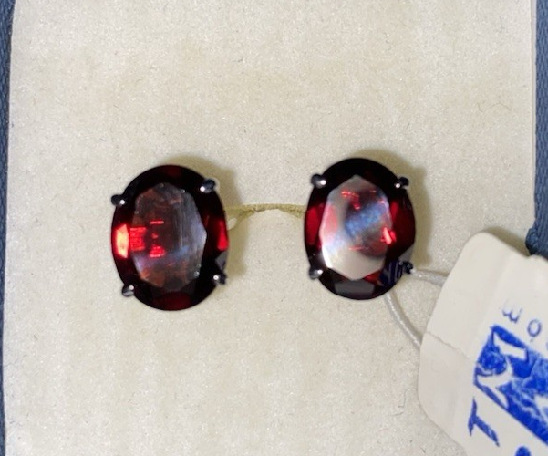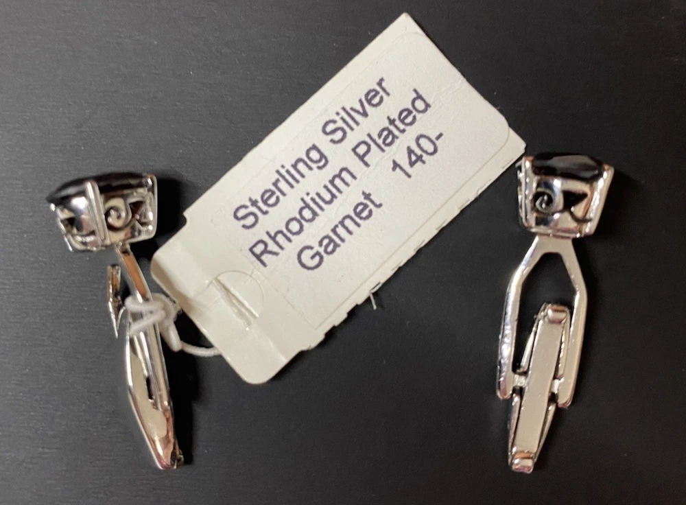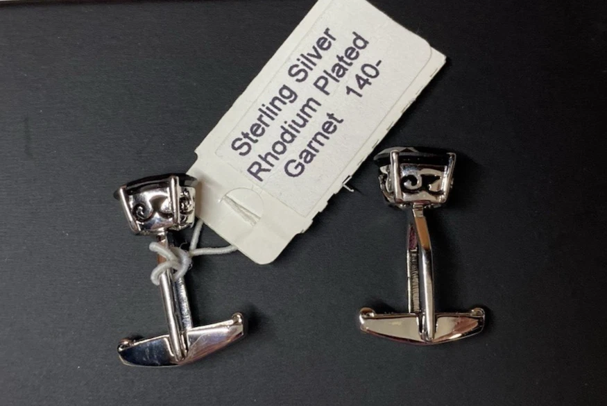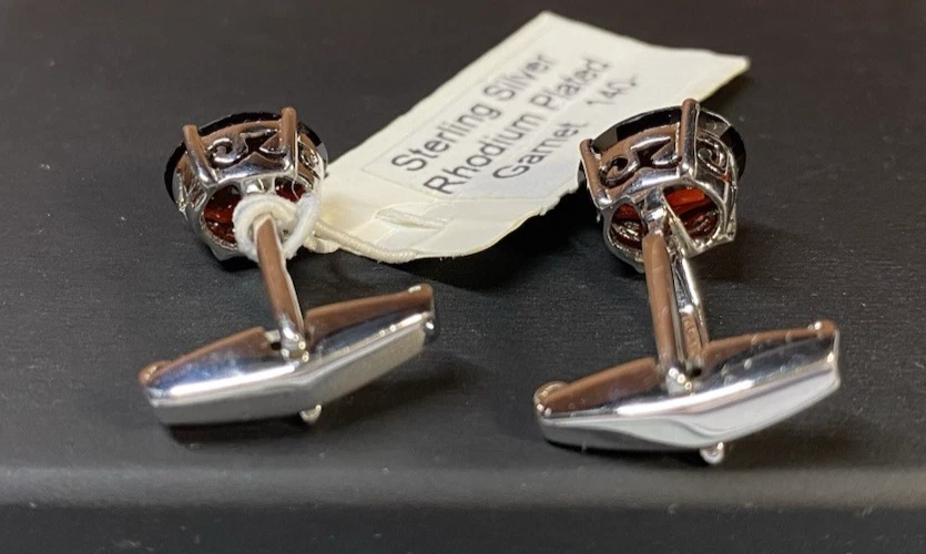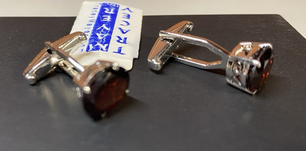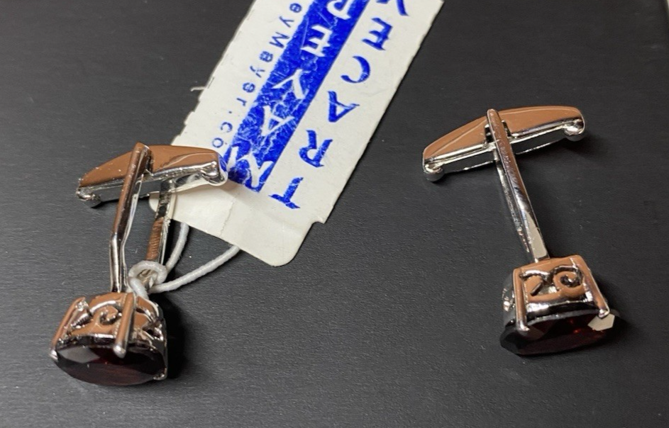 This is a set of high quality, well made designer cufflinks. Tracey Mayer is a Chicagoland artist that designed these in the early years of her career. This set exhibits her Beautiful stone selecting abilities, these large garnets are amazing. This striking set is stamped 925 and the tag states it is Rhodium plated. The original tag sells this set at $140.00. This would make an amazing fathers day gift. Enjoy!