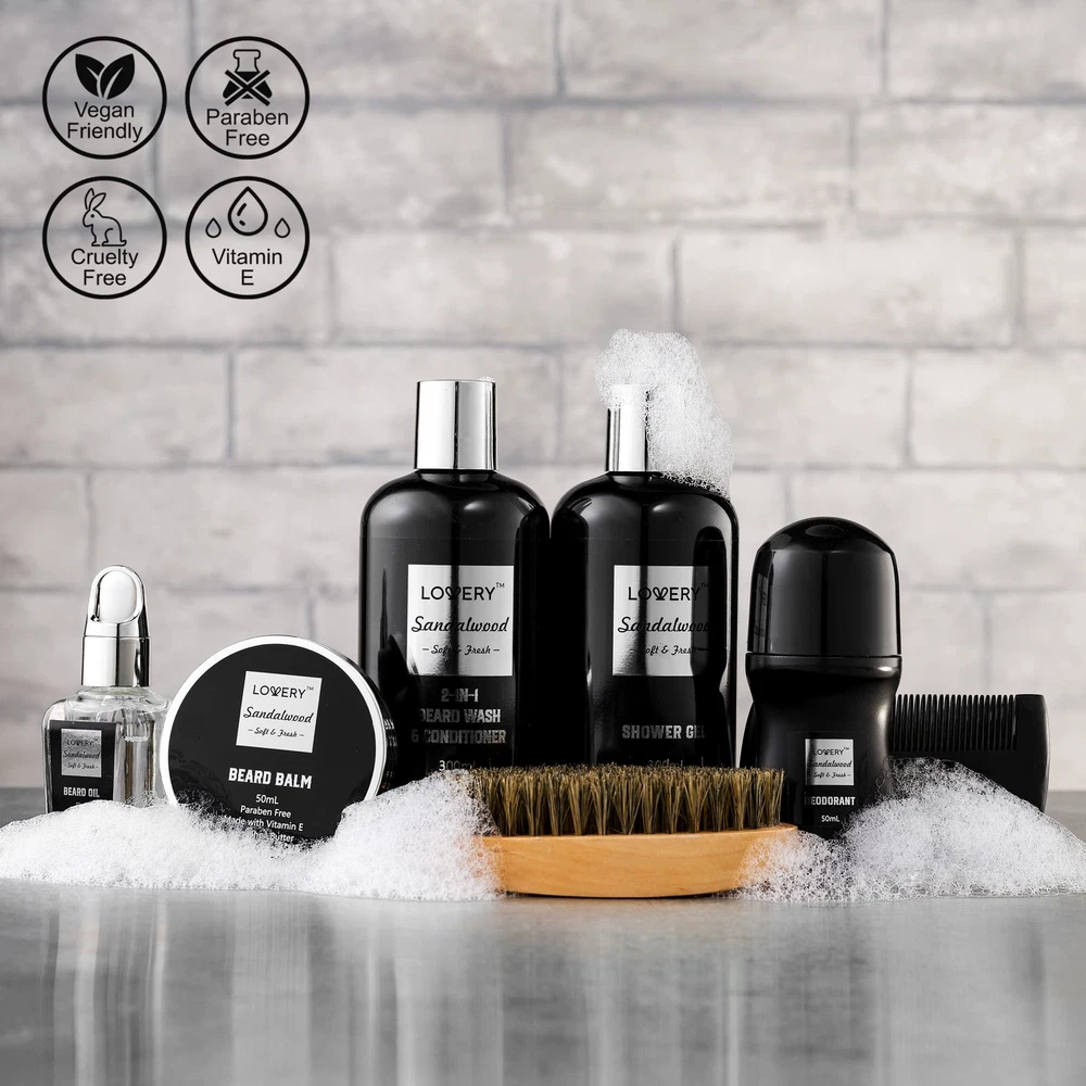 Give the men in your life a masculine spa treatment they can enjoy without leaving the comfort of their bathroom man cave. The 11pc Sandalwood Bath Gift Set includes everything a guy needs to pamper himself while no one is watching. From Shower Gel to Bath Salts & Beard Oil, this deluxe set has everything in it to let guys indulge in seriously soothing self care. 11 PIECE SET INCLUDES: 300ml Beard Wash and Conditioner 300ml Shower Gel 100g Bath Salts 90ml Beard Balm 30ml Beard Oil 50ml Deodorant Body and Beard Brush Mustache Comb Loofah Towel Black Tub Ribbon and Hangtag BENEFITS AND FEATURES: Full 11 piece set contains an assortment of lush bath accessories Smartly wrapped and packaged for a polished presentation Includes Brush and Comb for a groomed look Purely sourced ingredients, clearly displayed on packaging Formulated with Shea Butter & Vit E. to moisturize & protect 100% Paraben and Cruelty Free MASCULINE BATH GIFT SET This ultimate male self care gift bundle has everything needed to enjoy a deeply relaxing soak, followed by a spa-worthy Shaving Cream to complete the skin-nourishing experience. Every premium item in the set is jam-packed with skincare benefits. Leave the hustle & bustle of busy life behind with this extraordinary bath gift set. REVITALIZE WITH SANDALWOOD The calming aroma of sandalwood helps relax THE PERFECT GIFT FOR HIM Make him feel like a king on his special day. Every guy deserves a spa treatment from time to time. Perfect for Birthday, Christmas, Anniversary, Valentine’s Day, Father’s Day! At-Home Spa Session - Indulge in a relaxing and refreshing spa-like experience after a stressful day. This bath and body set provides a variety of men's products that will help you unwind for a change and works for all skin types. 11-PIece Bath Set - Pamper yourself with this collection of aromatherapy beard care products and enjoy some “me” time. This gift set comes complete with Beard Wash and Conditioner, Shower Gel, Bath Salts, Beard Balm, Beard Growth Oil, Loofah Towel, Body and Beard Brush, Wooden Mustache Comb, and Deodorant wrapped in a chic Black Tub with Ribbon and Hangtag. Relaxing Aromatherapy - You can effectively cleanse your skin and smell great too. The lovely aroma is pleasing to the senses and will make you feel thoroughly relaxed and refreshed. It is the best gift to give for your boyfriend, spouse or friend and delight them with these cool and funny gifts. Perfect Gift Set - This beautiful assortment of men's products will make a great gift for stocking stuffers for men, white elephant gifts for adults, birthdays, anniversary, wedding, holiday, father’s day and other special occasions. Give that special man in your life a gift that is sure to make him realize how special he really is. Premium Quality Ingredients - Every product is 100% Paraben and Cruelty-Free. These enriching beauty products are made with moisturizing Shea Butter and nourishing Vitamin E. They are safe even on sensitive skin! We’re confident you’ll fall in love with our beauty set.