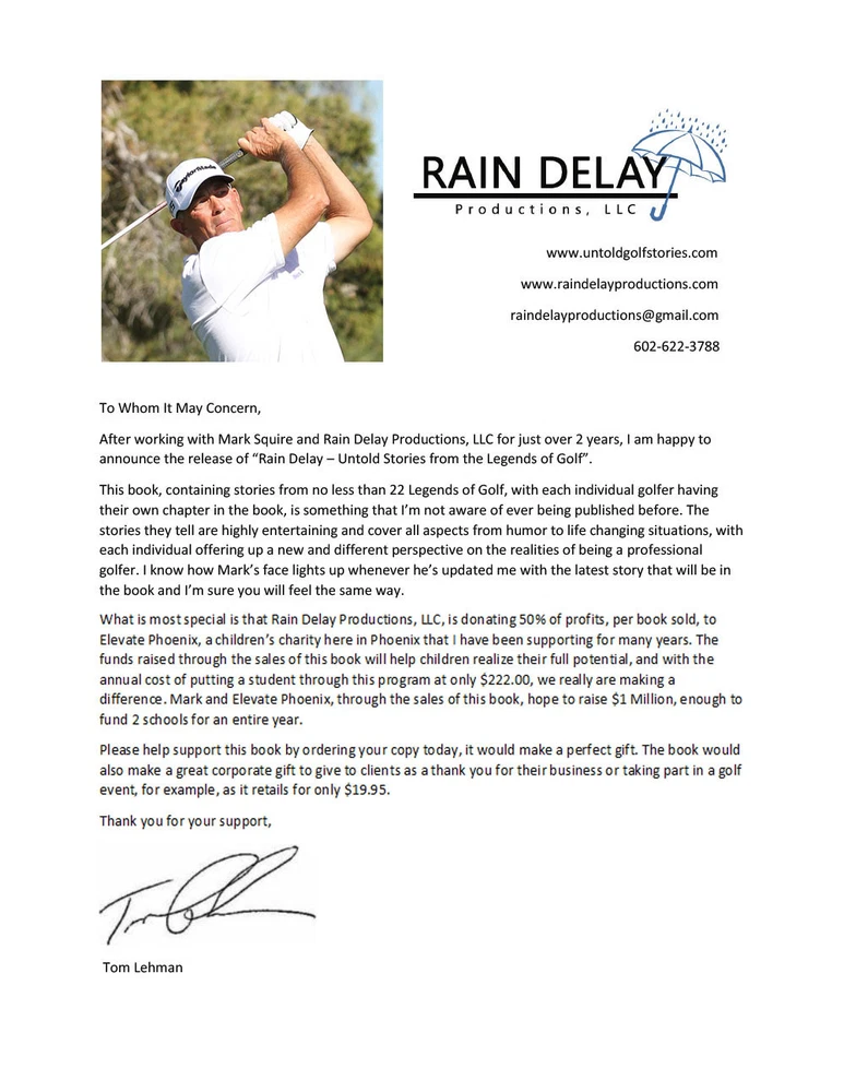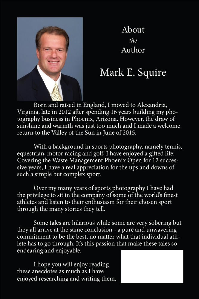 You are buying a limited availability book that only has printed the first 5,000 books in color. This book features untold stories from the Legends of Golf such as Jack Nicklaus, Gary Player Ben Crenshaw, Arnold Palmer, Lee Trevino, and Davis Love III. The book retails on Amazon for $19.95. 5 Star Review by: L. Charles Wimer III (Amazon customer review) " I absolutely loved this book that compromises many short stories by golfing legends. This is truly what golf is about and makes you appreciate why you play this fascinating game. The stories by these superstars are down to earth and provides some insight as to who these gentlemen really are/were. The pages fly by. I really wish more books like this were published. John Feinstein also does a tremendous job with his writing. Golf is so much more than a game and Rain Delay confirms that point. Anyone who loves golf will really love this book — especially those of over 50 (who have watched many of these guys play). I can’t wait for volumn 2 and/or Mr. Squire next book." 5 Star Review by: Erin K MocDonald (Amazon customer review) "Great book with many fun short stories by golfing legends. This book would make a great gift fo the golf lover in your life." The book is in English and contains 158 pages. Big font, easy to read. Rain Delay Untold Stories from the Legends of Golf The skies start to darken and you feel the first drops of rain as they hit your hands and face. The caddy reaches for the umbrella and you hear a very faint rumble in the distance. Maybe you’re having a stellar round and you pray that you don’t lose the “zone” that you’re in. It could be that you’re playing below par and a suspension of play is just what you are banking on in order to regroup. Then it happens—the ominous sound of the claxon signaling that the decision has been made for you. Different golfers will have different reactions. “Man, I’m killing this course. Why now?” one guy will think whereas another might already be mentally dissecting his game to try to find out where he’s going wrong. As all the players make their way back to the clubhouse you can guarantee they won’t share the same thought. How different players with different personalities deal with this situation varies widely, some seeking solitude while others seek companionship and break out the deck of cards. As they begin to relax, personal stories of their endeavors start being told with some being serious and others humorous. We, the public, never really know what’s talked about but in this collection of anecdotes from professional players, we might get a slight glimpse of who these people really are. About the Author Born and raised in England, I moved to Alexandria, Virginia, late in 2012 after spending 16 years building my photography business in Phoenix, Arizona. However, the draw of sunshine and warmth was just too much and I made a welcome return to the Valley of the Sun in June of 2015. With a background in sports photography, namely tennis, equestrian, motor racing and golf, I have enjoyed a gifted life. Covering the Waste Management Phoenix Open for 12 successive years, I have a real appreciation for the ups and downs of such a simple but complex sport. Over my many years of sports photography I have had the privilege to sit in the company of some of the world’s finest athletes and listen to their enthusiasm for their chosen sport through the many stories they tell. Some tales are hilarious while some are very sobering but they all arrive at the same conclusion - a pure and unwavering commitment to be the best, no matter what that individual athlete has to go through. It’s this passion that make these tales so endearing and enjoyable. I hope you will enjoy reading these anecdotes as much as I have enjoyed researching and writing them.