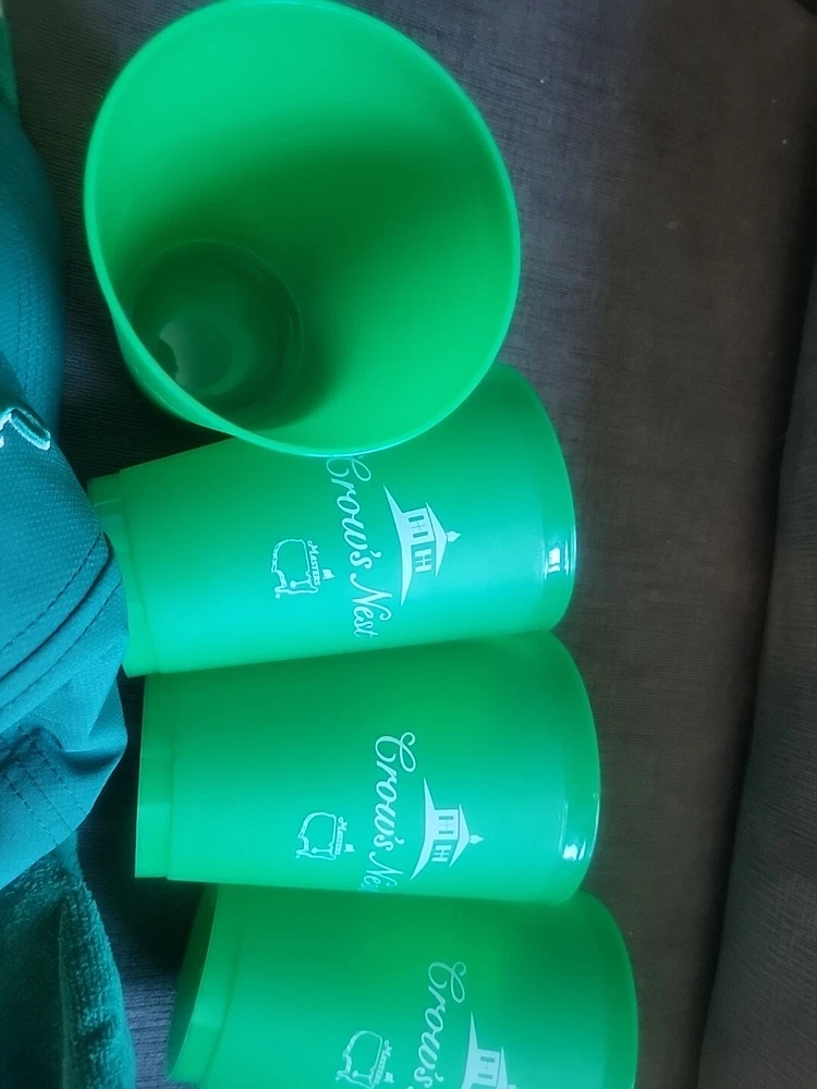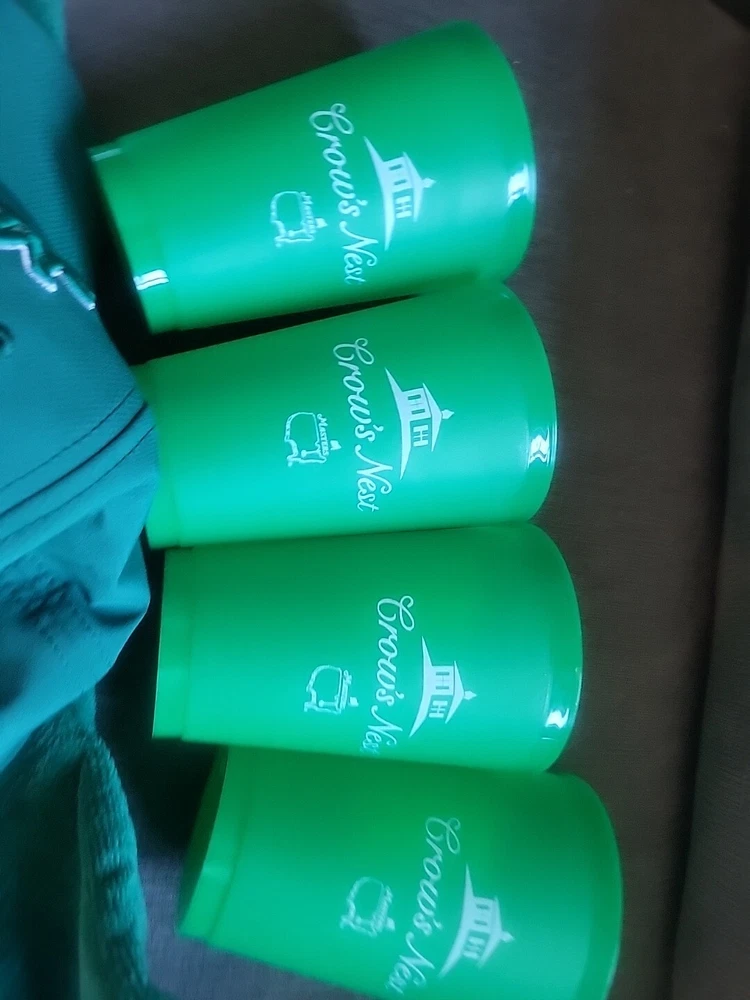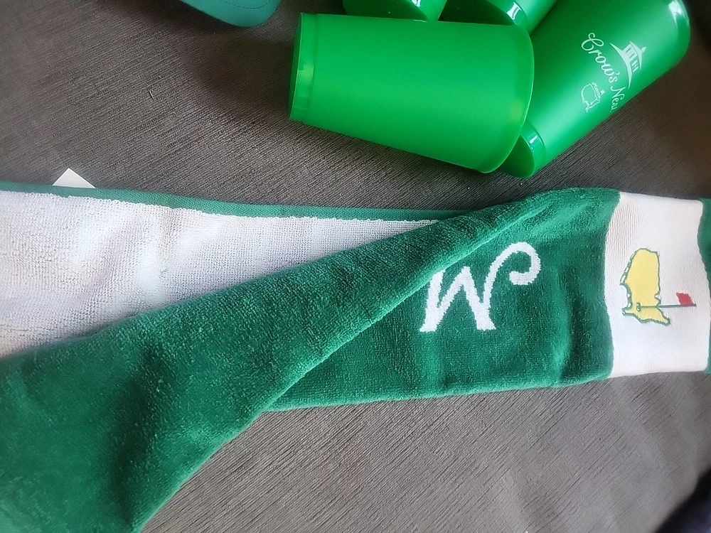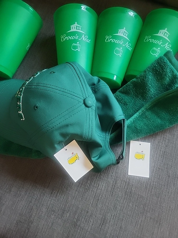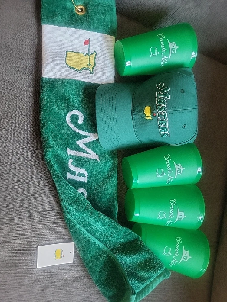 Get ready for Father's Day with this exciting golf package from the Masters tournament. The set includes a green nylon and hat, four cups, and a matching towel, all with an embroidered Masters logo. Perfect for any golf enthusiast, this set is a must-have for any Father's Day gift. Whether you're hitting the links or just need some stylish accessories for your golf bag, this Masters golf hat and towel set is the perfect choice. Brand new and in pristine condition.