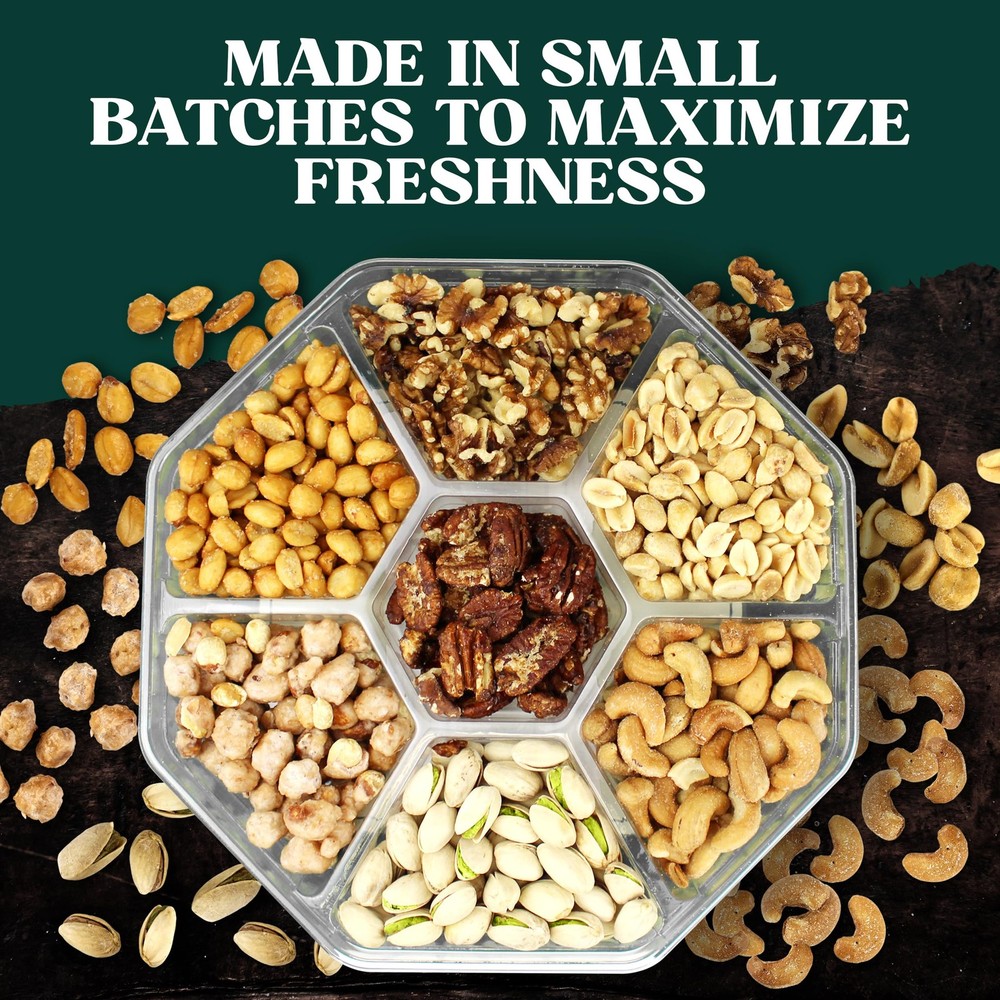 Fathers Day Nuts Gift Basket - Have you been trying to think of a great gift that you can give to a loved one, coworker, or someone else in your life? Wouldn’t it be great to order a gift online and have it get delivered right to this person’s doorstep? If you answered YES to either question, then you’re going to love what we have to offer here at ! The first time you sink your teeth into the nuts in this spread, you’ll instantly be able to tell that we do things differently at . Nothing out of a can here! We only use nuts that are hand-picked at the right time to maximize freshness and flavor. When this gourmet gift box arrives to you (or a lucky friend or family member) they’ll be ultra-fresh. Each platter will contain a mouth-watering mix of peanuts, cashews, pistachios, walnuts, and so much more. We’re warning you, it’s very difficult to each just one! Trust us, we’ve tried! We don’t just select the freshest, most delicious nuts; we create stunning platters. Our presentation is second to none. We take the time to meticulously present them in a high-end gift platter that is sure to impress. Remember, we eat with our eyes first. This nut gift basket is great for Thank You, Anniversaries, Birthdays, Christmas, Get Well Soon, Sympathy, and many other special occasions. Product Features & Benefits: Unique variety packs of gourmet nuts Contains only the freshest, tastiest nuts Come beautifully presented in a gift platter Perfect gift idea for many special occasions Shipped securely & ultra-fast through Amazon Prime You’d be nuts not to click the “Add to Cart” button above to send platter to someone in your life! PACKED WITH FRESH, FLAVORFUL, NUTRITIOUS NUTS: Fathers Day Gift Basket - This dried nut care package is going to be a massive hit. This 7 section platter contains a variety of mouthwatering nuts; all beautifully presented in a high-end gift box. MADE IN SMALL BATCHES TO MAXIMIZE FRESHNESS: Quality is very important to us. Order confidently knowing that all the nuts on this food tray are hand-selected in small batches for maximum flavor and freshness. Each bite will be more delicious than the last. THERE’S SOMETHING FOR EVERY NUT LOVER INSIDE: If the lucky recipient(s) enjoy nuts, then they’ll go nuts over this gift. Our mixed nuts gift boxes contain peanuts, cashews, pistachios, walnuts, and so much more.. NUTRITIOUS AND SATISFYING SNACK: Packed with protein, healthy fats, and essential nutrients, this assortment offers a wholesome and tasty treat for any time of day.