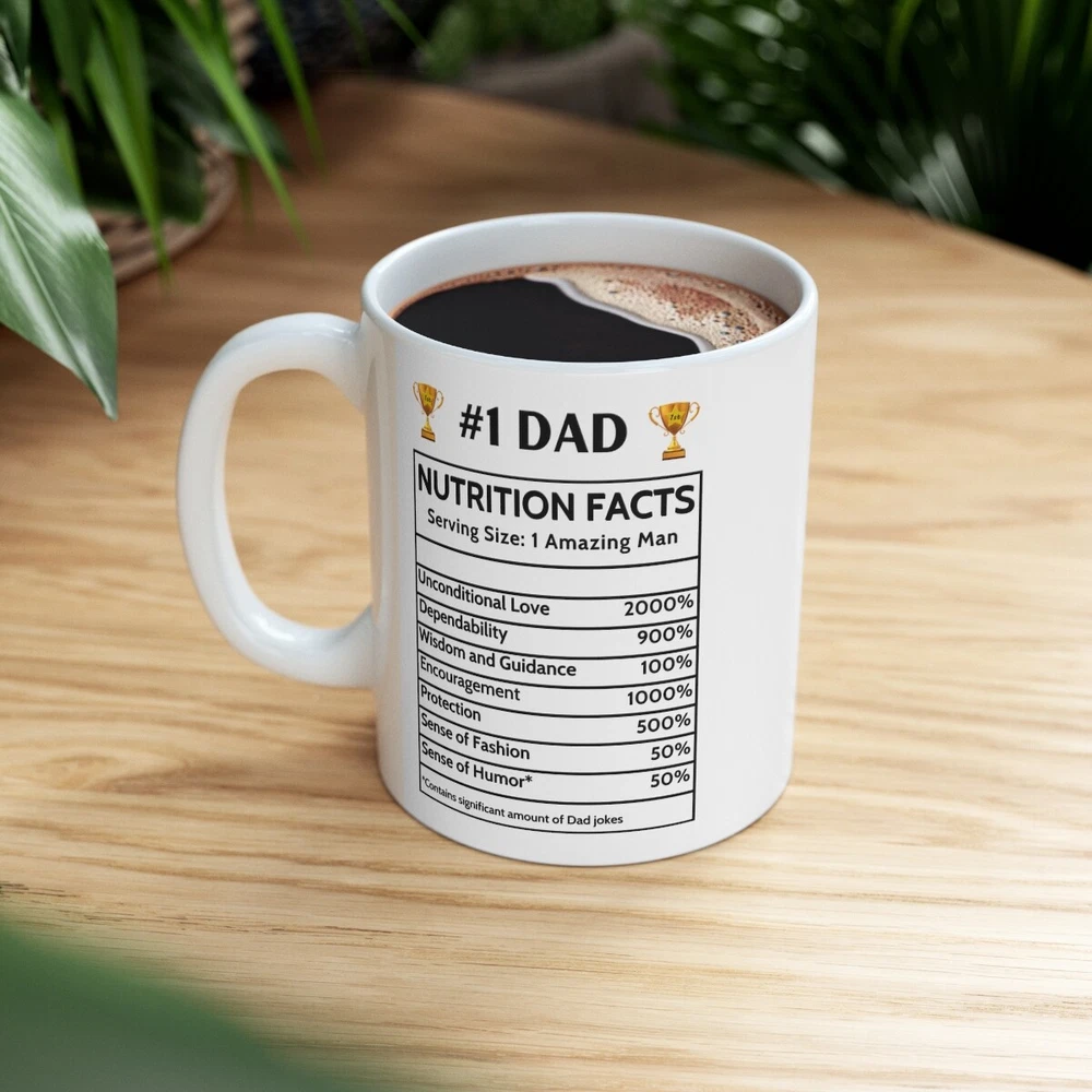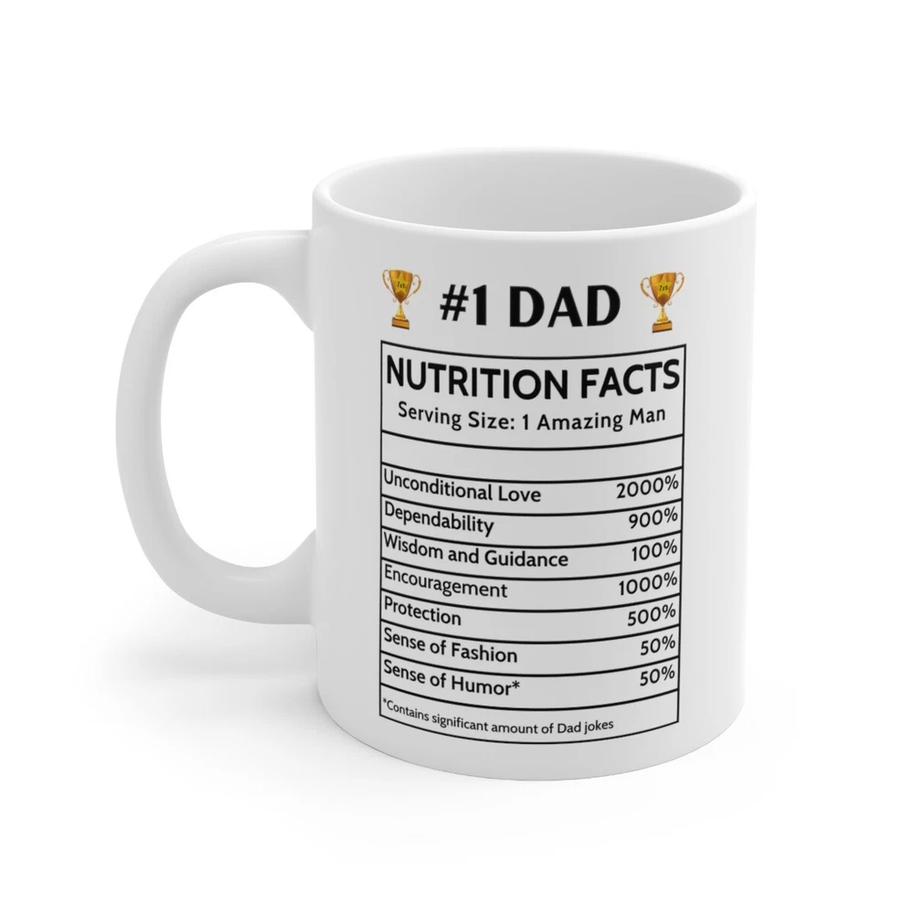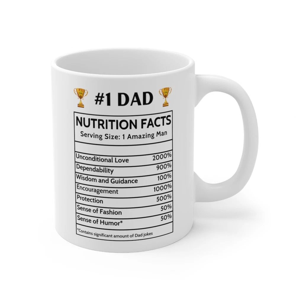 A humorous, cute and touching Fathers Day Gift or a Birthday gift for Dad from a son or a daughter. Let your Dad know he's the best! He will see that message every day, and so will everyone else around him. Every time he sips on that cup of mocha, he will be reminded of your appreciation of him, and he will know his kids really love him. The design is on both sides of the mug. If you wish to personalize one of the sides (e.g., replace the design with a photo of your dad or text of your choosing), please let me know. - White ceramic - #1 Dad Nutrition value graphic - Design is on both sides - Glossy finish - C-handle - 11 oz (0.33 l) - Rounded corners - Microwave and dishwasher safe - Lead and BPA-free *Sustainability Commitment: All of our products are made only upon purchase. This practice helps us prevent excess inventory and avoid waste. Mugs are shipped in polystyrene boxes that are easy to use and provide all-round secure protection, including a slot for the handle. The packaging has been specifically designed to keep the mug intact during transit. Father's Day - Nutritional value Mug with trophy Cup Gift from Daughter or Son, Child, Daddy's Birthday Gift, father's day mug cup humorous dad gift, funny daddy mug fathers day present from daughter son, Father birthday tea coffee cup, best gift for papa, aesthetic mug.