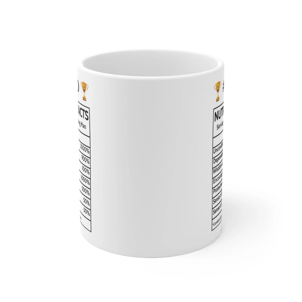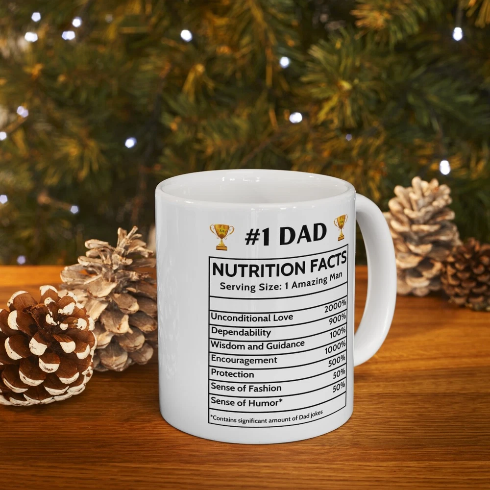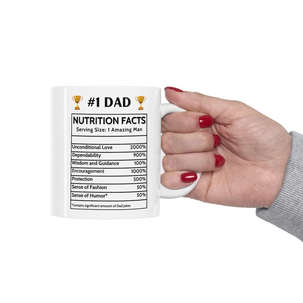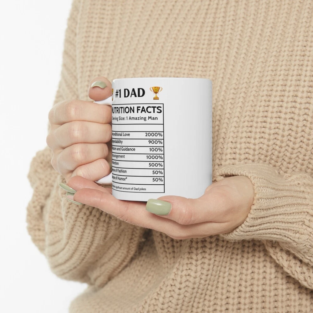 A humorous, cute and touching Fathers Day Gift or a Birthday gift for Dad from a son or a daughter. Let your Dad know he's the best! He will see that message every day, and so will everyone else around him. Every time he sips on that cup of mocha, he will be reminded of your appreciation of him, and he will know his kids really love him. The design is on both sides of the mug. If you wish to personalize one of the sides (e.g., replace the design with a photo of your dad or text of your choosing), please let me know. - White ceramic - #1 Dad Nutrition value graphic - Design is on both sides - Glossy finish - C-handle - 11 oz (0.33 l) - Rounded corners - Microwave and dishwasher safe - Lead and BPA-free *Sustainability Commitment: All of our products are made only upon purchase. This practice helps us prevent excess inventory and avoid waste. Mugs are shipped in polystyrene boxes that are easy to use and provide all-round secure protection, including a slot for the handle. The packaging has been specifically designed to keep the mug intact during transit. Father's Day - Nutritional value Mug with trophy Cup Gift from Daughter or Son, Child, Daddy's Birthday Gift, father's day mug cup humorous dad gift, funny daddy mug fathers day present from daughter son, Father birthday tea coffee cup, best gift for papa, aesthetic mug.