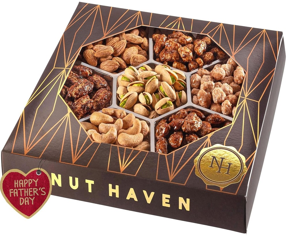 Fathers Day Nuts Gift Basket - Extra Large Assortment of Sweet & Roasted Salted Gourmet Nuts - Assorted Food Gift Box for Husband, Dad, Him, Fathers Day, Family, Sympathy, Men & Women. Product Details Product Dimensions : 10 x 10 x 2 inches; 1.8 Pounds Manufacturer : Nut Haven Units : 1 Count Brand: Nut Haven Package Information: Basket,Box,Pack Number of Items: 1 Flavor: Extra Large Nuts Gift Basket Item Weight: 1.8 Pounds ELEGANTLY PACKAGED GIFT BASKET LOADED WITH TASTY NUTS - Forget flowers and chocolate, give a gift that’s delicious and healthy! In this bundle pack of Healthy Snacks, you get approximately 1.8 LB of tasty gourmet nuts meticulously packaged in a boutique-style gift box. VARIETY OF FRESH TASTY NUTS FOR EVERYONE TO ENJOY – The deluxe mixed nut box contains Toffee Peanuts, Glazed Almonds, Roasted Salted Almonds, Dry Roasted Salted Pistachios, Glazed Peanuts, Roasted Salted Cashews, and Glazed Pecans. THERE ARE TREATS... AND THEN THERE ARE NUT HAVEN TREATS! - Batches of nuts may look the same to most of us, but the mavens at Nut Haven know the difference between a typical treat and a gourmet edible delight. The only items that make it into a Nut Haven basket are carefully selected nuts that are naturally rich, ideally textured and roasted OR sweetened with the perfect flavor. MOUTH-WATERING GIFT IDEA FOR A VARIETY OF OCCASIONS – Out of this world gift idea of any occasion like Corporate Events, Holidays, Birthdays, Christmas, Thank You, Sympathy, Get Well, Father's Day, Mother’s Day, Easter, and more! ✅ SPECIFICATIONS – Package dimensions: 10x10x1.9. Net weight: Approximately 1.8LB. OK Kosher Certified, Vegan.