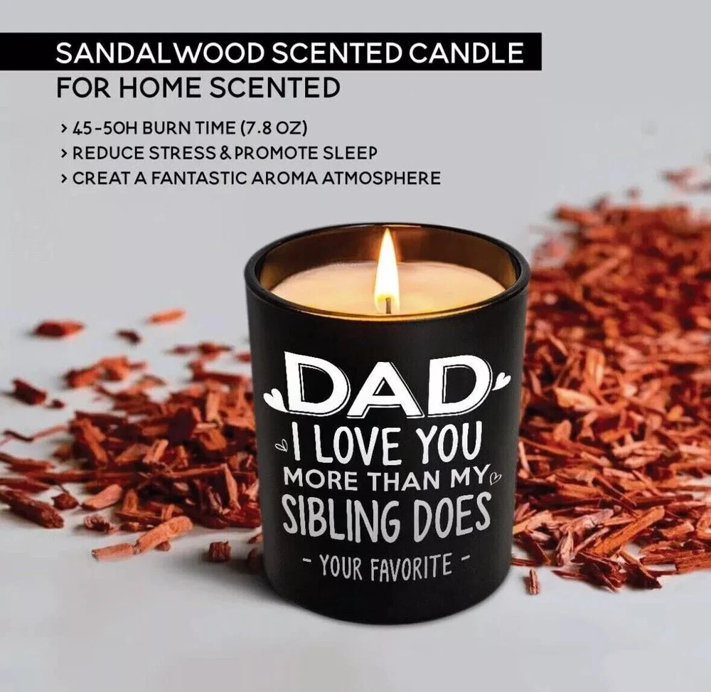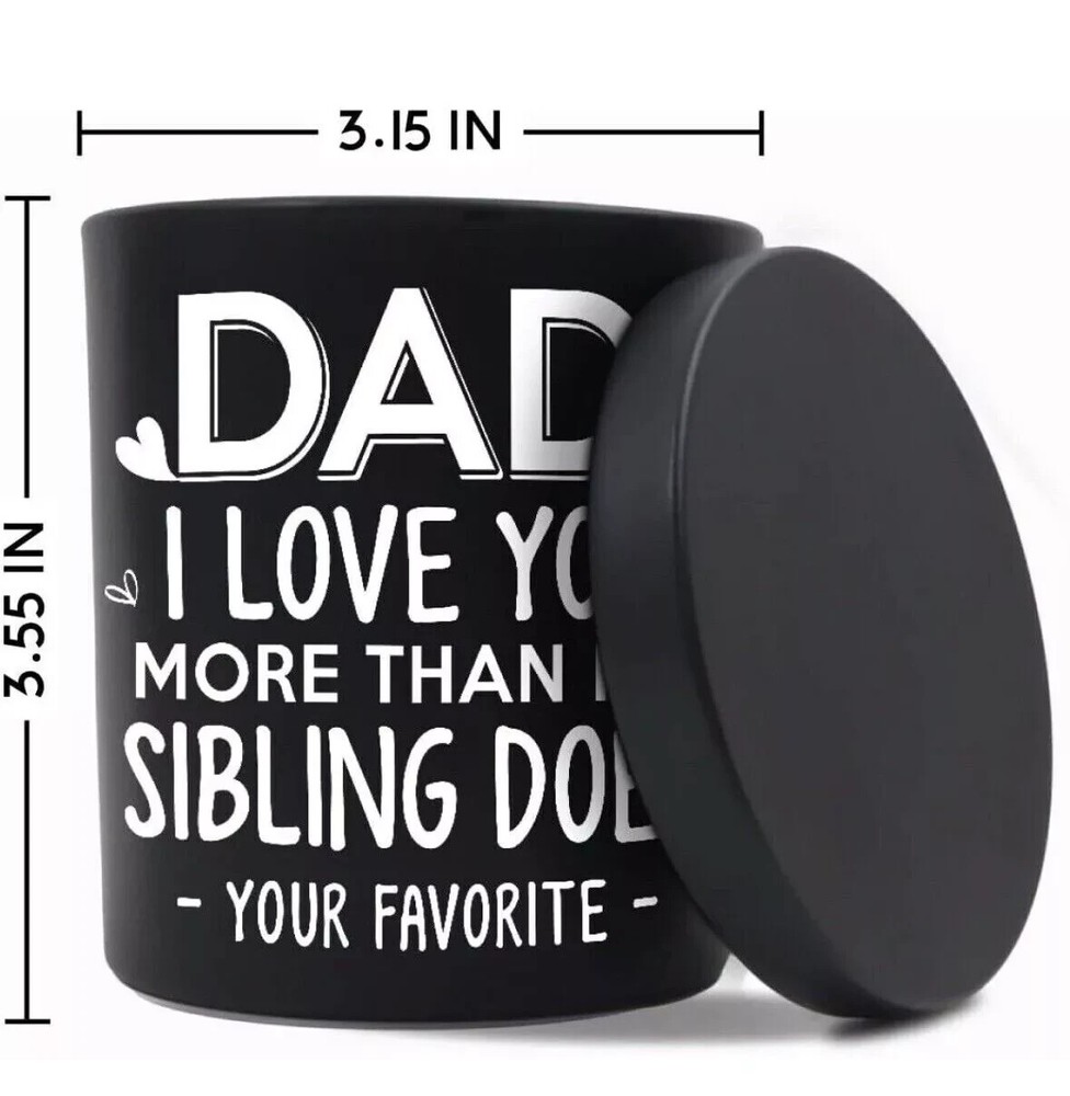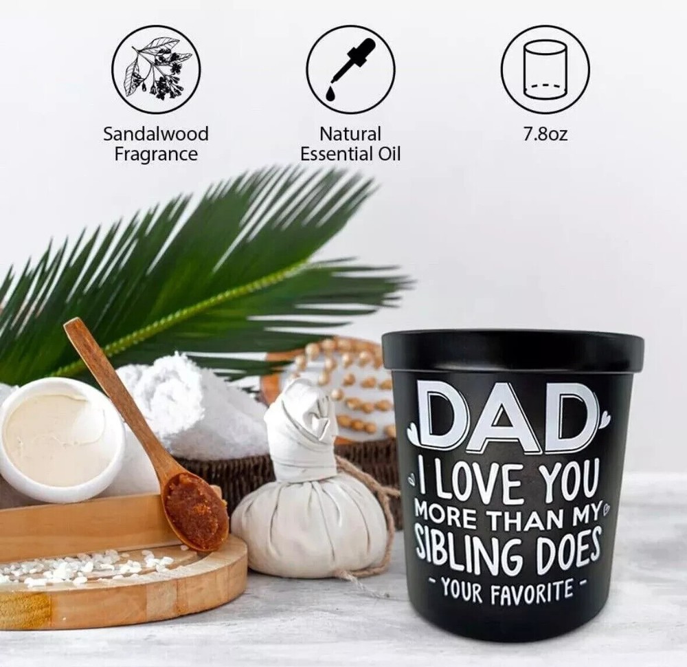 Fathers Day Gift, Gifts for Dad on Christmas from Daughters, Son, Kids - Dad Gifts - Dad Birthday Gift - Birthday Gift for Dad, Meaningful Present for Dad - Soy Wax 7.8 oz Condition: NEW Same Day Shipping This funny sandalwood soy candle with a humorous saying: Dad, I Love You More Than My Sibling Does - Your Favorite -. It is a great and cool gifts idea for dads from kids. Also, good gifts show your appreciation and love for your dad who has everything. HAPPY DAD BIRTHDAY GIFT - Classic jar candle is a fun birthday gift for men. Specially designed gifts for dad, stepdad, father, father in law, daddy, Papa, boyfriend, husband, new dad, bonus dad, new father, fist time dad, foster dad, grandpa, dad funny gag gifts from daughter, wife, baby girl, or kids. 100% NATURAL SOY WAX - This unique Sandalwood candle is made of 100% natural soybean wax and a cotton wick. It is non-toxic and harmless, create with a fresh fragrance without black smoke, and maintains 50-60 hours long lasting. A RELAXING GIFTS FOR MEN - Premium sandalwood scented candle is great for sleep-promoting and relief from anxiety, depression, and stress; A perfect addition to bathroom, bedroom, kitchen, living room, office etc. Funny gift for men in your life to creat a stressless and comfortable life. Dad Candle Gifts for Dad from Daughter Son Birthday Gifts for Dad for Fathers Day 7.8 Oz Sandalwood Scented Candles Bday Christmas Presents Eco-Friendly Long Lasting Natural Soy Max