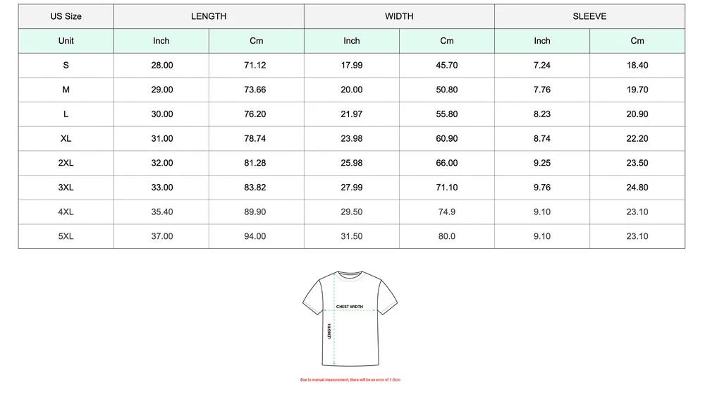 DESCRIPTION This heavy cotton tee has the classic cotton look and feel. Casual elegance will make it an instant favorite in everyone's wardrobe. FEATURES Unisex Heavy Cotton Tee (Gildan 5000) Classic fit 100% Cotton (fibre content may vary for different colors) Light fabric (5.3 oz/yd² (180 g/m²)) Tear away label Runs true to size Shipping Information LOCAL SHIPPING (printed in US) USA - Shipping up to 3 - 7 business days INTERNATIONAL SHIPPING (printed in Germany or Czech Republic) Germany or Czech Republic - Shipping up to 3 - 7 business days Europe - Shipping up to 7 - 14 business days Other Country - Shipping up to 14 - 30 business days SIZE CHAT # S M L XL 2XL 3XL 4XL 5XL Width, in 18 20 21.97 23.98 25.99 28 30.04 31.97 Length, in 28.51 29.49 30.52 31.5 32.52 33.51 34.49 35.52 Sleeve length, in 7.52 7.76 8.23 8.75 9.26 9.77 10.24 10.75 Thanks for Shopping!