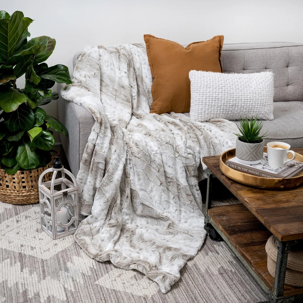 VERY HIGH QUALITY throw blanket for bed or couch | soft plush faux blanket throw with a luxury blanket feel | snuggly, warm and cozy, natural neutral colors, | luxurious faux fur farmhouse throw with white polyester micro mink reverse side GIVE YOUR ROOM THE WOW FACTOR - with our elegant high end design bed throw or chair throw | drape your elegant blanket throw over a chair, couch or bed to add a stylish touch | Has a neutral tone - cream and pale caramel and white throw blanket with a marbled look | goes with any house decor. ALL SEASON BLANKET THROW - You'll want one for each family member | add extra warmth to your bed | use as a travel blanket | use it in the car for the kids to help them sleep | or as a comforting toddler blanket | Great as a guest room blanket | Even the pets love it - and it doesn't show pet hair! SPECIAL GIFT - A thoughtful anniversary, birthday, christmas, or housewarming present. Lovely gift for mom for mothers day | 55" x 70" extra generous size | ultra-soft faux fur throw blanket is 100% polyester faux fur | easy maintenance, cool machine wash and drip dry HAPPINESS GUARANTEED - we will refund you if you're not 100% happy | We want you to come back to over and over.