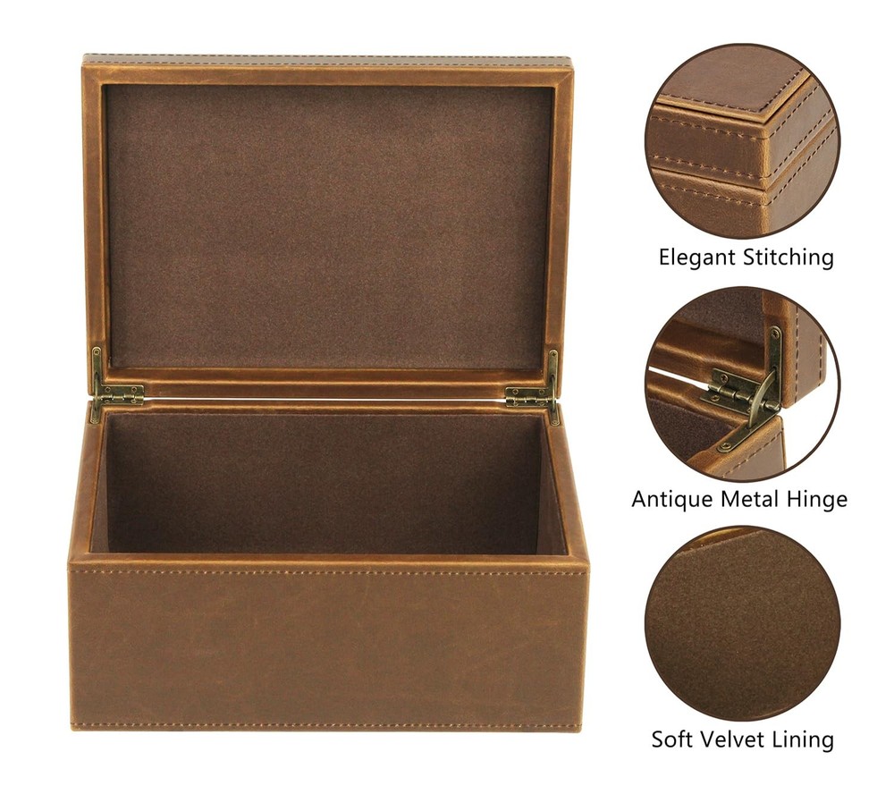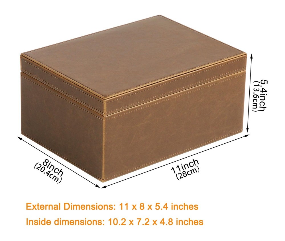 Introducing the Large Wooden Structure Keepsake Box - the perfect accessory organizer for your home or office! This decorative box features a sleek and modern design, made from high-quality faux leather with a sturdy wooden structure. The hinged lid provides easy access to your belongings, while the interior is spacious and organized with multiple compartments and dividers. Whether you're looking for a jewelry organizer, a storage box for small items, or a keepsake box for precious memories, the Large Wooden Structure Keepsake Box has got you covered. With its versatile design and sturdy construction, it's a must-have accessory for anyone who values style and functionality. Multi-purpose storage: Faux Leather Decorative Box can store a wide range of items, making it great for organizing your home or office space. Large Capacity: the dimensions of the decorative storage box are 11x8x5.2 inches / 28x20.3x13.2 cm (L x W x H). Timeless design: The antique style storage box with lid boasts a classic and elegant look that will blend in with any decor, making it a stylish keepsake box that complements any environment. Allowing you to organize your items neatly and easily. The hinged lid provides easy access to your belongings while keeping them securely stored. Ample storage space: The large wooden box with hinged lid is spacious enough to store all your necessities, configurations, and personal items, without taking up too much space on your desk or shelf, providing ample space for storing various items such as jewelry, cosmetics, accessories, craft supplies, office supplies, and more. Premium Material: The storage box is made of faux leather, which not only looks elegant but also feels soft and comfortable to the touch. The sturdy wooden structure ensures the long-lasting use of the box while maintaining its functional and decorative purpose. A perfect gift: Surprise your loved ones with this stylish decorative box that is a perfect keepsake box for special moments and occasions, with the recipient cherishing it for years to come.