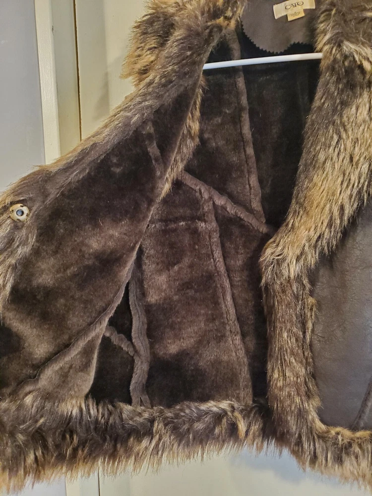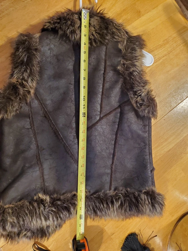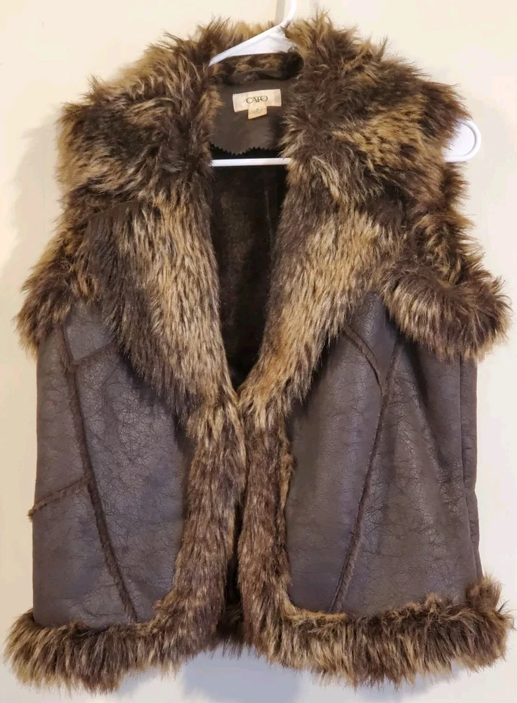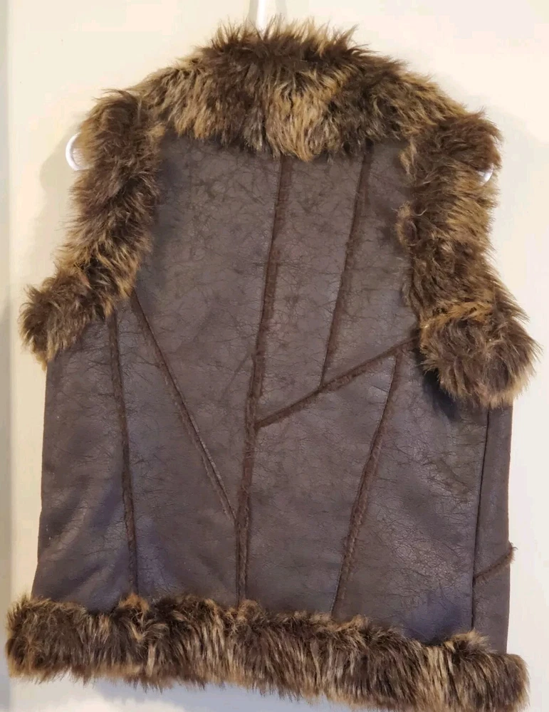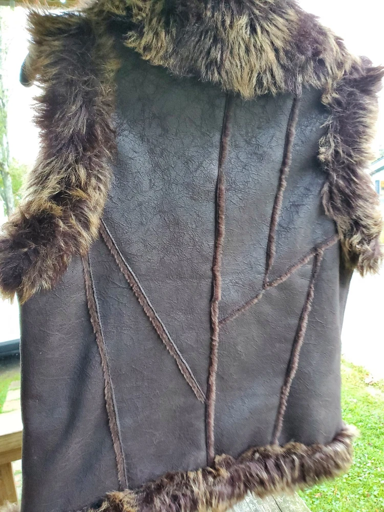 Faux Leather Fur Vest - Small This short vest features a single snap closure, sleeveless design, and a faux fur collared neckline. The brown color, accented with fur trim, adds a touch of tribal and steampunk themes to your outfit. Perfect for the Faire to dress up as a Barbarian, Viking, or Norse warrior. Machine washable and made with polyester lining material, this regular-fit vest is easy to care for. Made by Cato.
