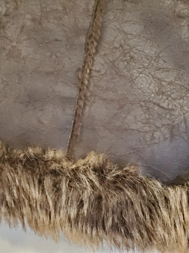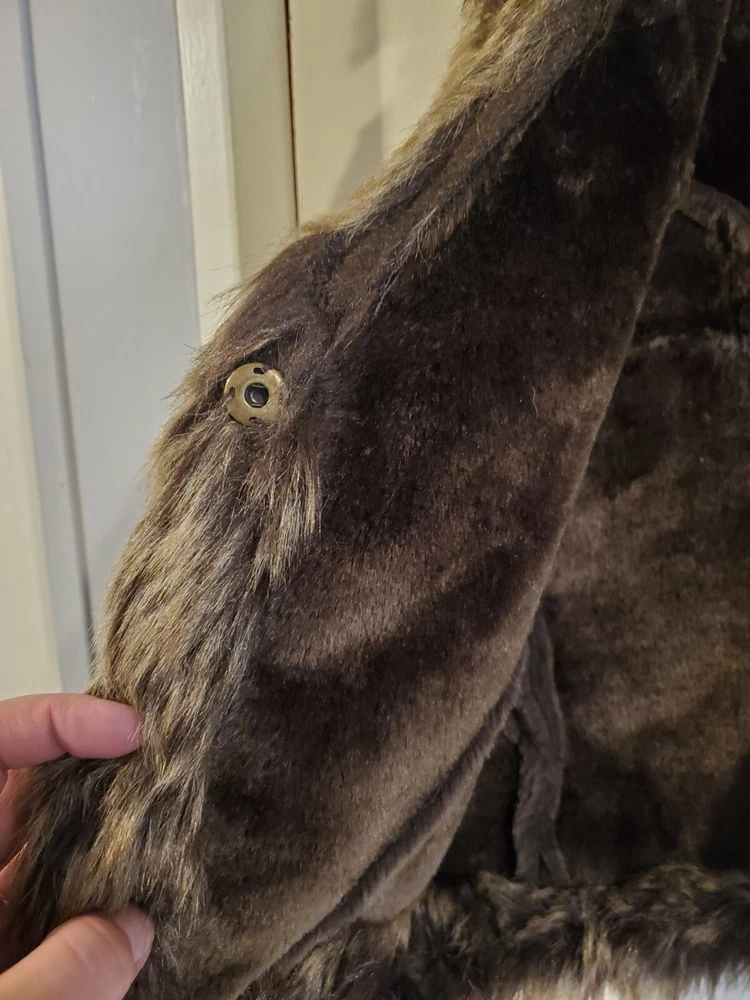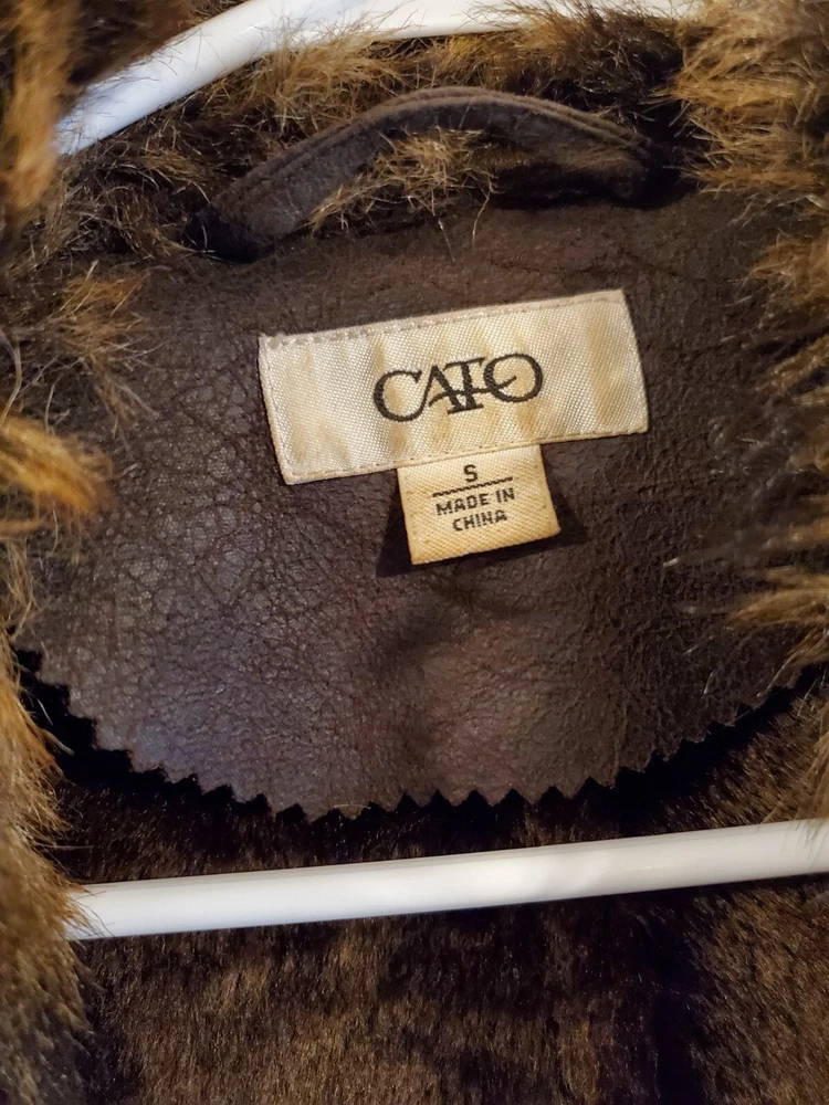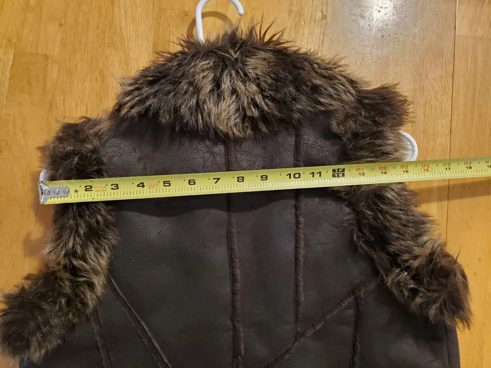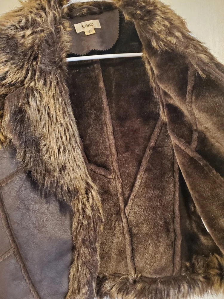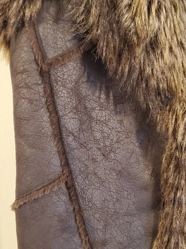 Faux Leather Fur Vest - Small This short vest features a single snap closure, sleeveless design, and a faux fur collared neckline. The brown color, accented with fur trim, adds a touch of tribal and steampunk themes to your outfit. Perfect for the Faire to dress up as a Barbarian, Viking, or Norse warrior. Machine washable and made with polyester lining material, this regular-fit vest is easy to care for. Made by Cato.