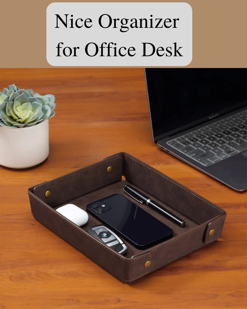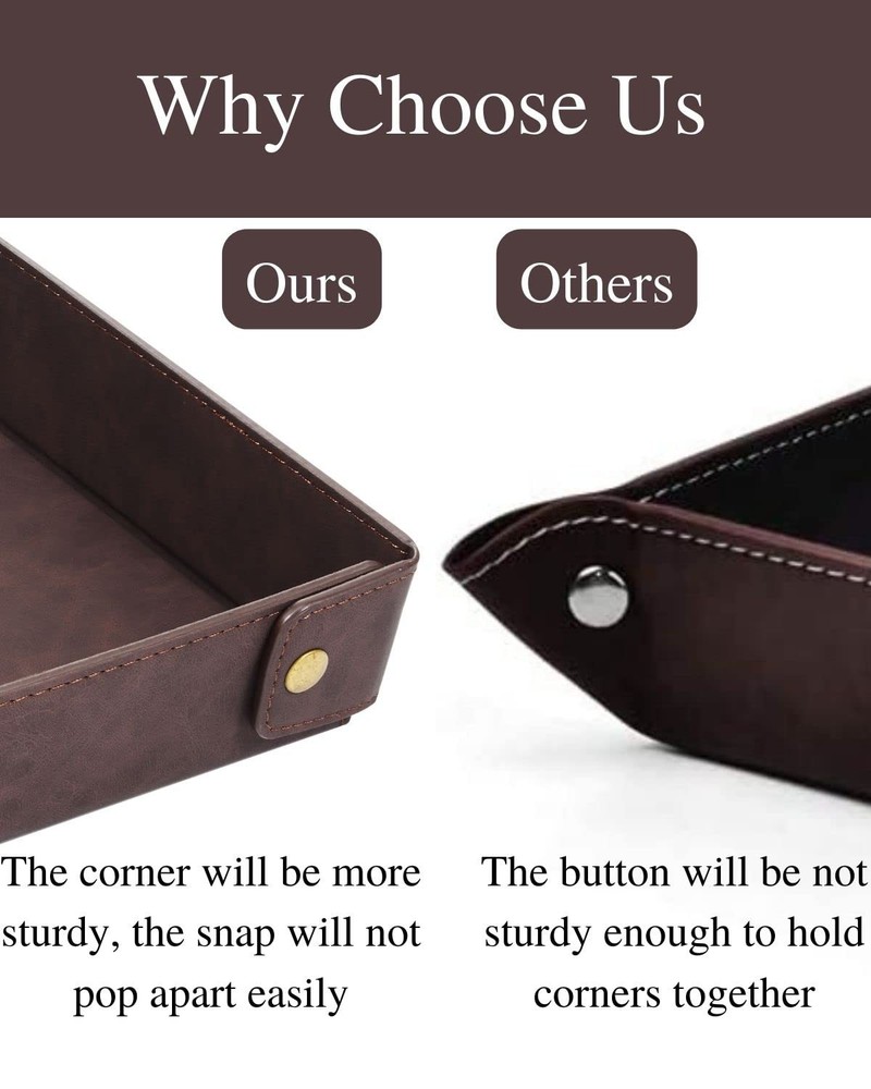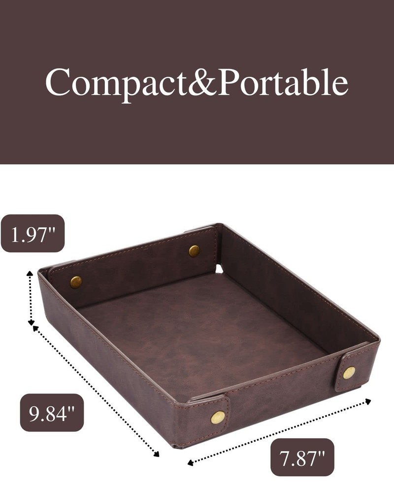 I don't know whether you have such an experience that I do not know where I have ever put them when I want to find my keys or eyeglass and other small items. Especially the morning when I need to go to work or school. So why not find a valet tray organizer, when you go home, put all the little but important stuff in it, no matter when you can find them, keep a neater life so that you will be more efficient in the future. valet tray EDC dump tray is designed for daily use and it helps you to reach out your belongings easily whether you are in your home or office, This tray prevents those unnecessary morning searches for misplaced items Features Made of soft and good PU leather this valet tray will not hurt your expensive items, it is also very durable Premium Workmanship sturdy enough to hold it together. They will not pop apart against the sides of the valet Easy to Assemble and good snap clasp Buttons-assemble construct design, catchall tray is easy to assemble and more sturdy Multi-Occasion Applicable you can use it as a dice tray for board games, EDC dump tray, caddy holder for key, Coin, Wallet, Watch, Eyeglasses, spare change, organizer for TV stick, remote control, men's bedside organizer Ideal Gift A Valet tray can be a nice gift to your friend, family, colleague Specification Weigh: 6 oz Size: 9.84 × 7.87 × 1.97 inches when snapped, 13 × 11.42 × 0.2 inches when unsnapped Material: 100% PU leather Closure Type: Snap Color: Dark green/Royal blue/Brown coffee/Vintage yellow You Will Get 1× Valet Tray-EDC dump tray Please Note: Colors shown in pictures may slightly differ from the actual product due to lighting and color settings 【Compact Valet Tray Organizer】9.84 × 7.87 × 1.97 inches when snapped, 13 × 11.42 × 0.2 inches when unsnapped, limited space to keep your small but essential item in place, not only for home and office use but for travel 【Premium Material for Valet Tray】Feature soft and premium PU leather, our valet tray is no scratch to your watches, eyeglasses, sunglasses, and other expensive jewelry. What's more, it is also easy to clean 【Easy to Assemble Our Valet Tray】Features buttons-assemble construct design and exquisite workmanship, Our valet tray organizer is easy to assemble and more sturdy to keep snap stay together 【Valet Tray for Multi-Occasion】You can place our valet tray on your home TV room, office desk, bedroom nightstand, living room, dresser top desk, the entryway of your house, and more to organize and store your TV remote control, keys, coins, wallet, phone, dice, EDC, and other small items 【Nice Gifts for Your Love】A nice gift to your friend, family, classmate, and students when graduating ceremony, Mother's day, father's day, anniversary, birthday, thanksgiving day, Christmas, Valentine’s day, and more. Most importantly, our valet tray organizer supports laser engraving, you can turn it into a unique commemorative gift (After it’s been received), it is also a good gift to yourself that keeps your life and work neater