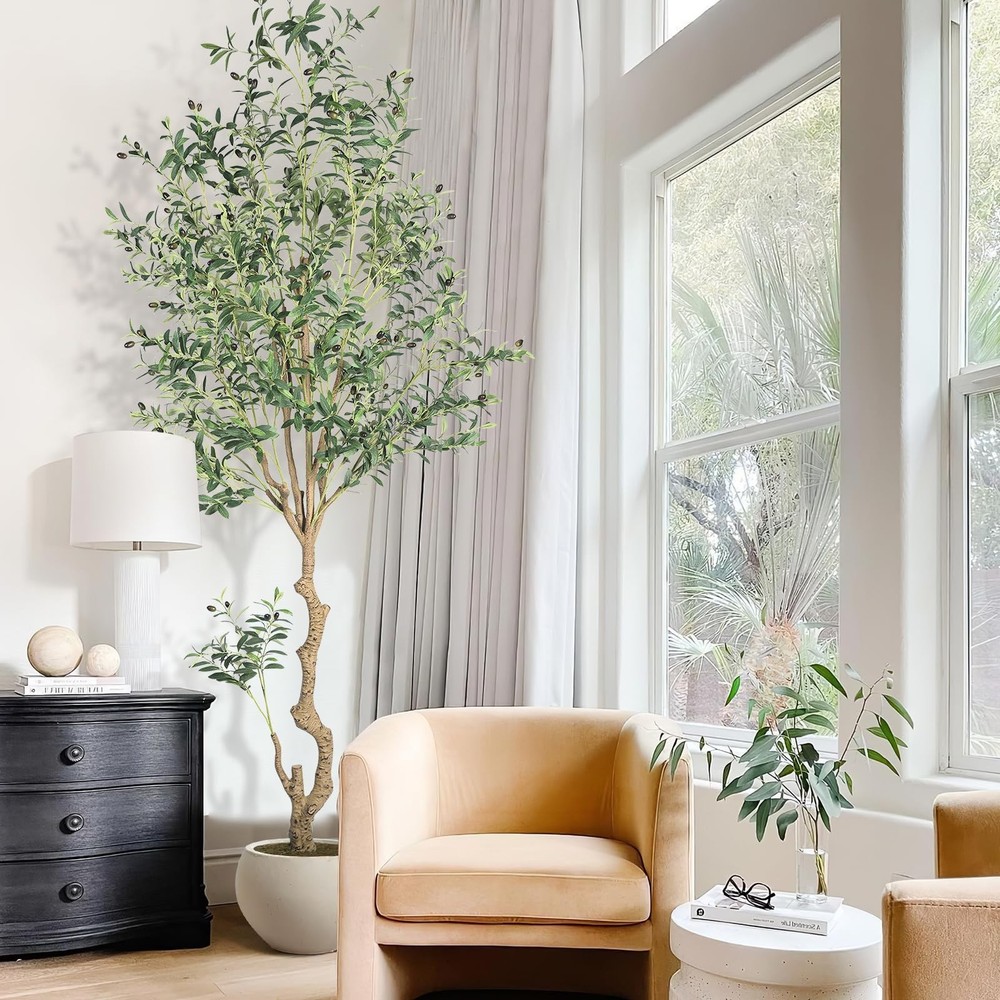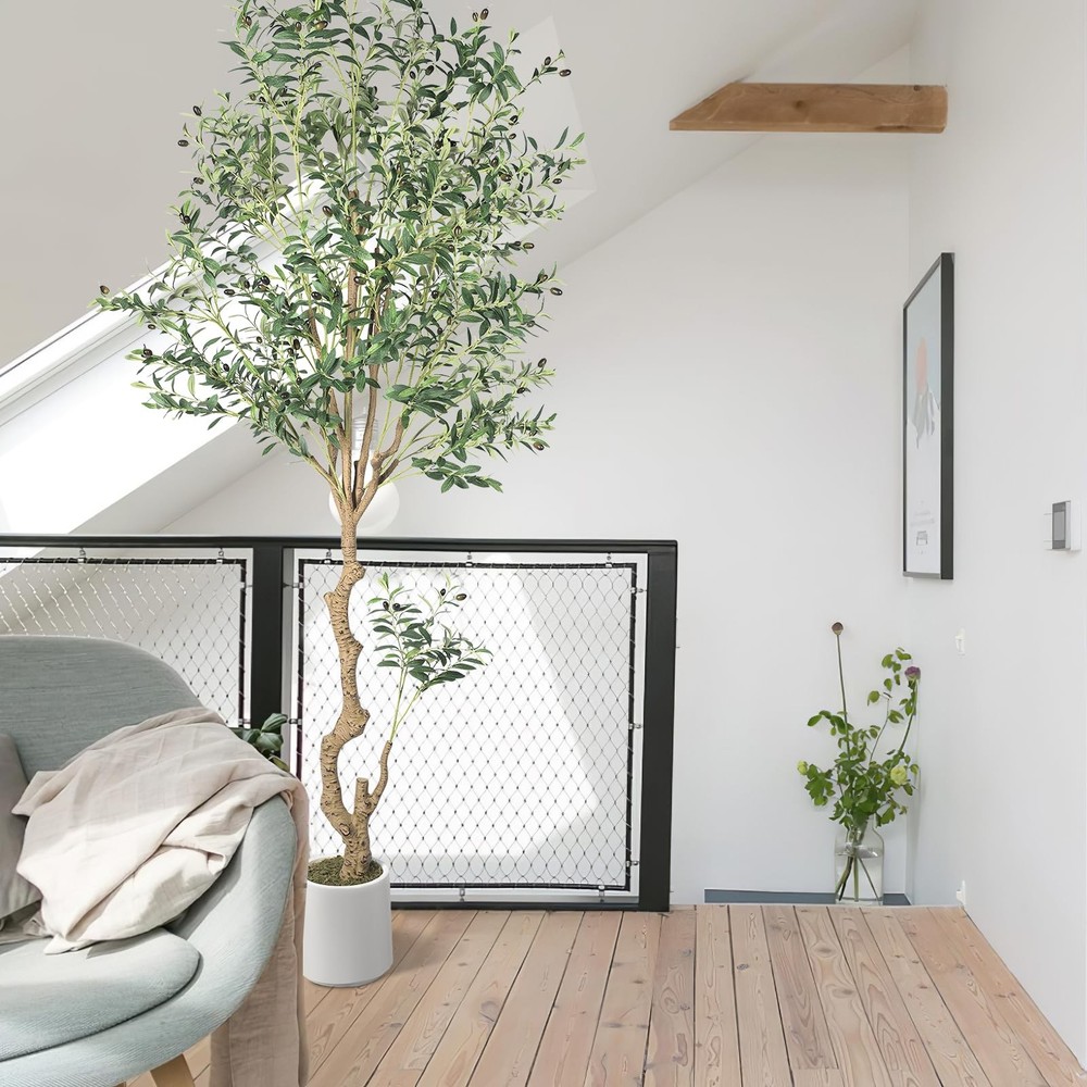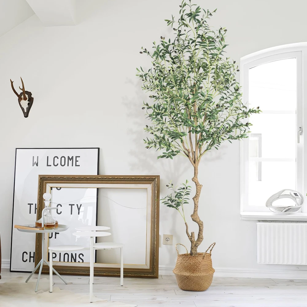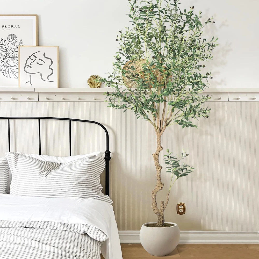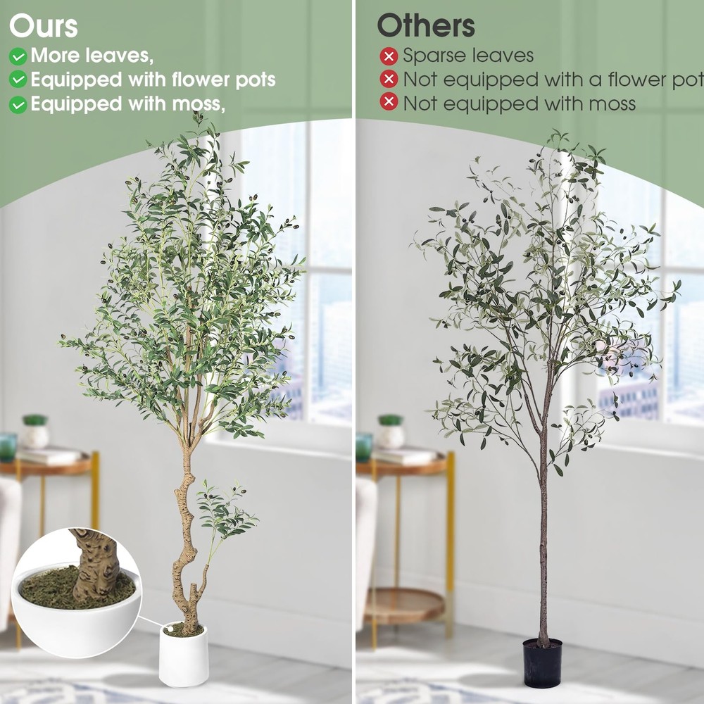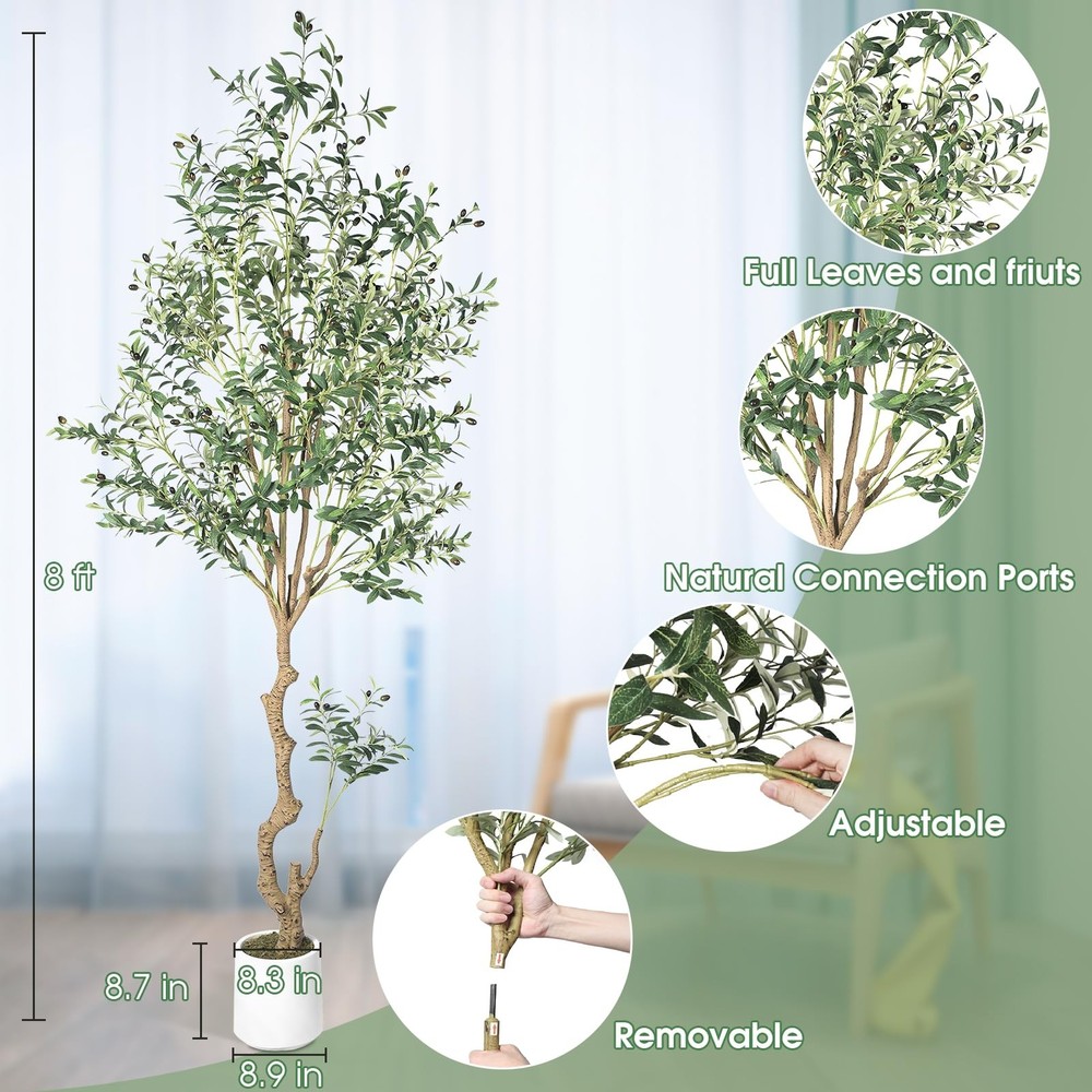 Olive Tree This artificial olive tree is 8ft tall and comes with a 8.66 X 8.86 inch white plastic flower pot and a pack of artificial moss. The olive tree and flowerpot are separable, so you can put the olive tree into any size flowerpot you like. Our artificial olive tree are made of wood trunk,it has rich leaves, and fruits.You can use it to decorate any scene, such as bedroom, living room, kitchen indoor, and is also perfect for bookstores and coffee shops etc Artificial Olive trees bring greenery to any space in the home.It does not require any sort of special care,you don't need to worry about pruning branches and watering, so you can stay green for a long time for you home The artificial olive tree has lush leaves and abundant fruits,it may need to be reshaped when removed from the box.Due to the adjustability of tree branches,you can adjust the branches according to your preferences stands behind all of its products with super customer service. If for any reason you are not satisfied in greenery garland, please don't hesitate to contact our customer service for help.