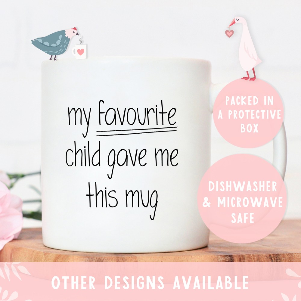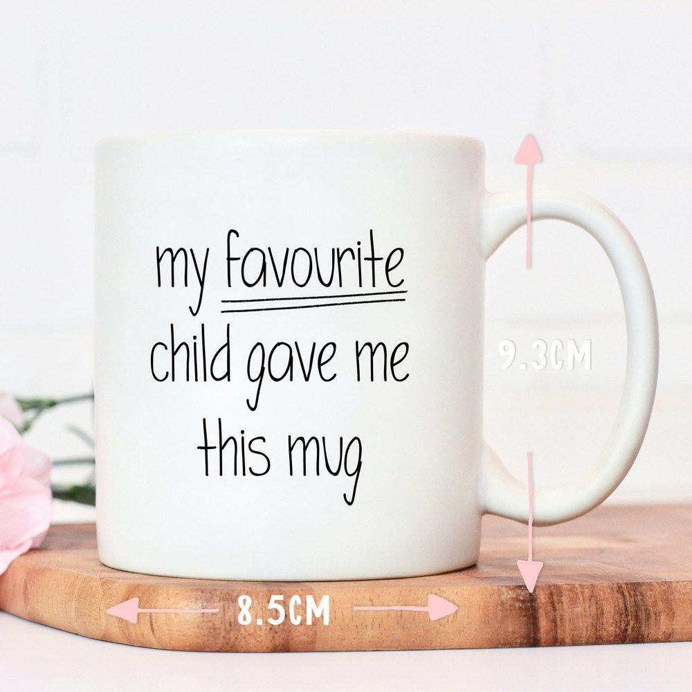 Favourite Child Mug Funny Gift Gift For Mum Mum Gift Gifts For Mum Coffee Mug Product Details.. This high quality 11oz. ceramic white mug has a premium hard coat that provides crisp and vibrant color reproduction sure to last for years. Perfect for all hot & cold beverages. The highest quality printing possible is used. It will never fade no matter how many times you wash it. Material: 100% Ceramic. Print both sides. Dishwasher and Microwave Safe. High Gloss + Premium White Finish. Printed in the U.S.A. Personalized & Custom. We support personalized and custom mug to add custom, when placing an order, you can add notes to the "order note" in shipping address section. Also you can contact us directly via message. Shipping Info. Ready to ship in 1 to 2 business days, All products are made-to-order and proudly printed in the United States. Shipped by USPS and DHL, You will receive your order in 5-7 days. Replace & Refund. All products are defective during shipping broken, chipped will be replaced free of charge. You are not satisfied with the product, we will refund 100% money to you. If any other issues arise, please do not hesitate to message, we would be more than happy to assist you.
