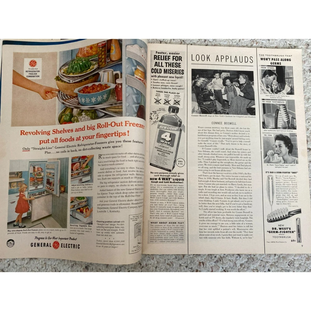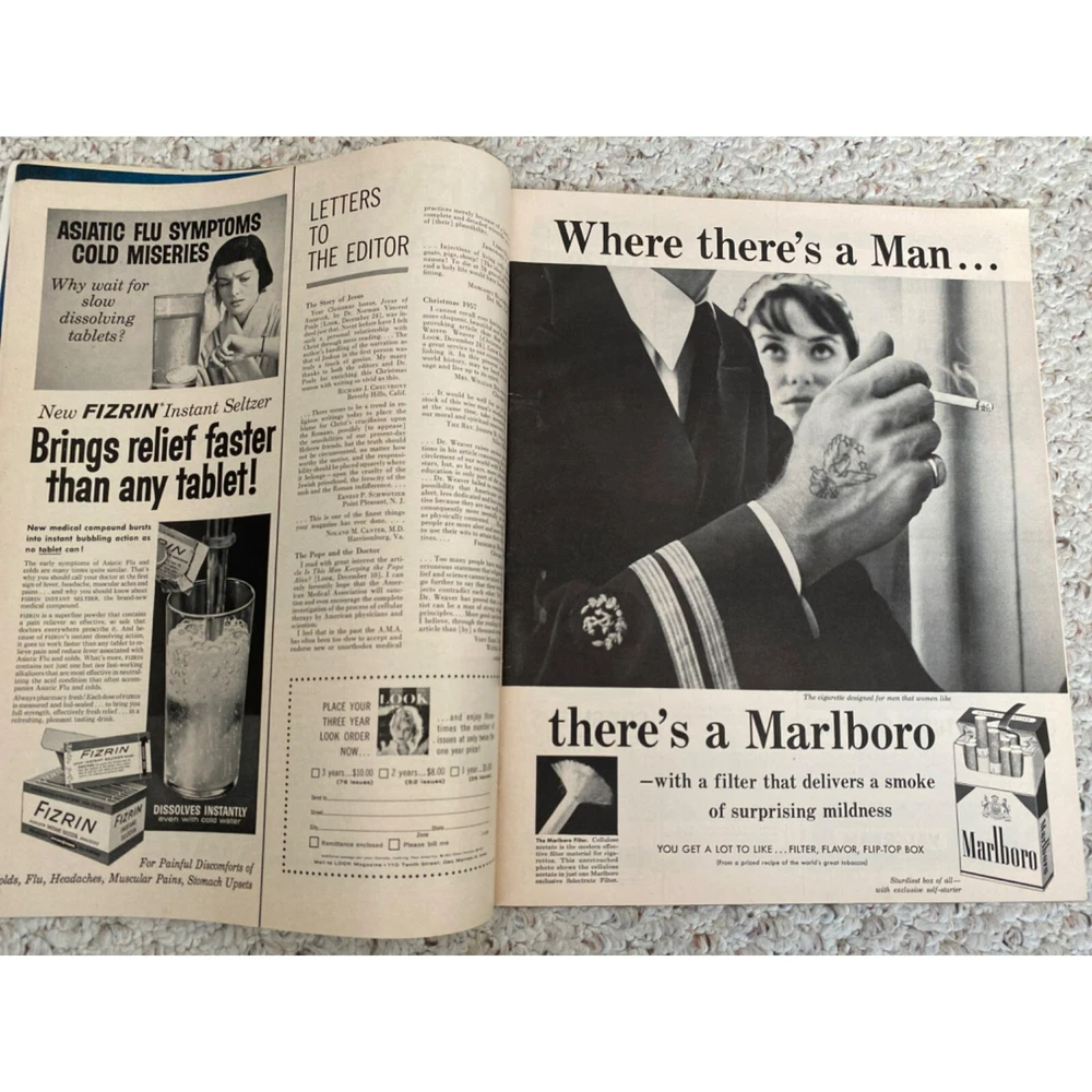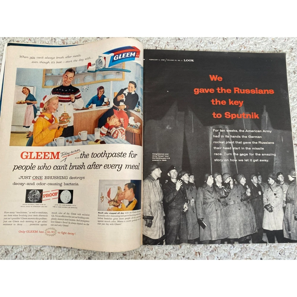 February 4, 1958 LOOK Magazine Hollywoods Hidden Beauties How Women Dominate Men How we gave the Russians the keys to Sputnik This came from my father in laws home. He just passed and I am going through some of his things. This is in very good condition considering it's age. This is in very good condition considering it's age. There is some light wear and spotting. Please see photos. There is a slight musty odor from being stored I love the old photos and ads. Nice piece of History.