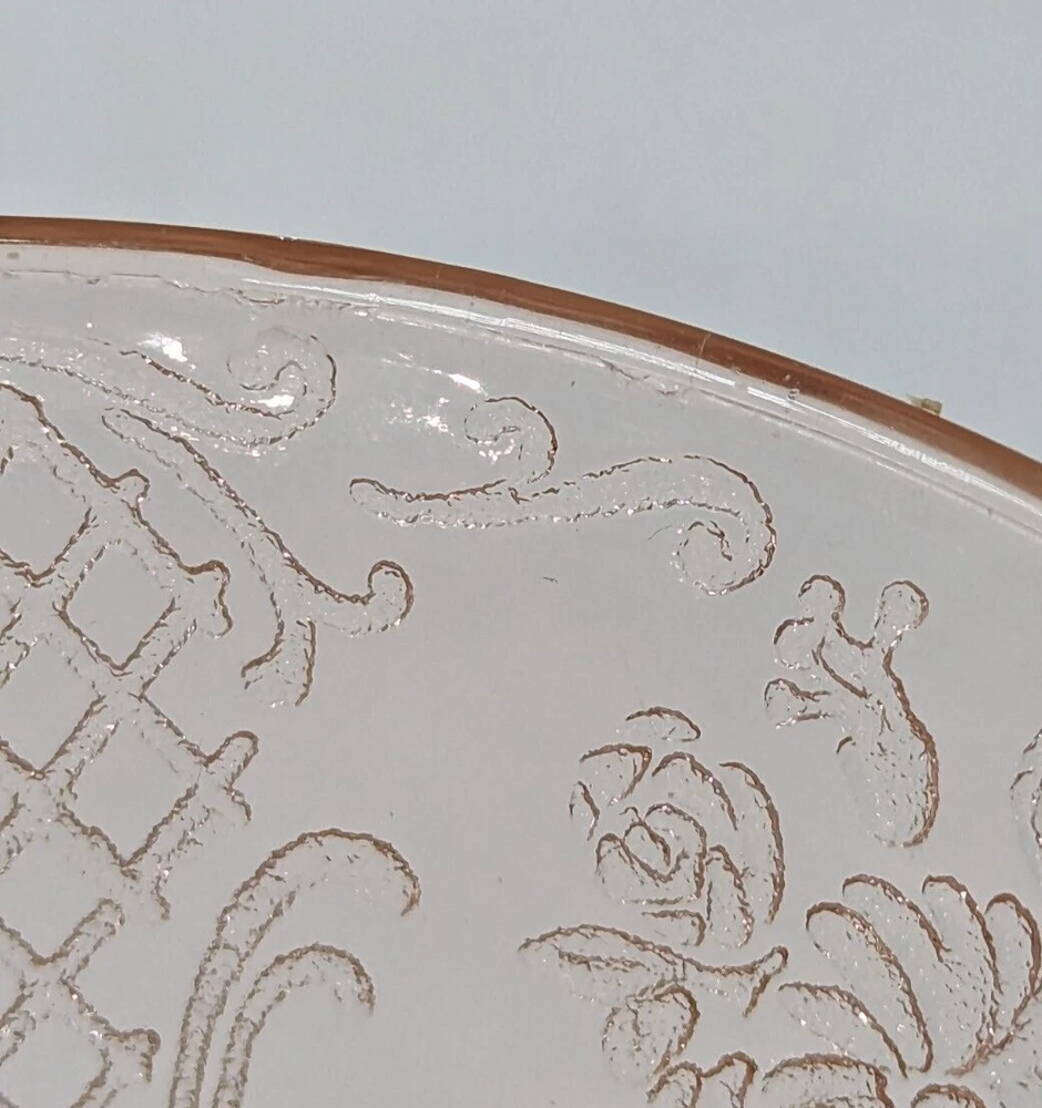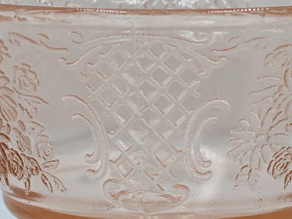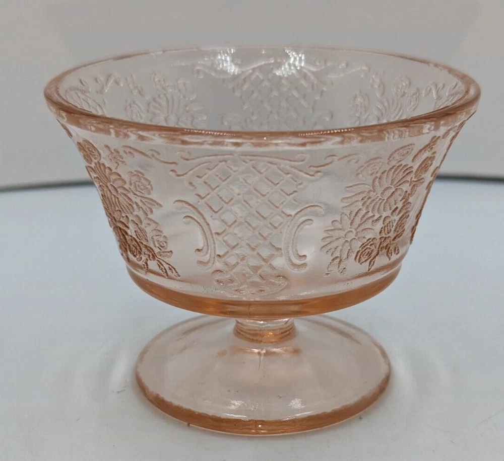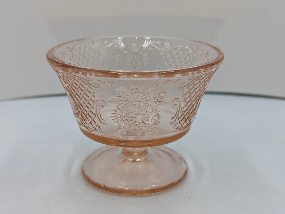 Federal Glass Normandie Pink Glass Bouquet & Lattice Footed Sherbet Dessert Cup. No cracks or breaks. There are some flea bites around the top - please see the last 3 close-up photos for reference. All of my items are carefully packed for shipping, no matter their value - $5 items are wrapped with the same care as a $200 item. My goal is to have your purchase arrive safely. I use recycled packaging when possible but mostly use new, high quality products so your item will arrive intact without damage. Large, heavy and fragile items are harder to use combined shipping with but just ask if you would like to purchase more than one item and I am more than happy to do so if feasible. If not, maybe we can work out a shipping discount. Thank you and hopefully you will visit my store again!