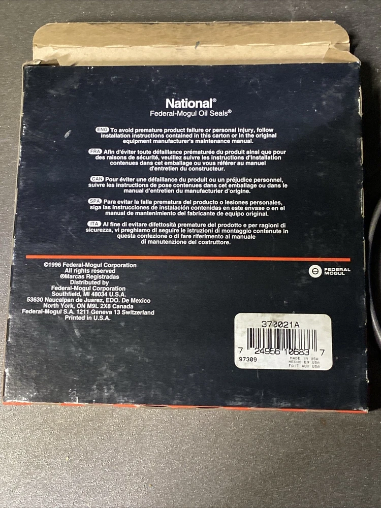 NOS National Federal Mogul Seal #370021A Number on seal B370021BG1 Box is dirty and has shelf wear. Came from old stock from a truck shop. You may receive same seal in a slightly different box Bin C1