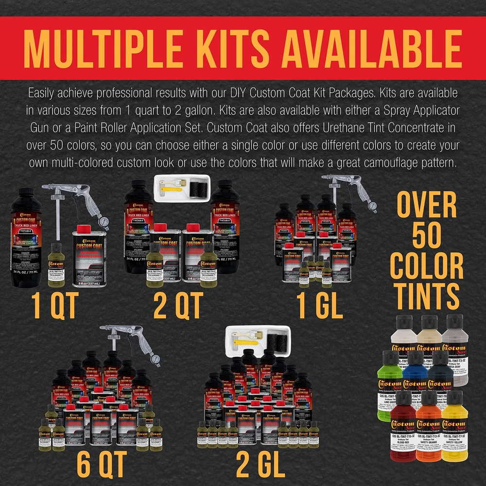 Professional Custom Coat Roll-On, Brush-On or Spray-On Truck Bed Liner 1 Quart Kit. Custom Tintable Color Kit Includes: 1 - 21 fl. oz. Cans of Tintable Truck Bed Liner Base, 1 - 8 fl. oz. Cans Custom Coat Standard Hardener and 1 - 3 fl. oz. Bottles of Basecoat Color Tint, and 1 Custom Coat 7 Piece Paint Roller Applicator Kit with 2 Rollers, Frame, 2 Brushes and Coating Tray with Liner. Estimated coverage is 110 to 130 square feet @ 10 mils wet film thickness. Custom Coat Truck Bed Liner is a premium durable long lasting textured protective coating that can tolerate extreme climatic temperature conditions. It is heat, UV resistant and waterproof, so it protects coated surfaces from rust. Use it to help dampen sounds and vibrations. Custom Coat was developed to provide a great looking durable yet flexible textured surface and is a heavy duty 2 part urethane coating that is easy to apply. It provides the ultimate surface protection for almost any application. Unlike other protective and bed liner coatings Custom Coat is a flexible material that will resist chipping, while providing impact protection and abrasion resistance. These features and benefits make it perfect for its most popular application as a truck bed liner. Custom Coat is a very versatile product that can be used for endless amount of applications. Use it on truck beds, entire vehicle exteriors, chassis, bumpers, commercial vehicles, equipment and trailers. It's also great for home uses as non-skid coating for floors including garage floors, concrete, wood, steps, walkways, wood decks, docks, bath tubs, basement floors, walls, tool boxes and engine compartments. Easily achieve professional results with our DIY Custom Coat Kit Packages. Kits are available in various sizes from 1 quart to 2 gallon. Kits are also available with either a Spray Applicator Gun or a Paint Roller Application Set. Custom Coat also offers Urethane Tint Concentrate in over 50 colors, so you can choose either a single color or use different colors to create your own multi-colored custom look or use the colors that will make a great camouflage pattern.